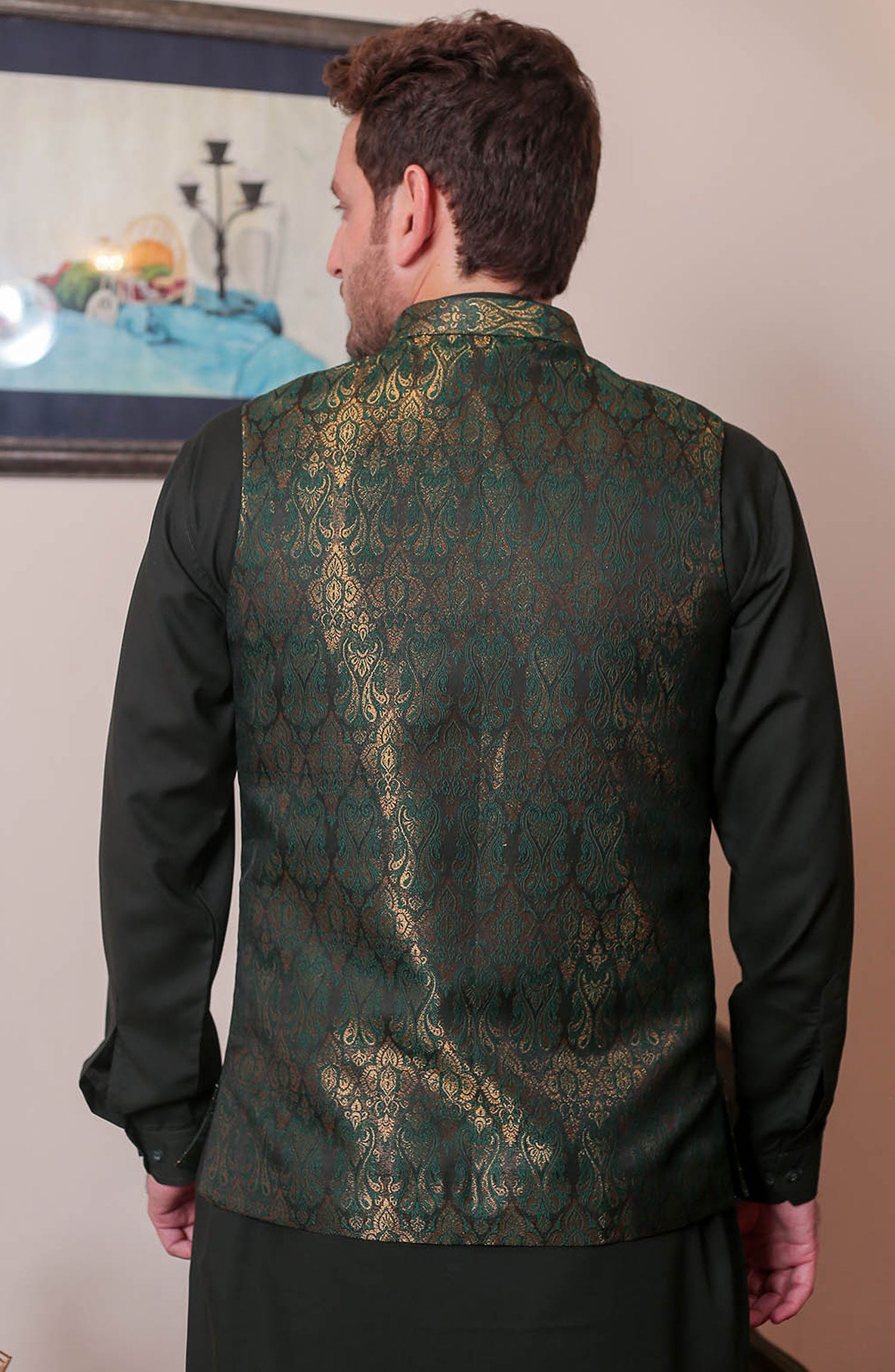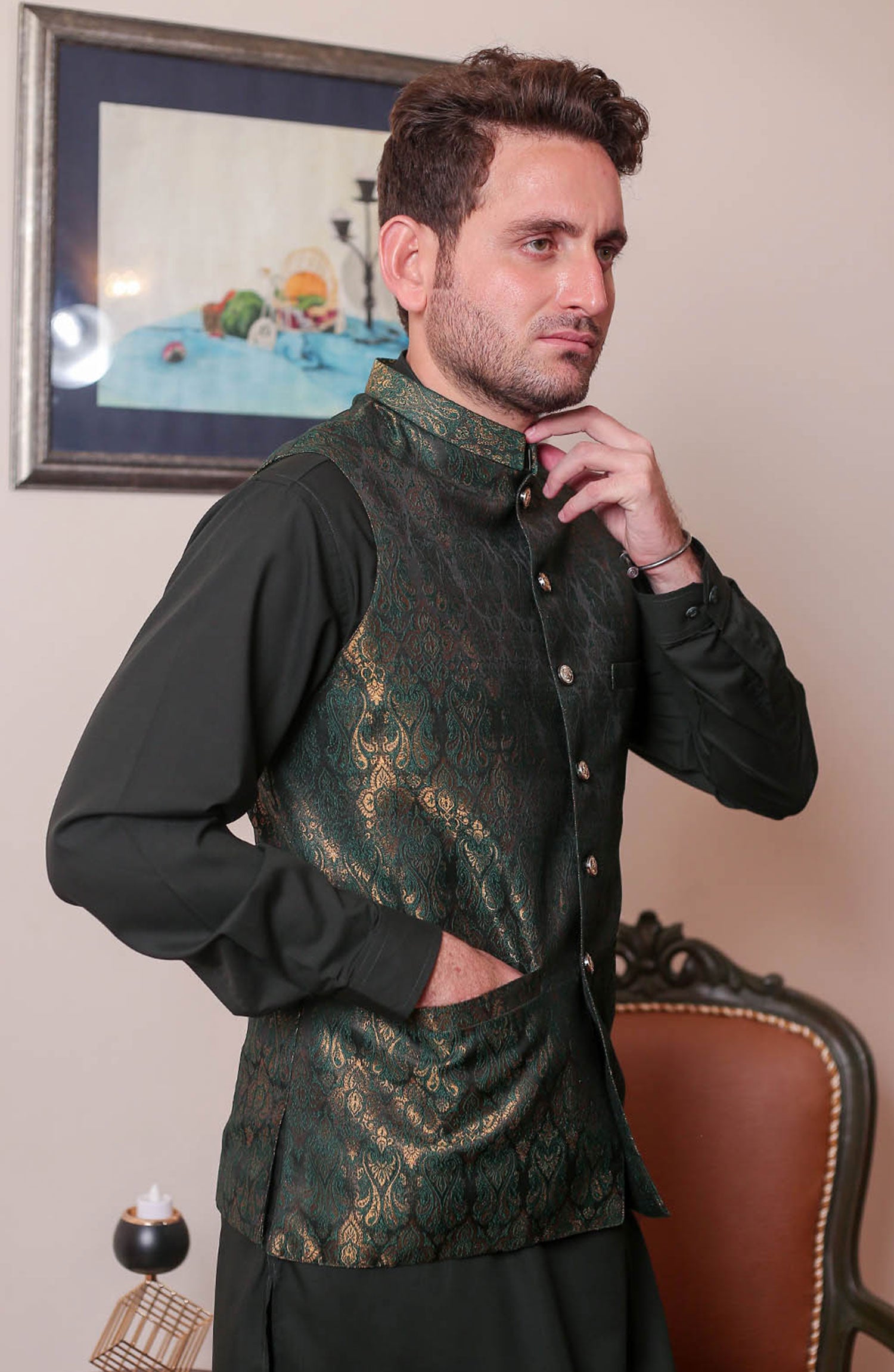 Formal Style Waist Coat for Men , Elegently Designed Jamawar Fabric in Green Colour with Zari Weaving ,Special For festive and wedding wear