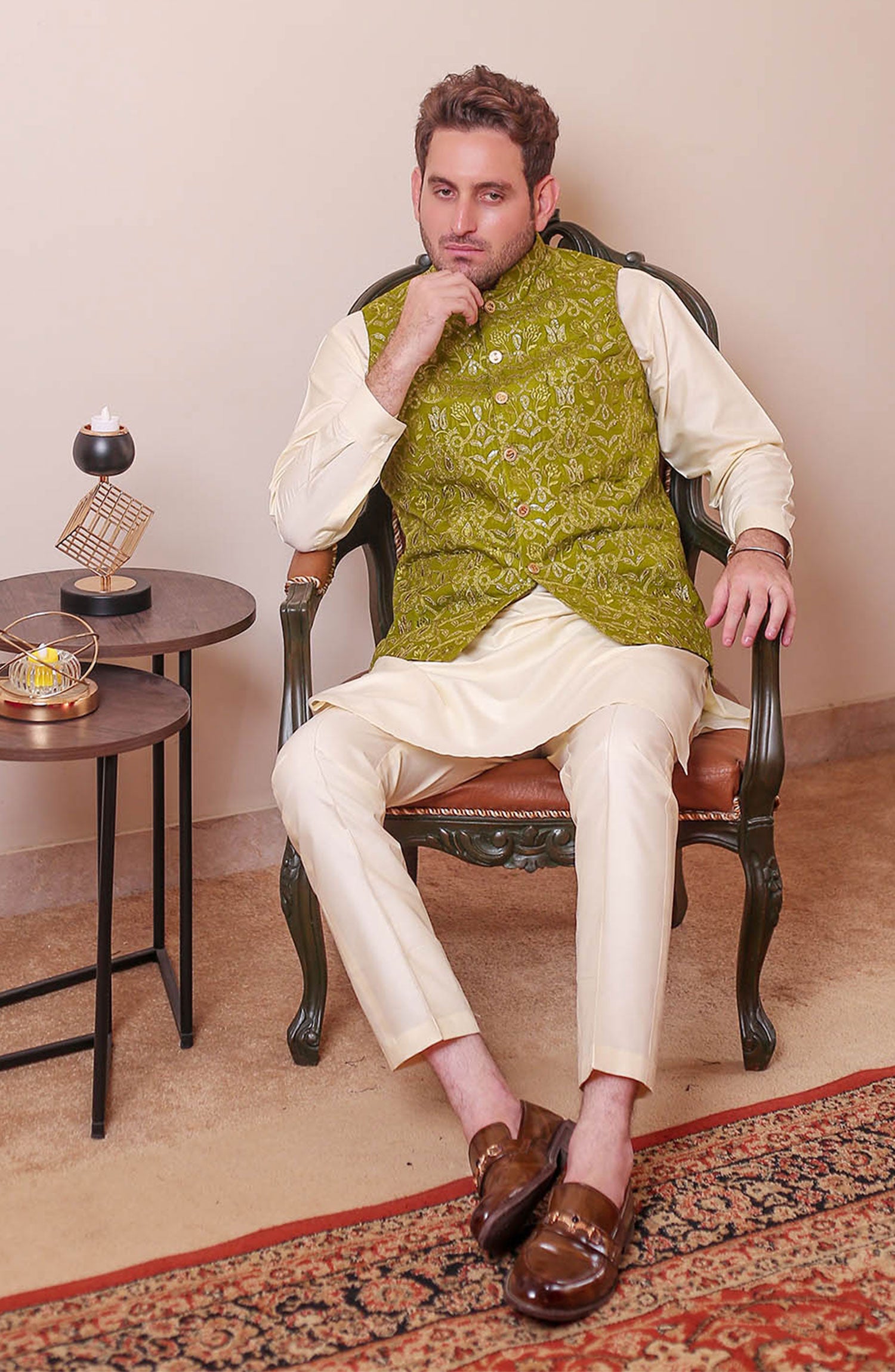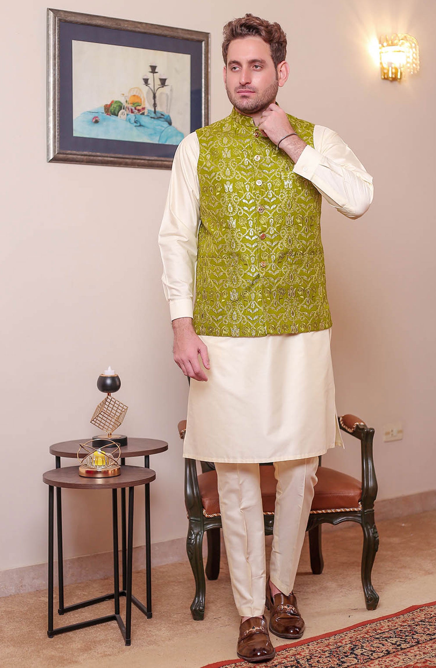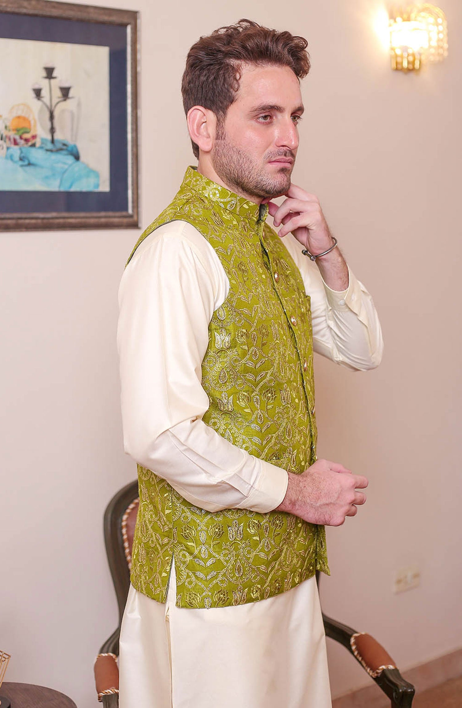 Formal Style Waist Coat for Men , Elegently Designed Jamawar Fabric in Green Colour with Zari Weaving and Rich Embriodrey ,Special For festive and wedding wear