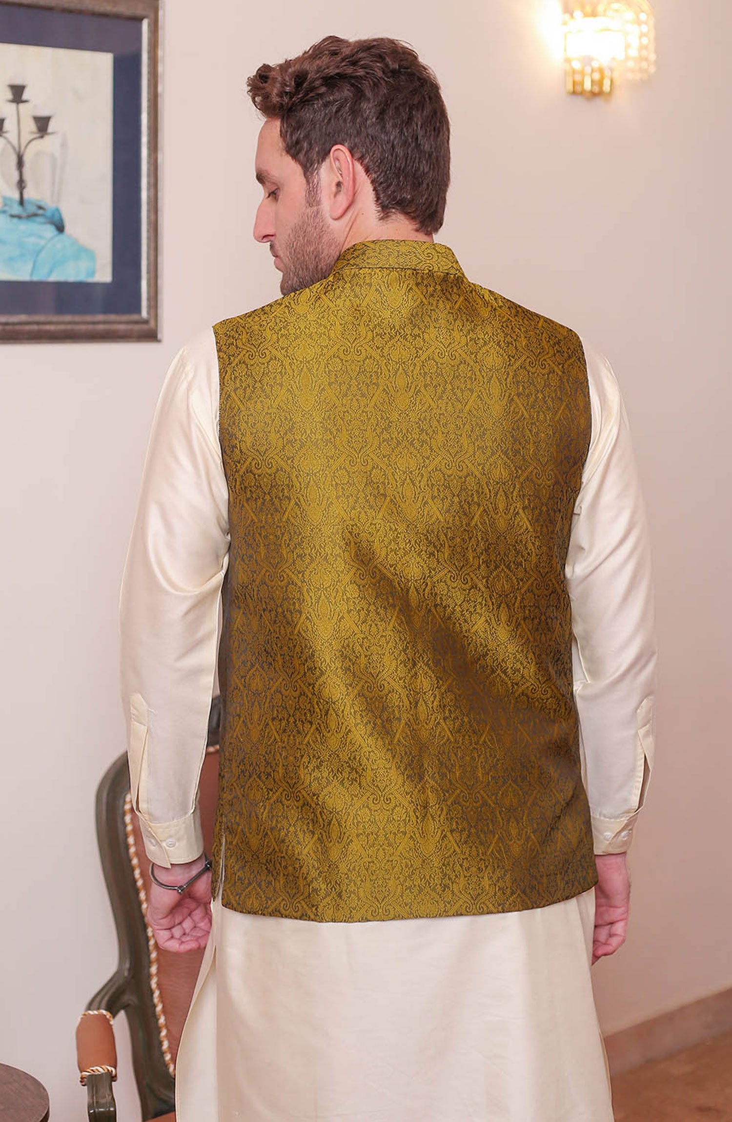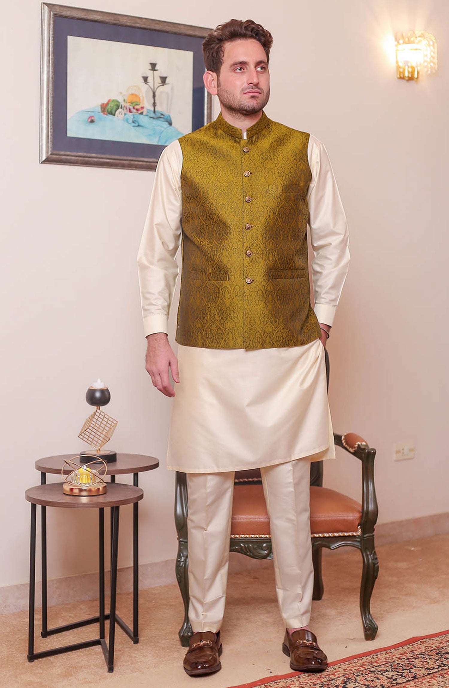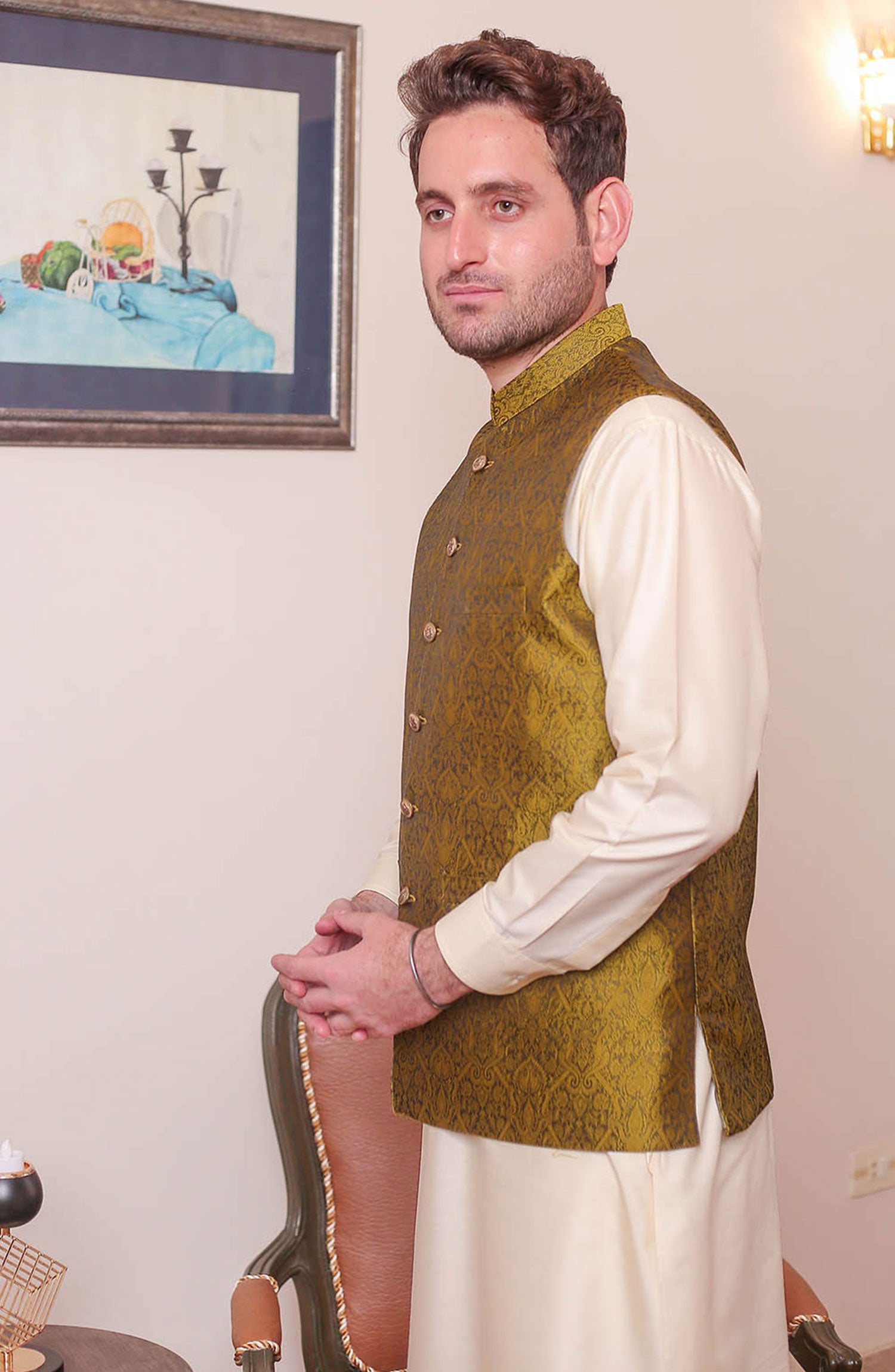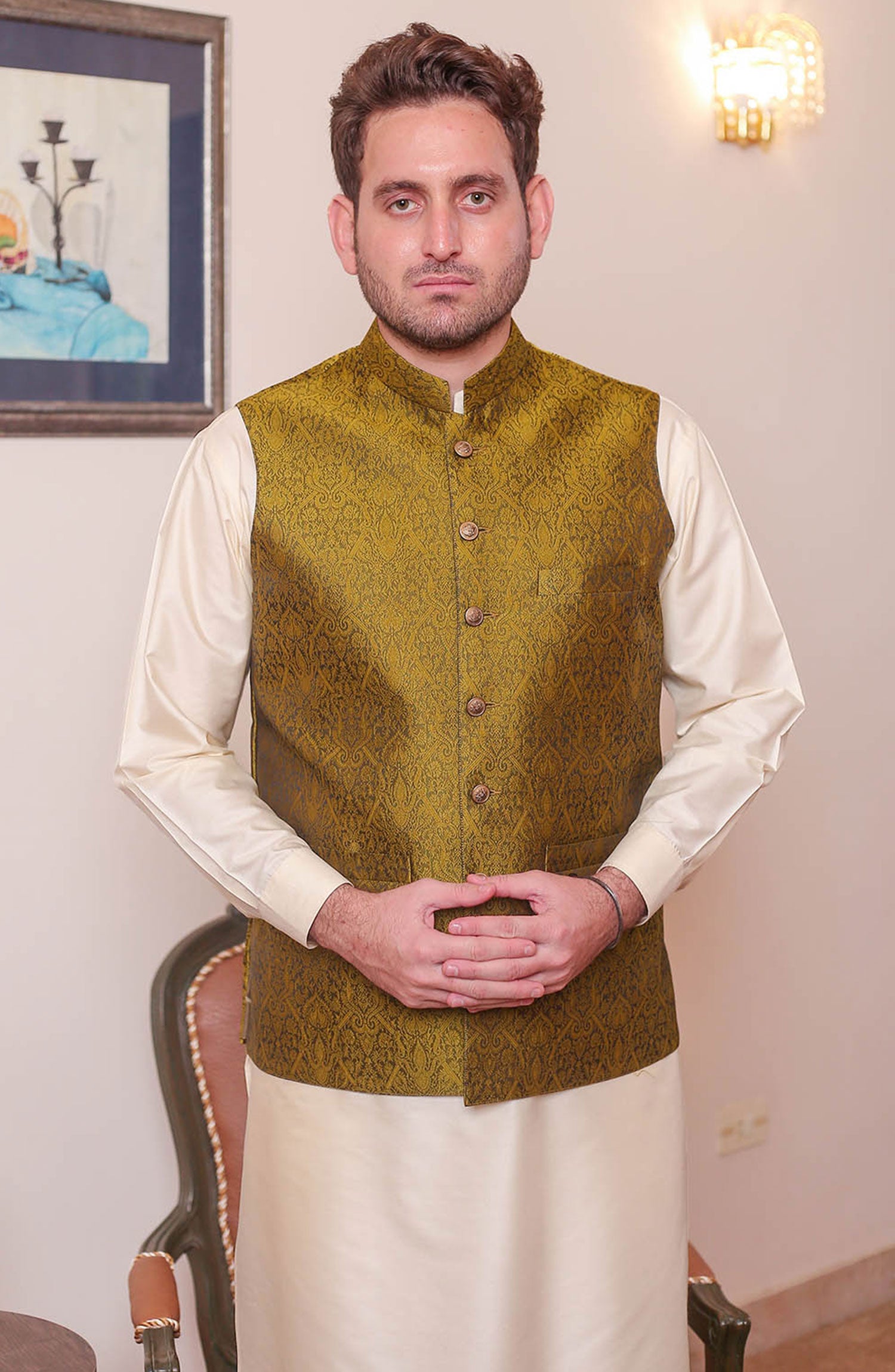 Formal Style Waist Coat for Men , Elegently Designed Jamawar Fabric in Olive Colour ,Special For festive and wedding wear