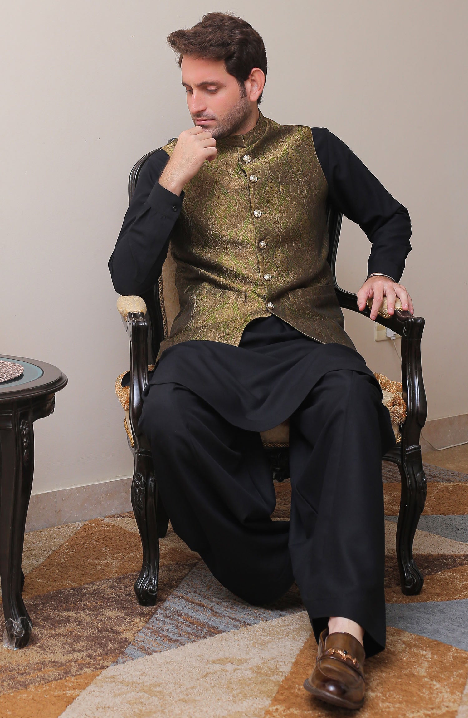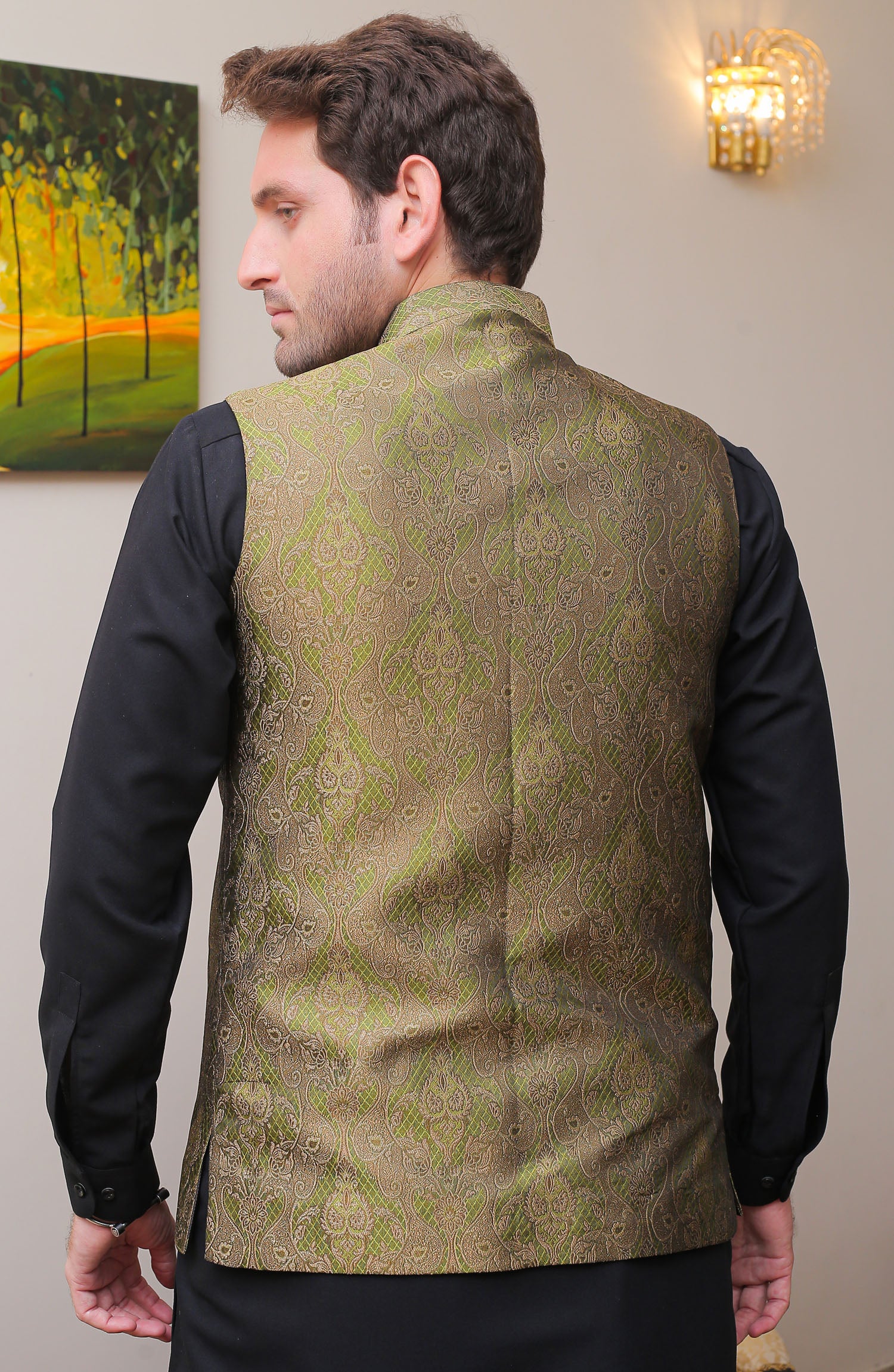 Formal Style Waist Coat for Men , Jamawar Silk Fabric , With Rich Geomatric Weaved Designed Along With Thread Work and Brown Zari Contrast , Special for Festive And Wedding Wear