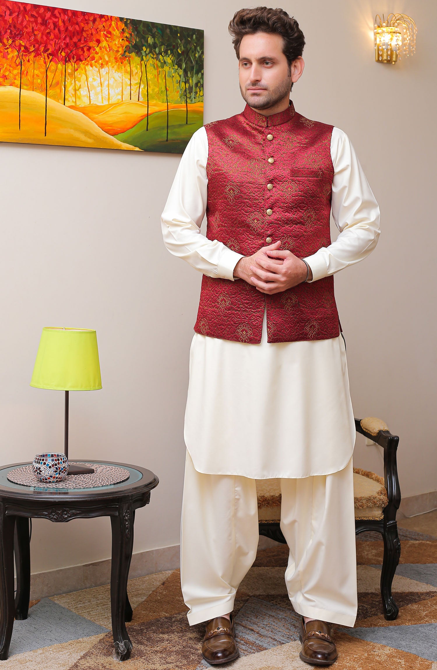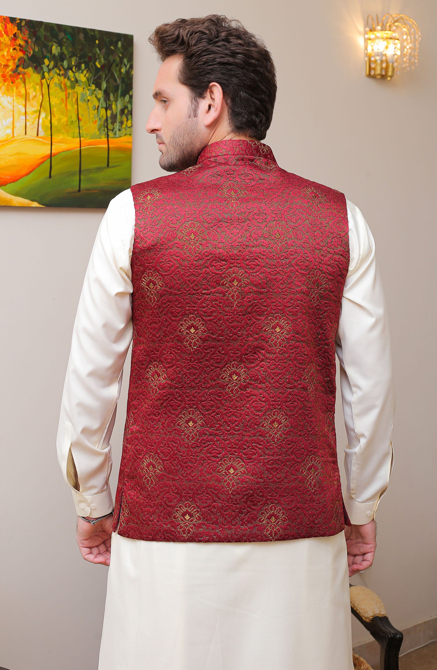 Formal Style Waist Coat for Men , Masoori Fabric with Rich Weaved Design Along With Maroon Thread Work Contrast Brown Zari , Special for Festive And Wedding Wear