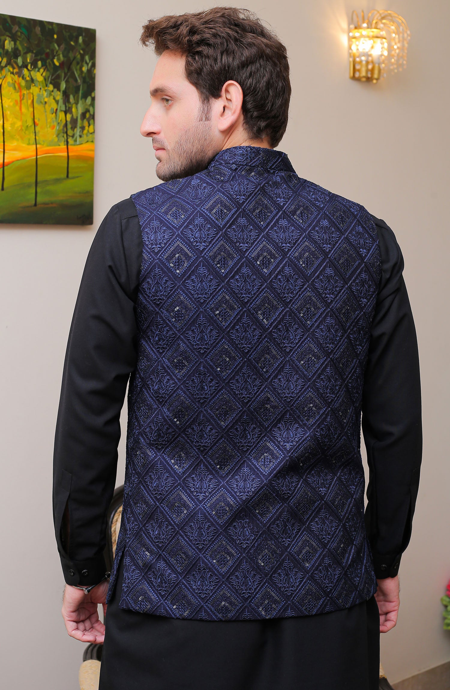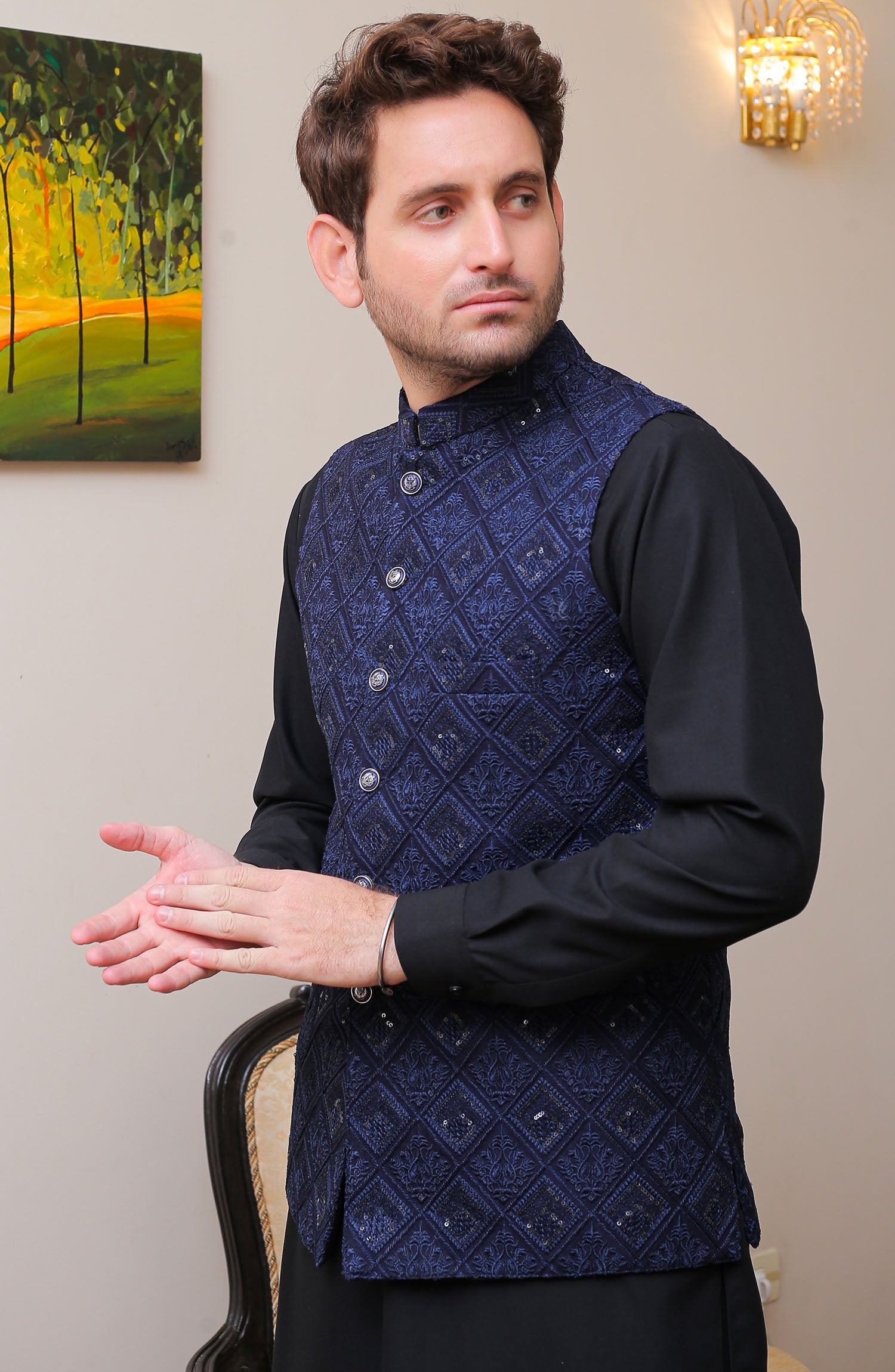 Formal Style Waist Coat for Men , Raw Silk Fabric , With Rich Embriodrey Design in Thread Work and Sequnce in Matt Black Colour , Special for Festive And Wedding Wear
