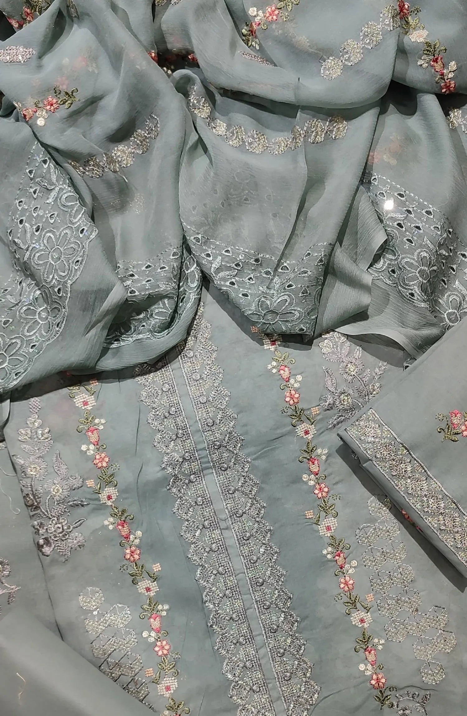 Reena Unstitched Luxury Embroidered Swiss Collection 2024 has been styled in the image for photography and illustrative purposes.