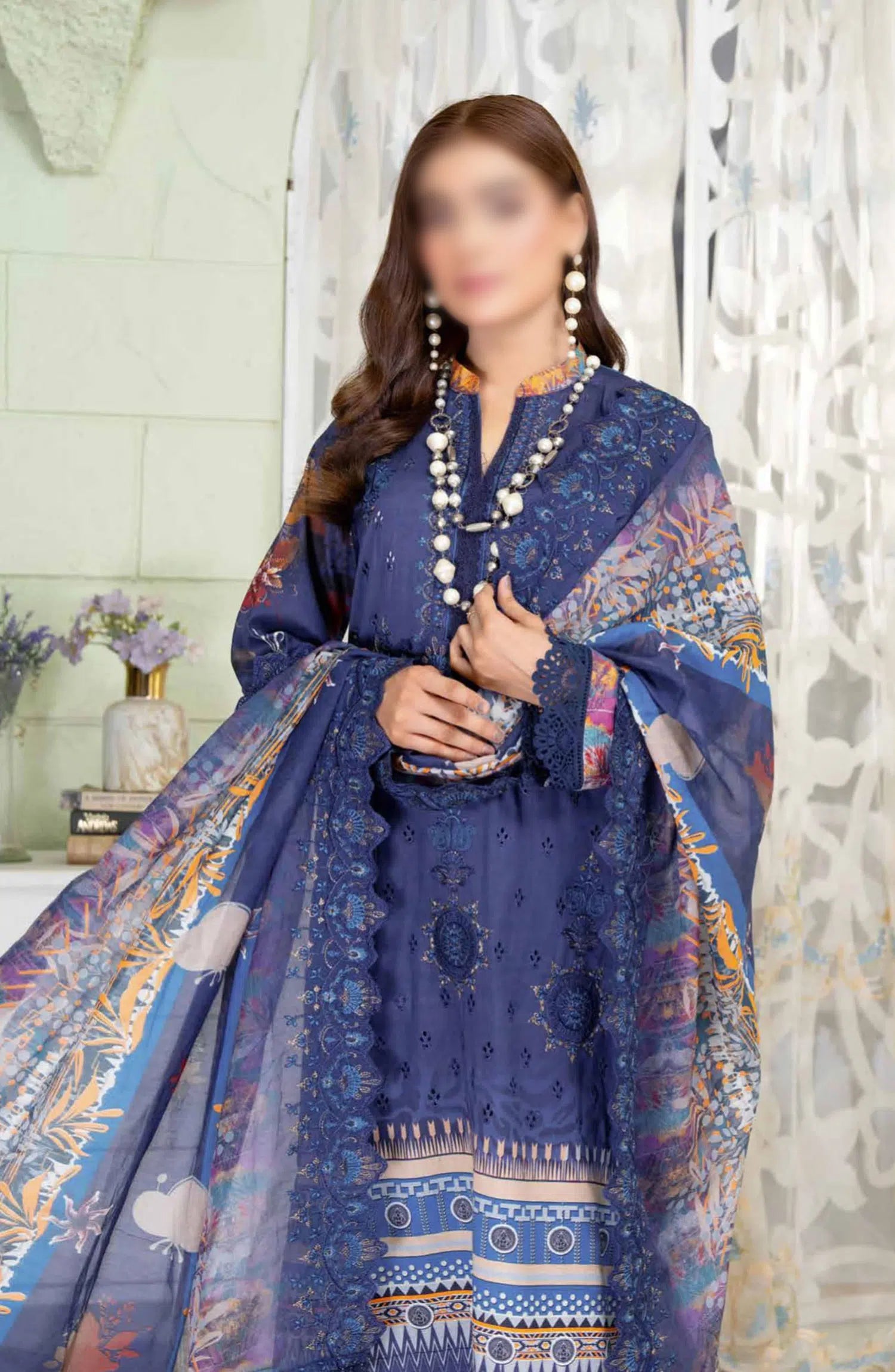 Reet Riwaj Digital Print and Embroidered Collection By Riaz Arts has been styled in the image for photography and illustrative purposes.
