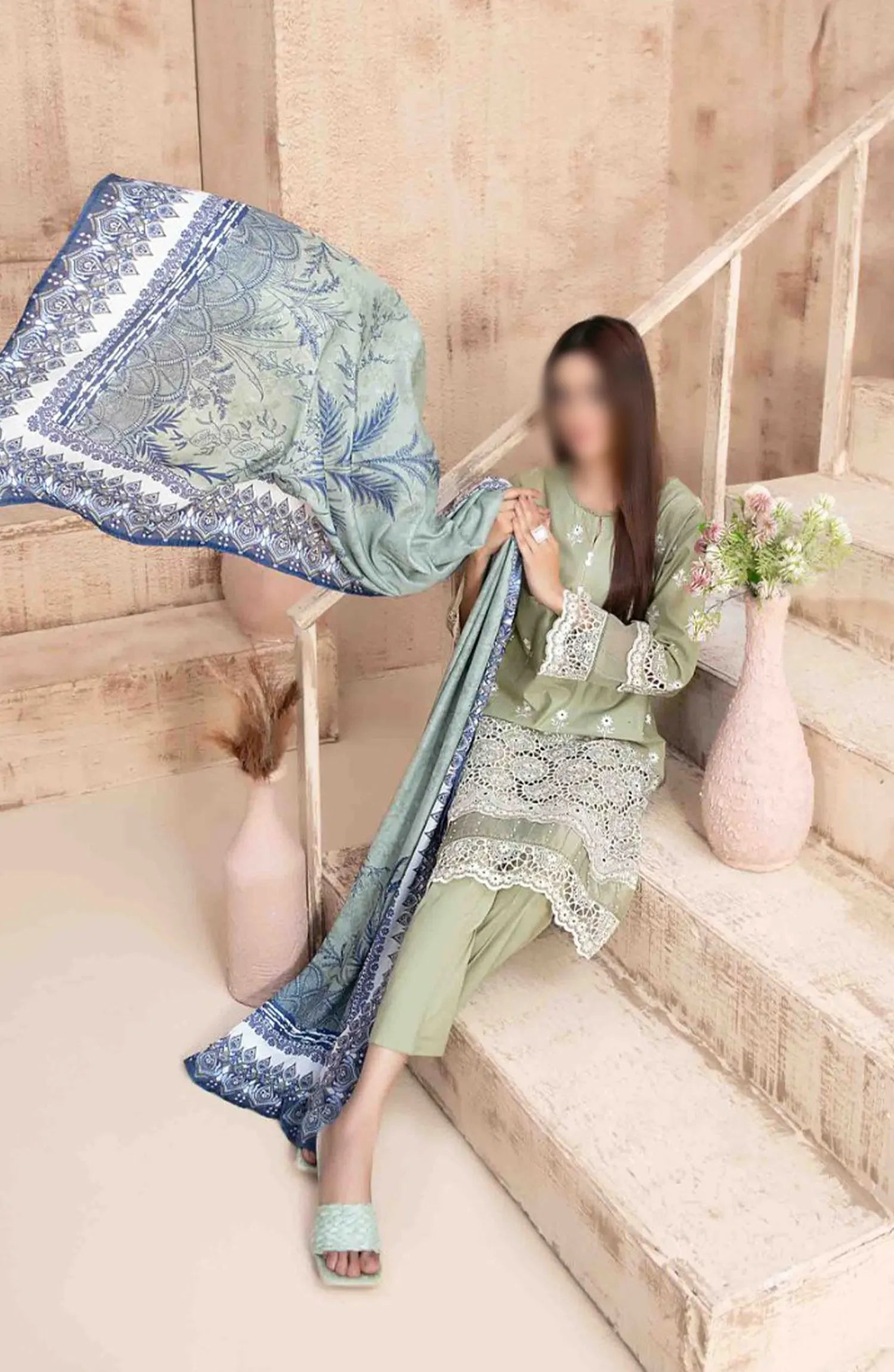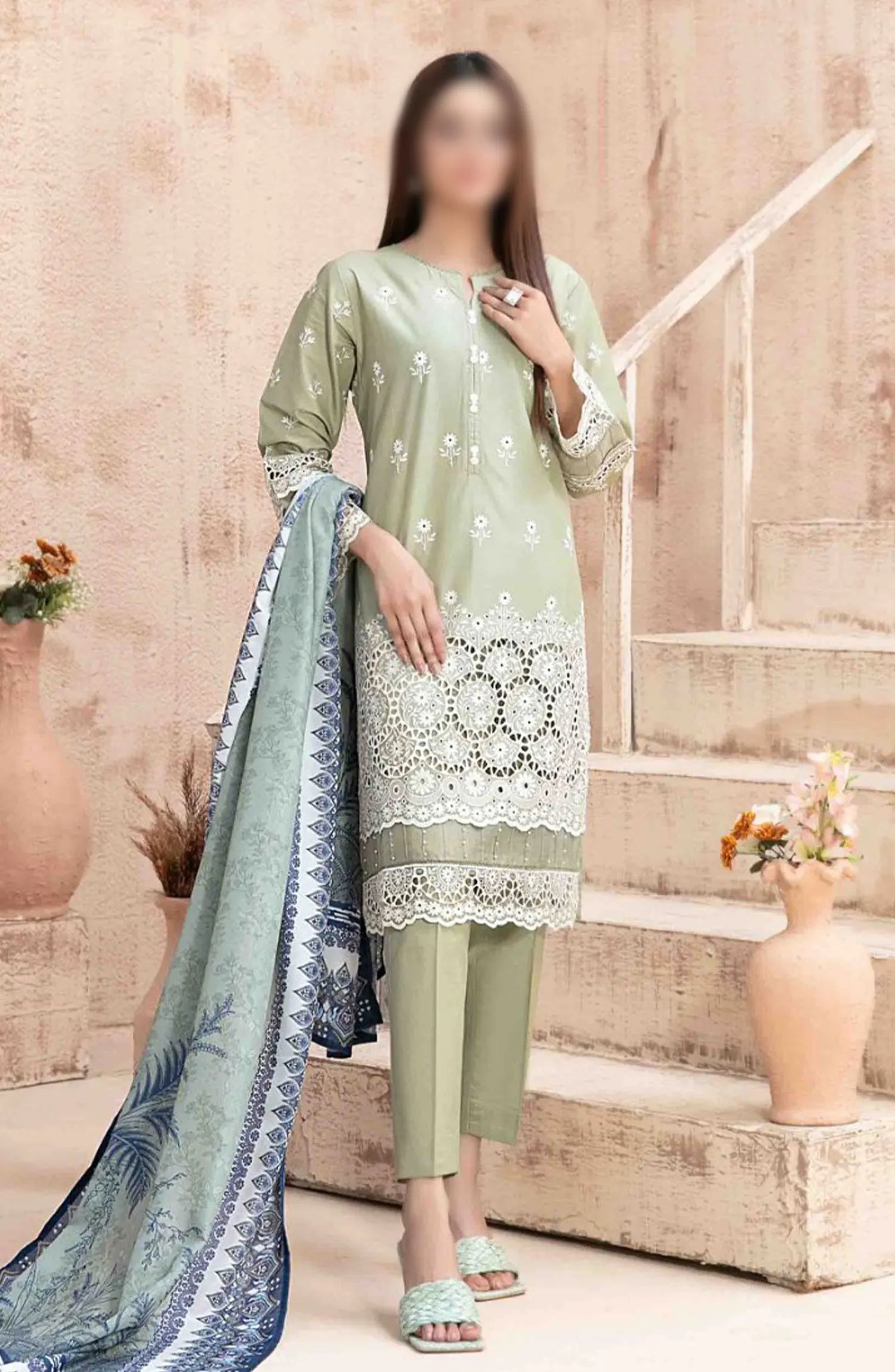 Ria - Stitched Schiffli Lawn Collection 2024 has been styled in the image for photography and illustrative purposes.