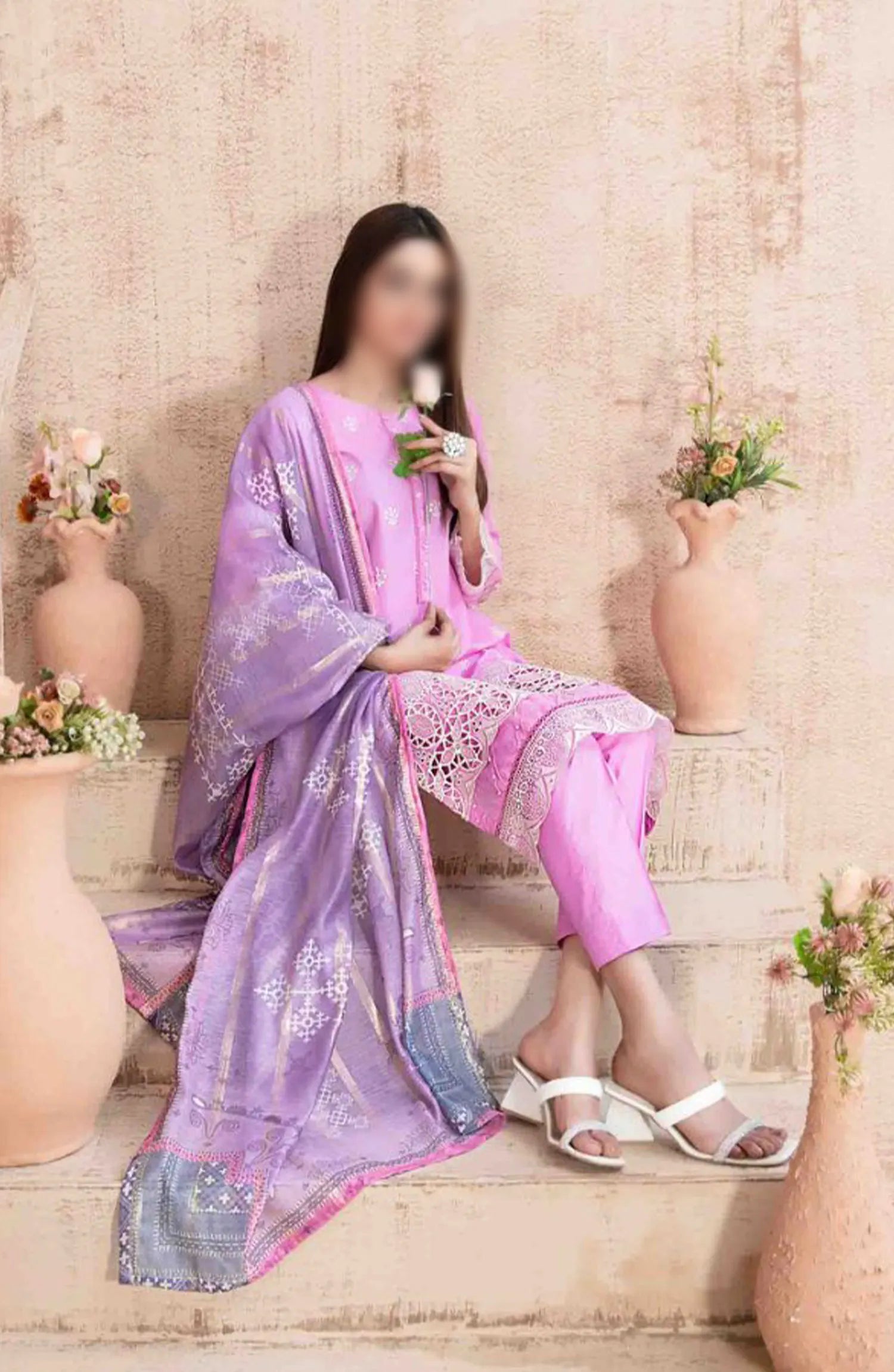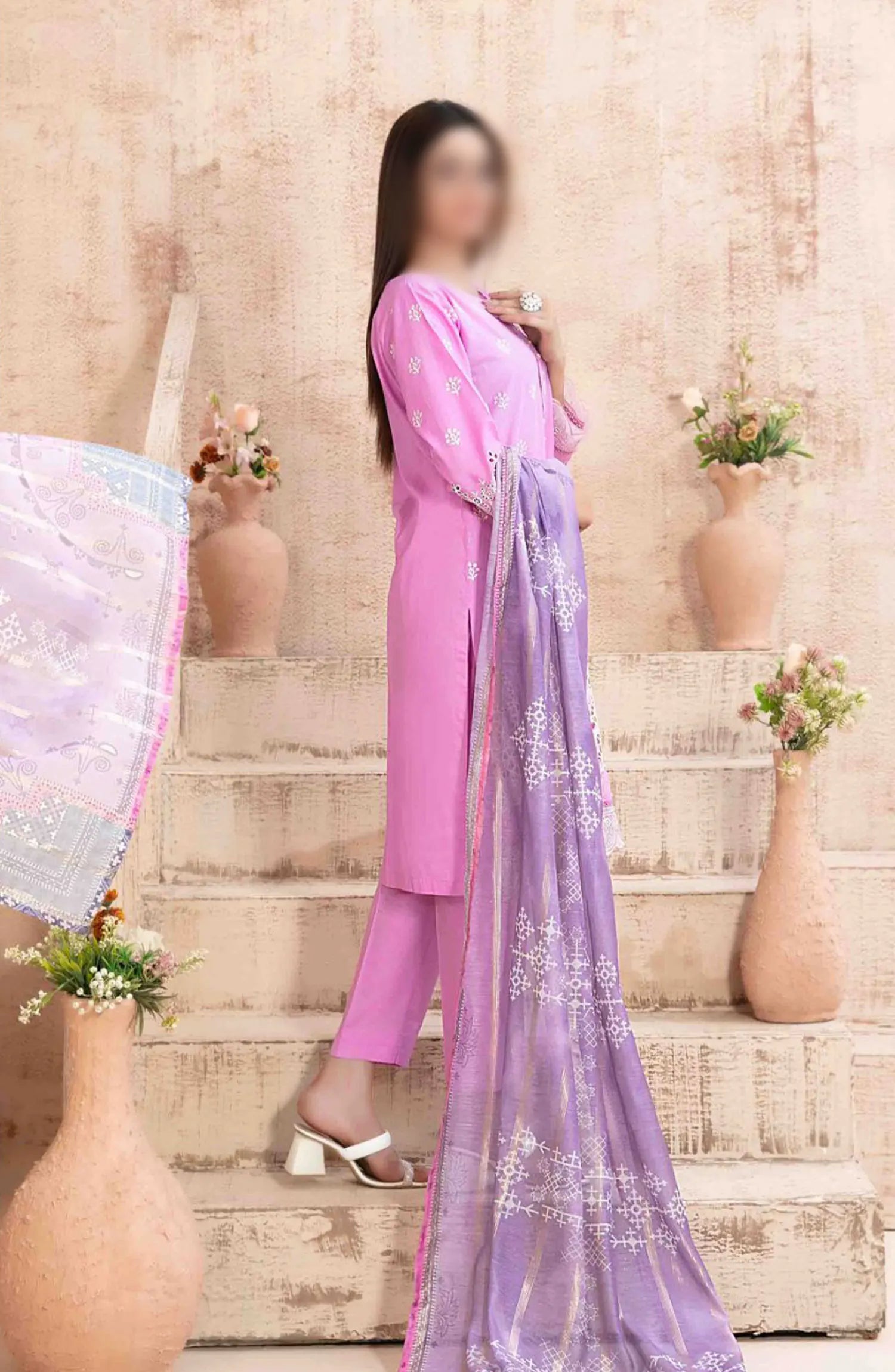 Ria - Stitched Schiffli Lawn Collection 2024 has been styled in the image for photography and illustrative purposes.