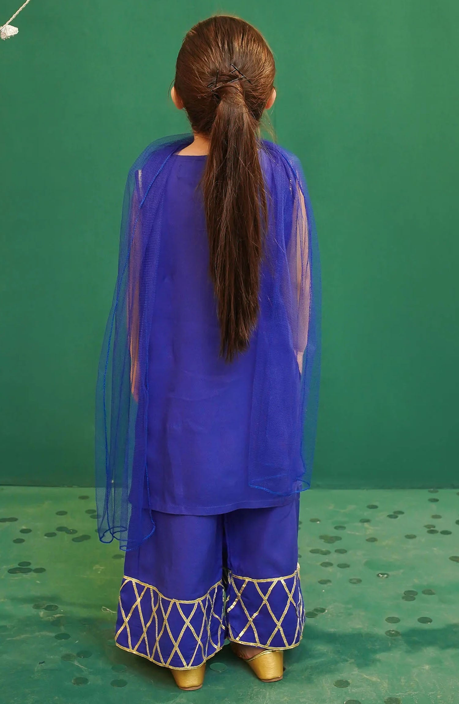 Bottom: Royal Blue Rod Silk Flared Dhakka Pants With Gota Laces