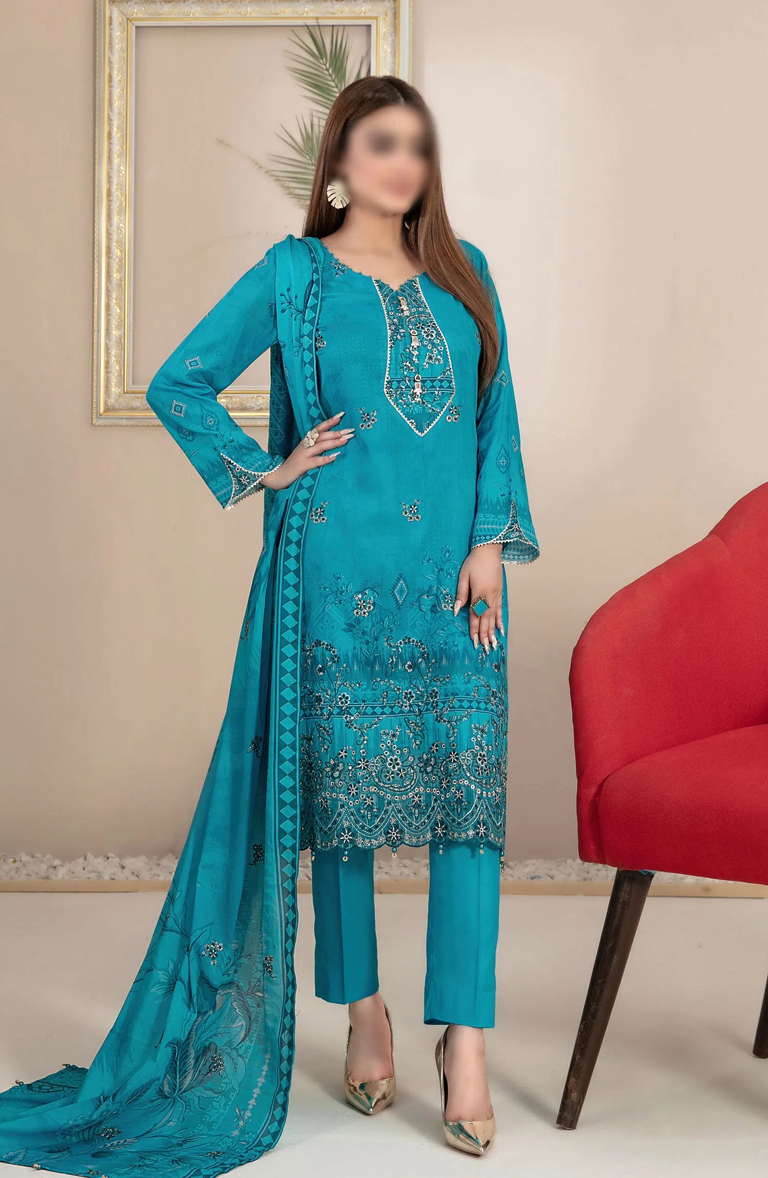 Rua by Casual Lite Embroidered Premium Linen Stitched 3 Piece Suit - D-07 Teal Mirage - CL25RU - Teal - Winter Collection