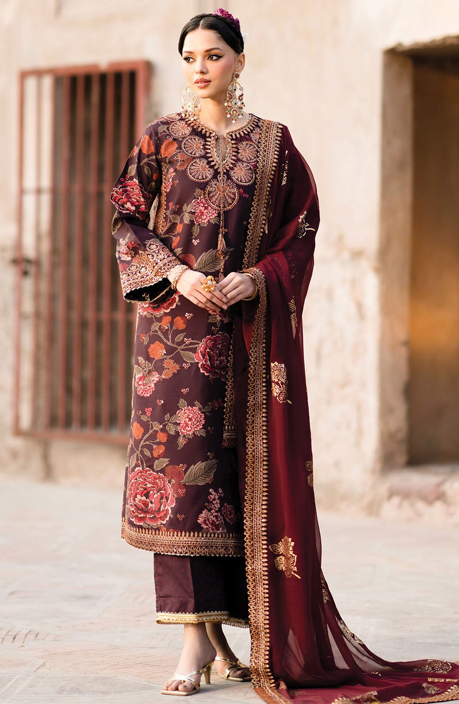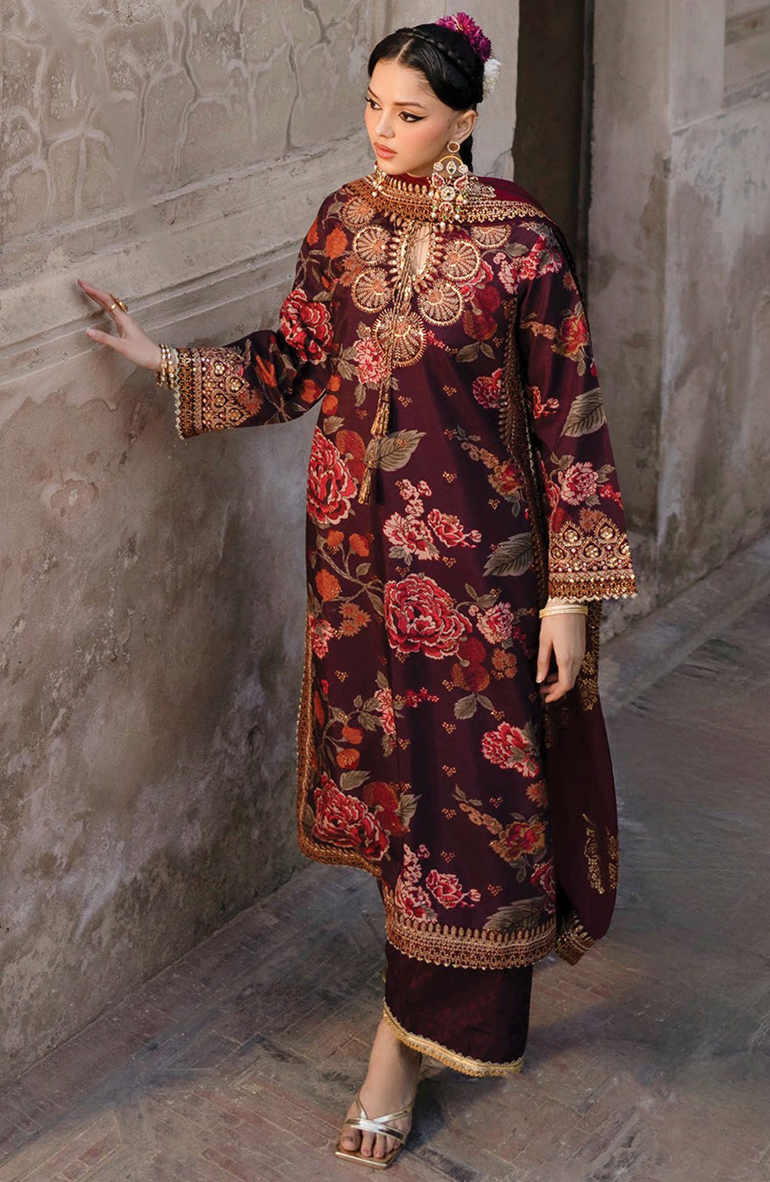 Embroidered Raw Silk 3 Piece Suit Fareedan