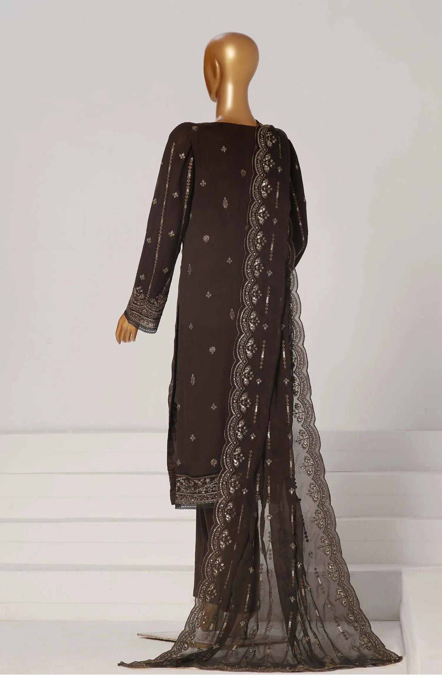 The standard style comes as a long-sleeved kameez with dupatta and trouser/shawlar.