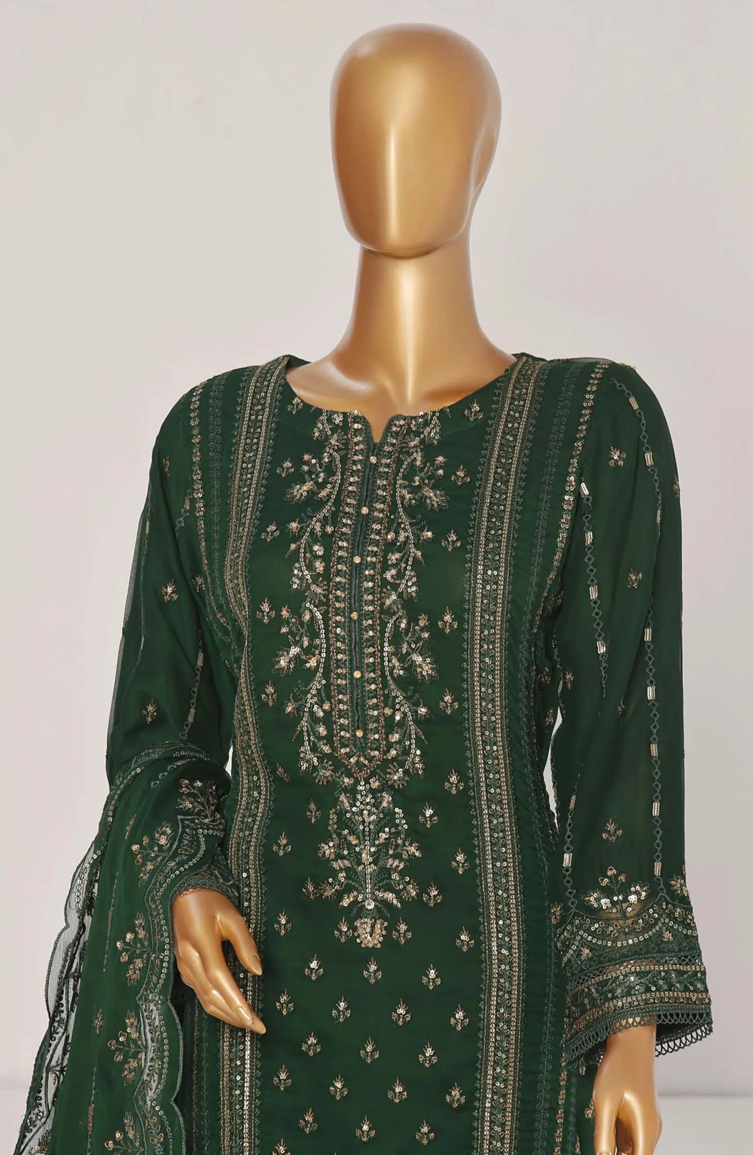 The standard style comes as a long-sleeved kameez with dupatta and trouser/shawlar.