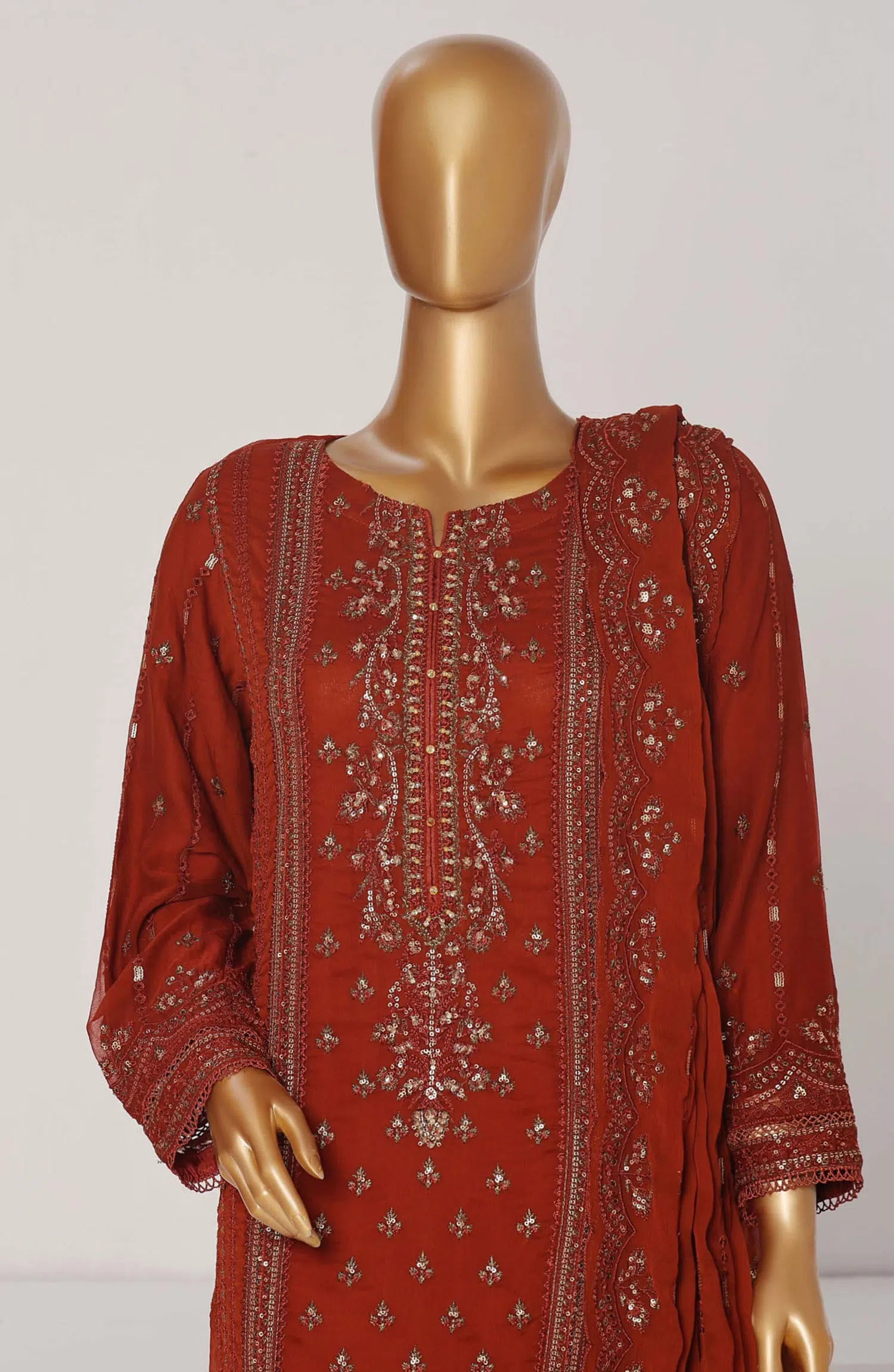 The standard style comes as a long-sleeved kameez with dupatta and trouser/shawlar.