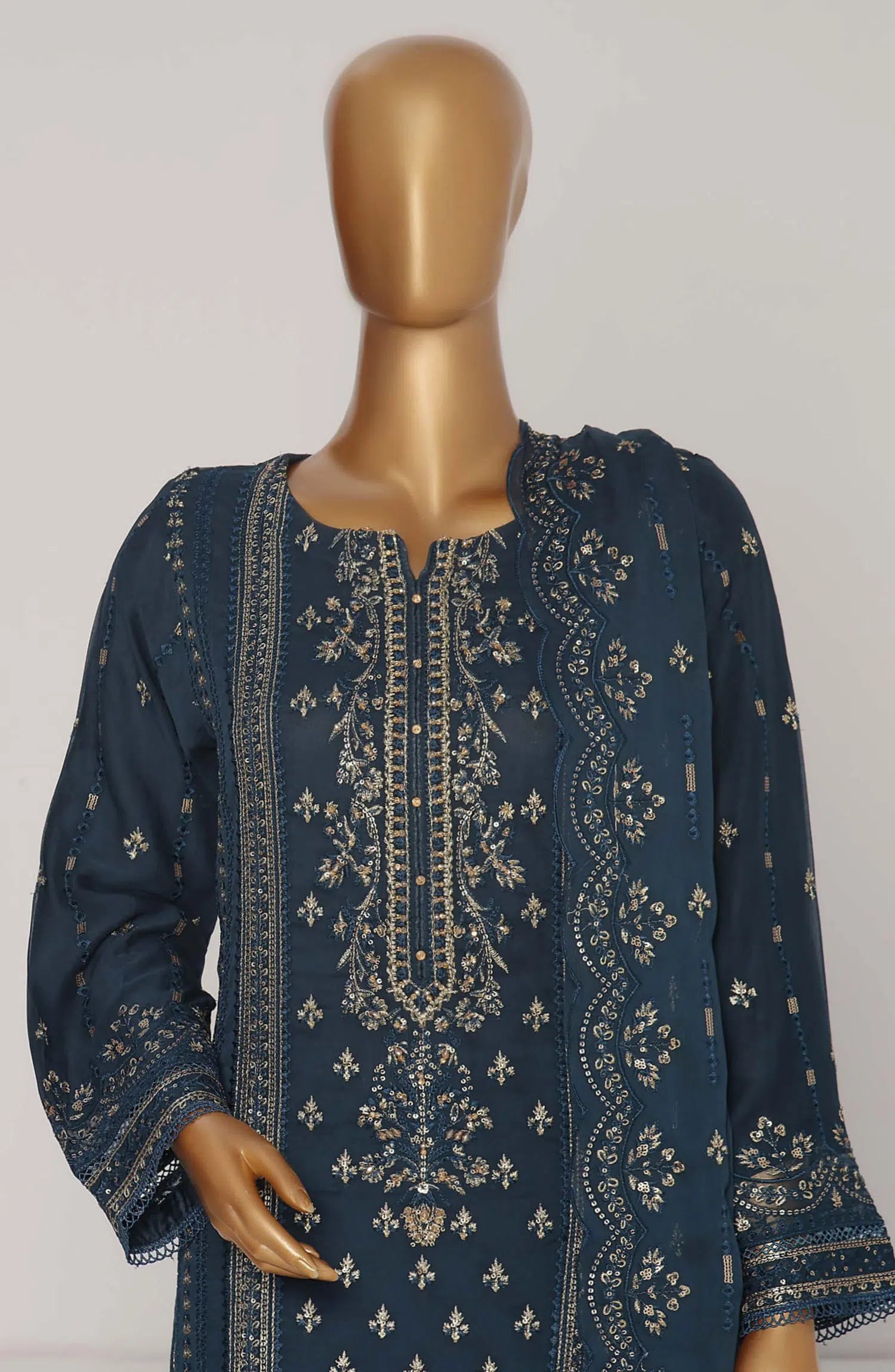 The standard style comes as a long-sleeved kameez with dupatta and trouser/shawlar.