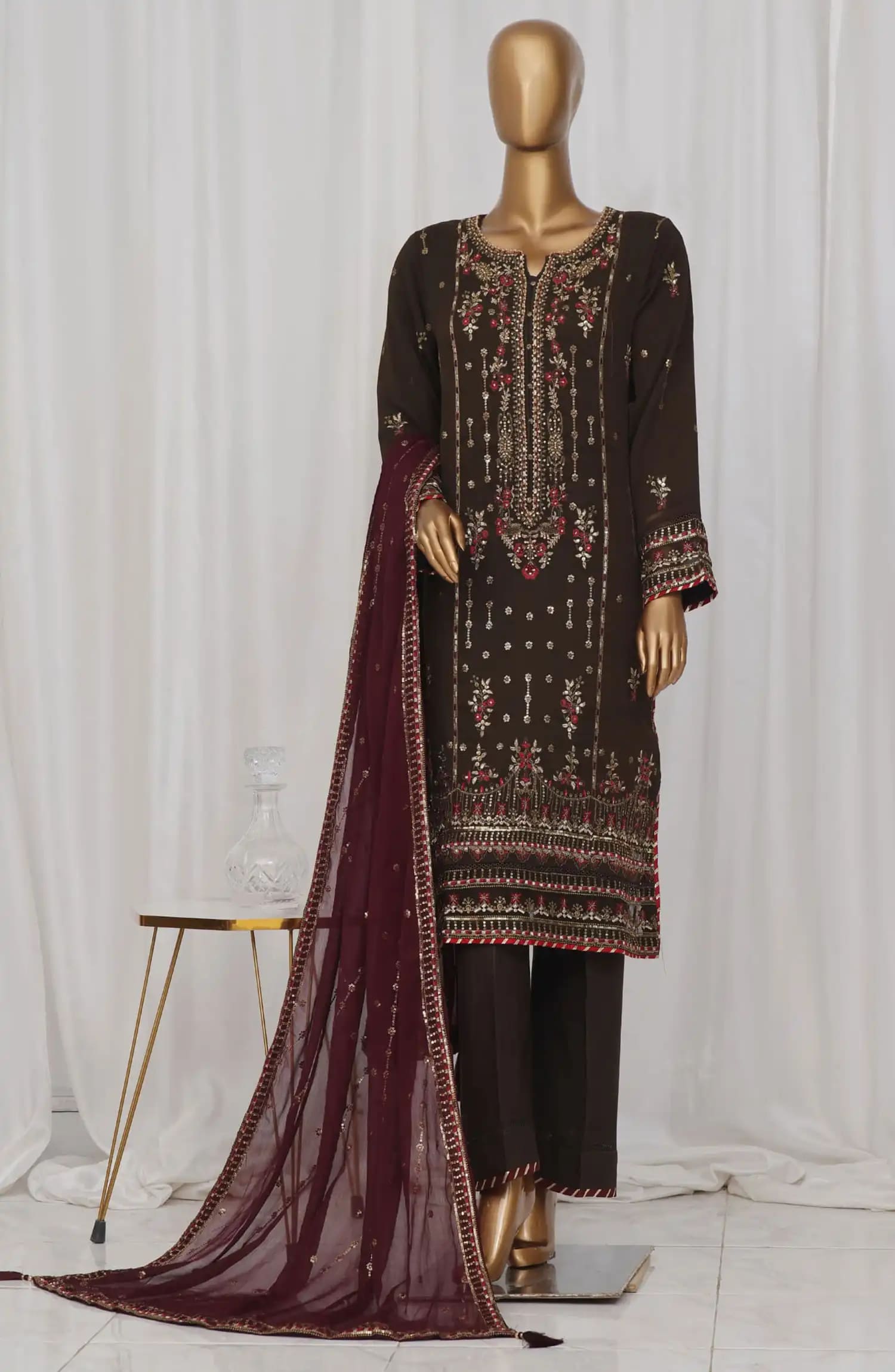 The standard style comes as a long-sleeved kameez with dupatta and trouser/shawlar.
