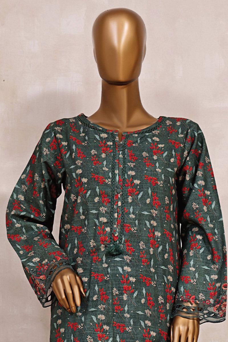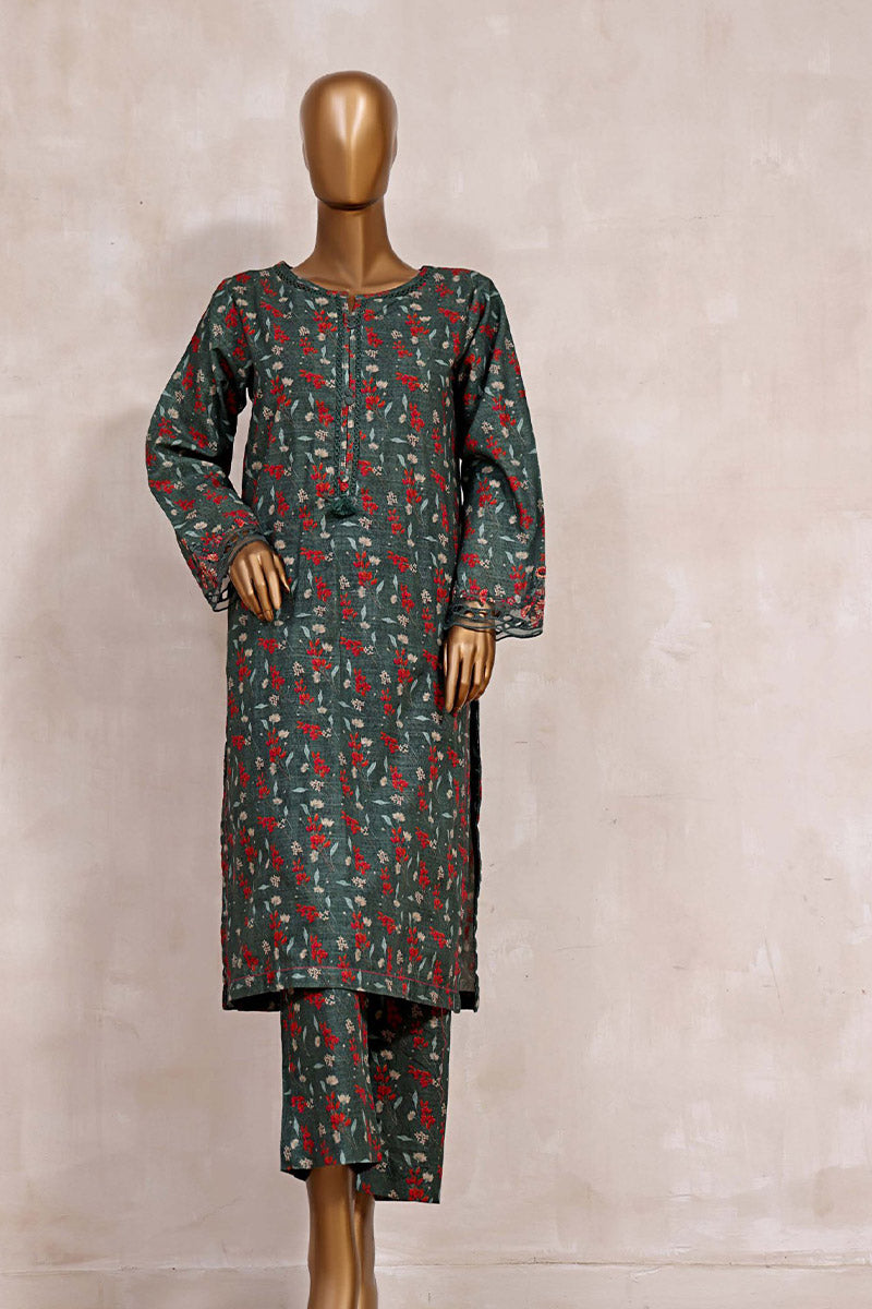 Printed and cutwork embroidered khaddar stitched shirt with matching stitched trouser