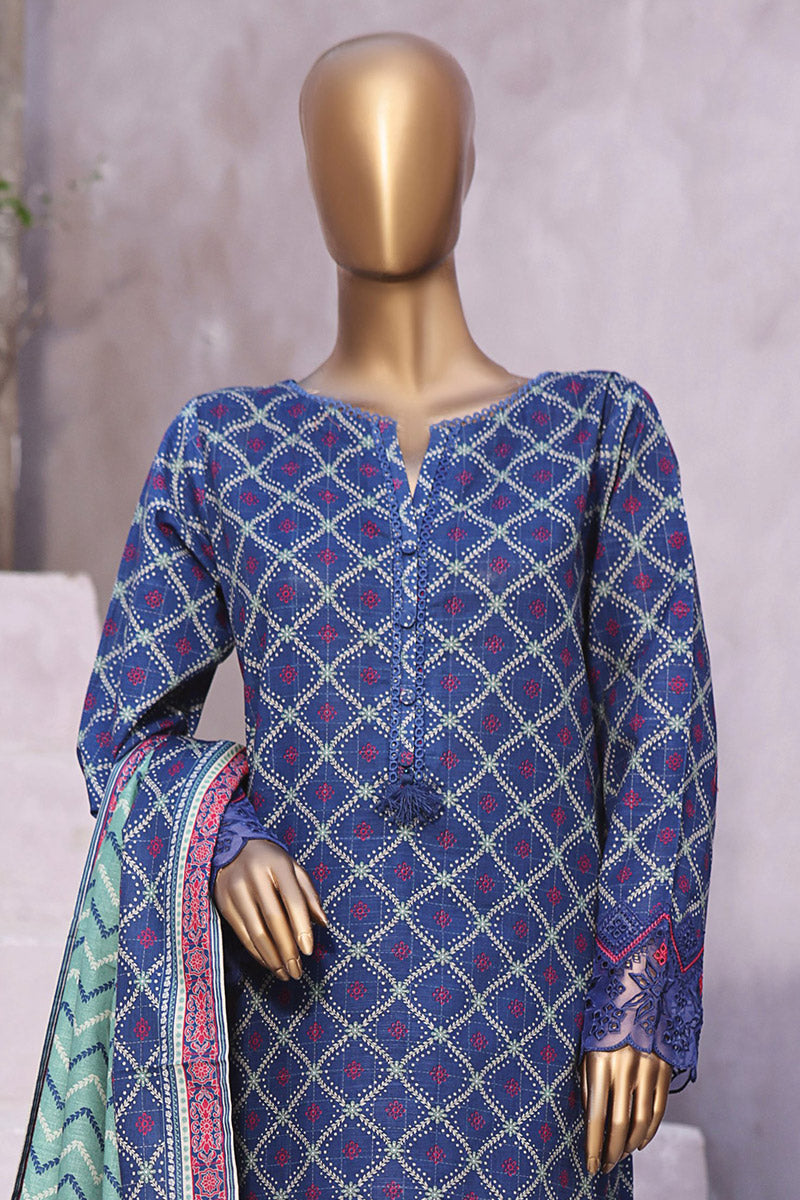 3 piece printed stitched khaddar suit with cutwork embroidered sleeves