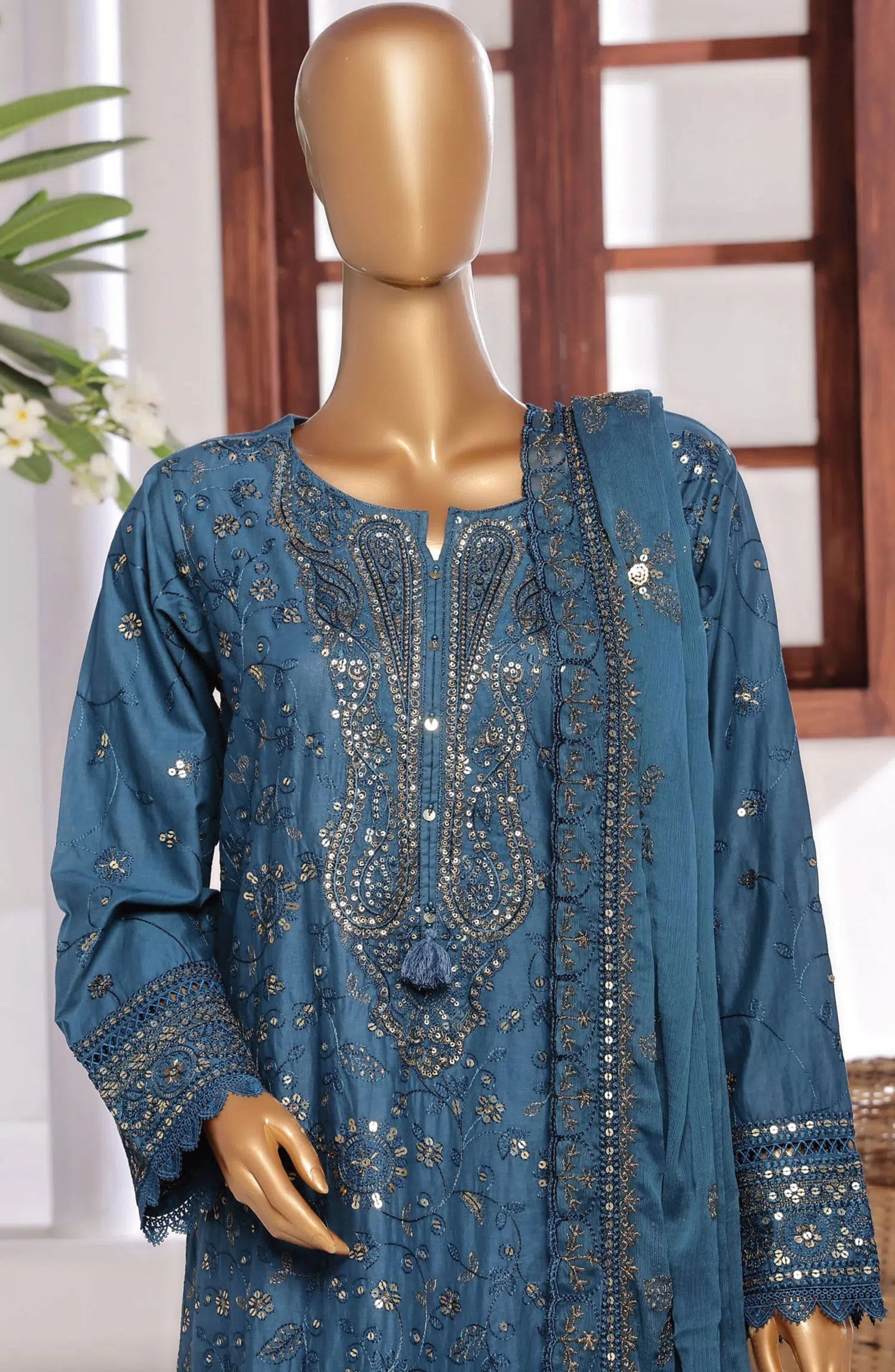 The standard style comes as a long-sleeved kameez with dupatta and trouser/shawlar.