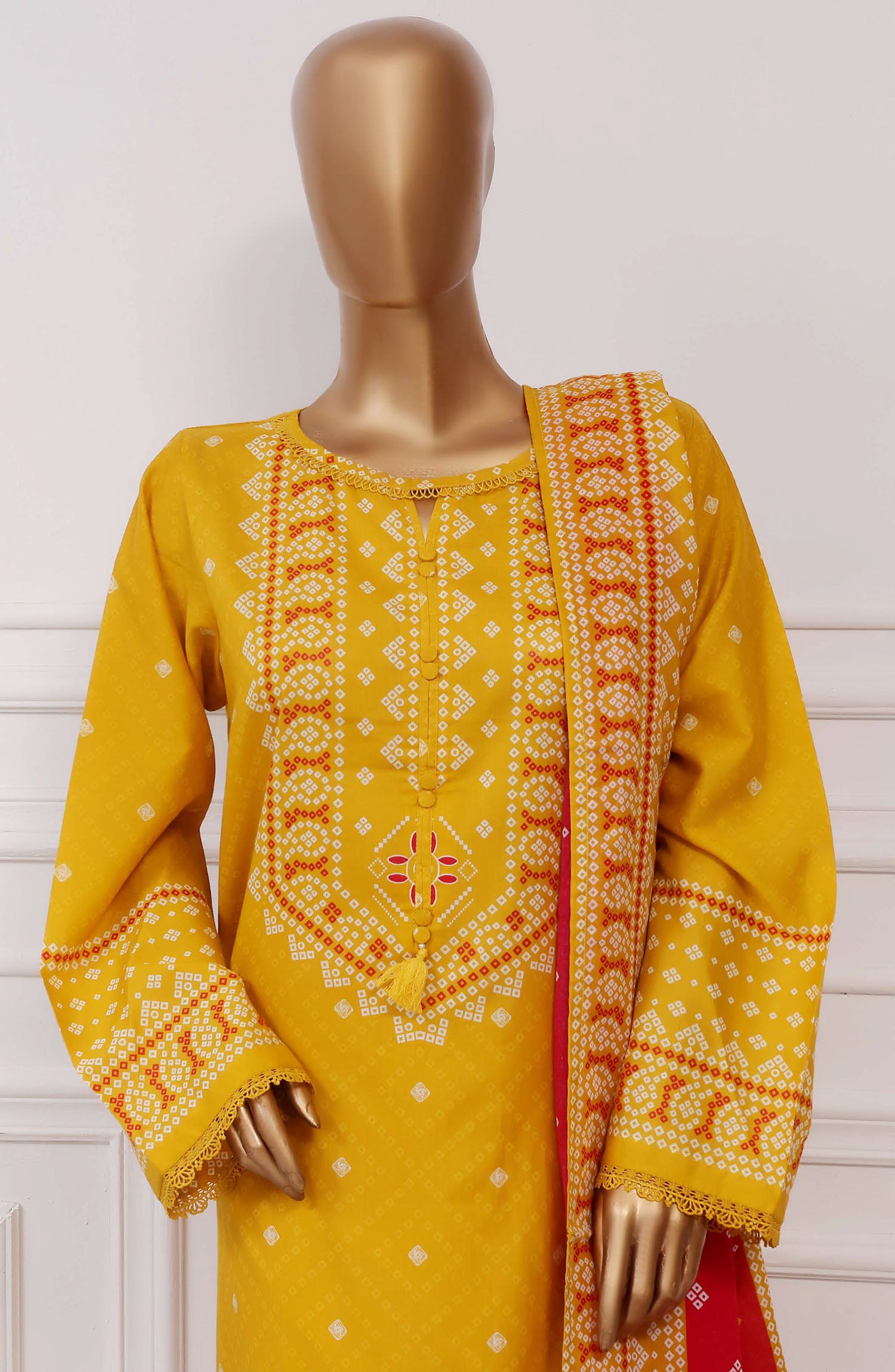 The standard style comes as a long-sleeved kameez with dupatta and trouser/shawlar.