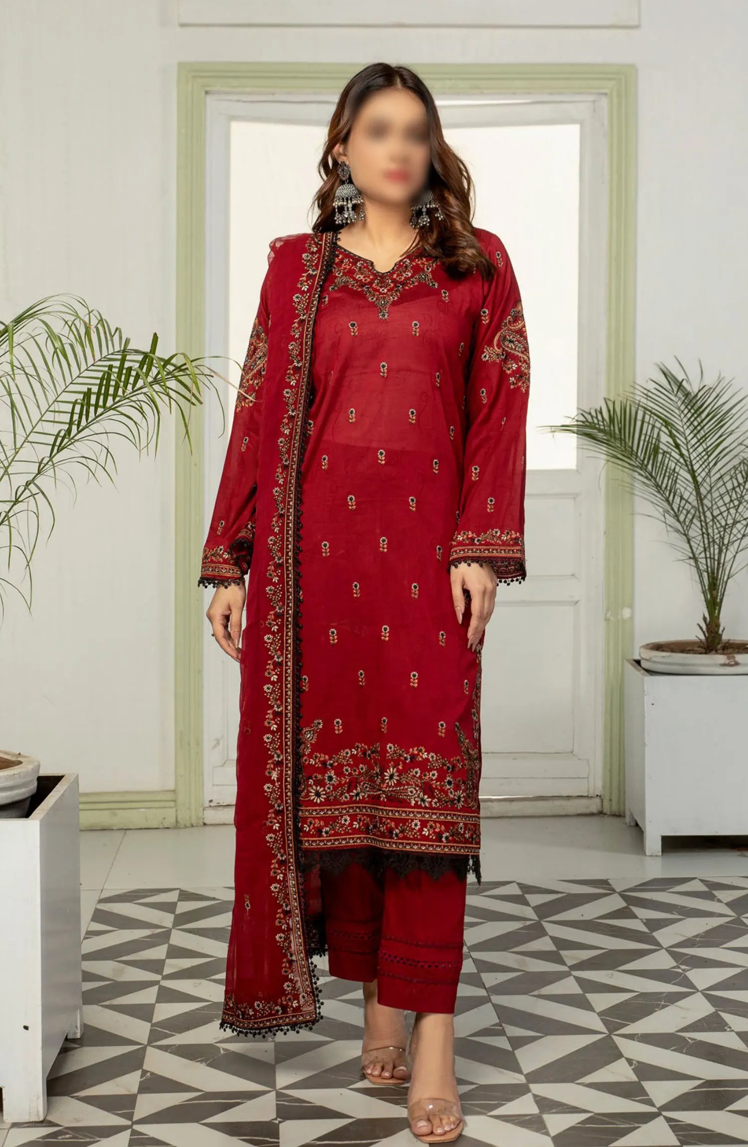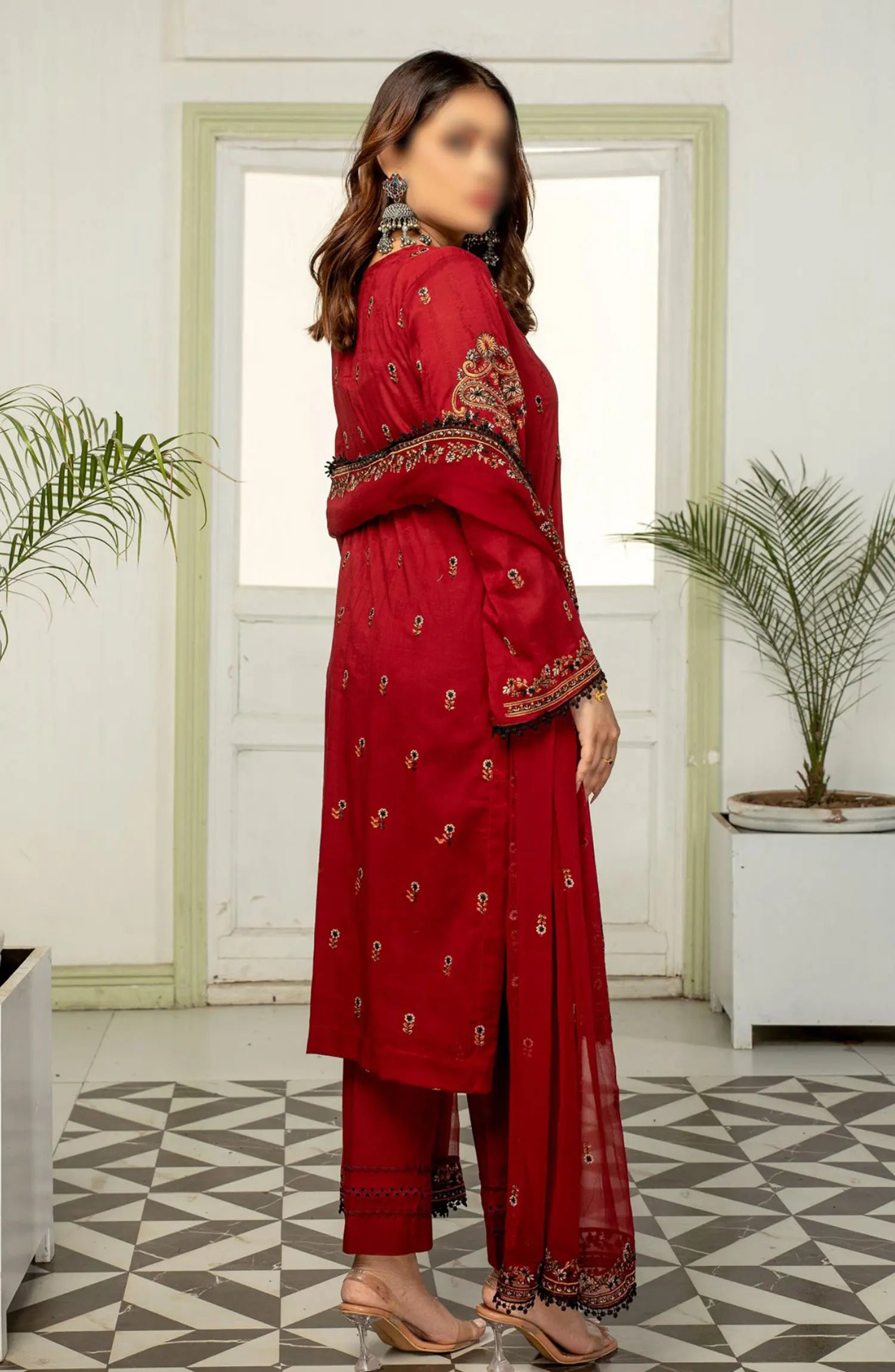 The standard style comes as a long-sleeved kameez with dupatta and trouser/shawlar.