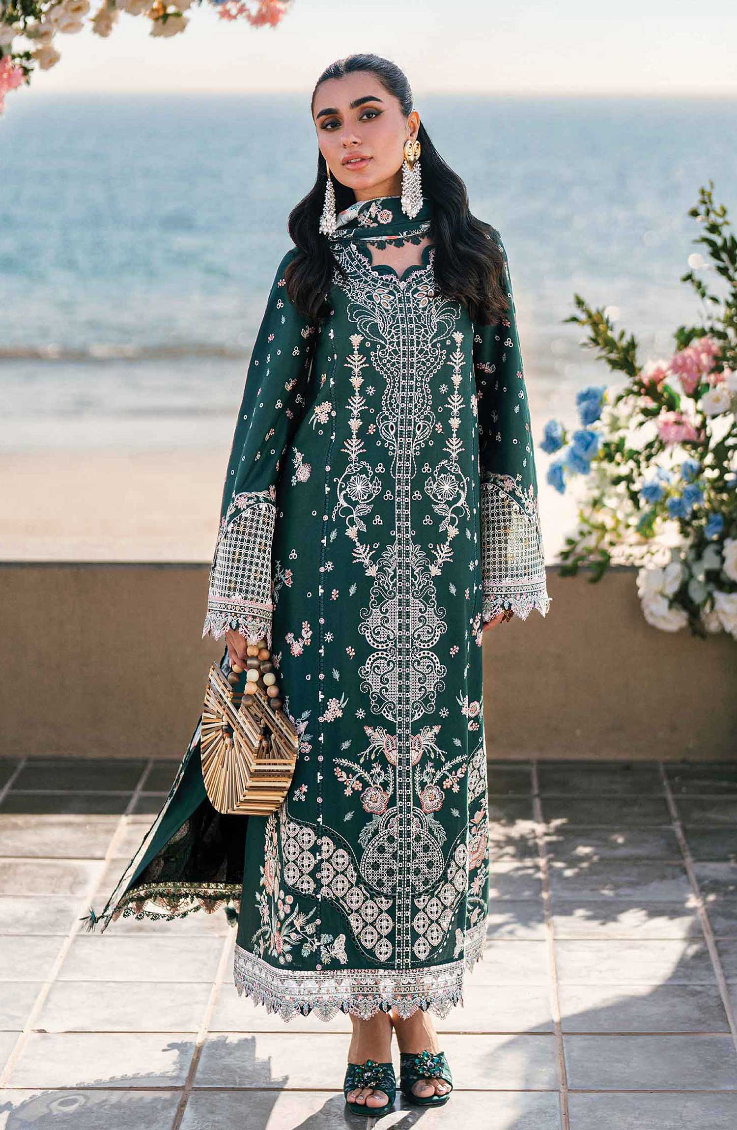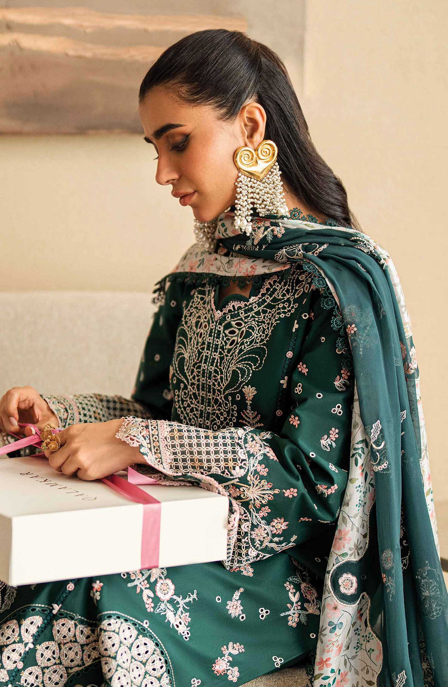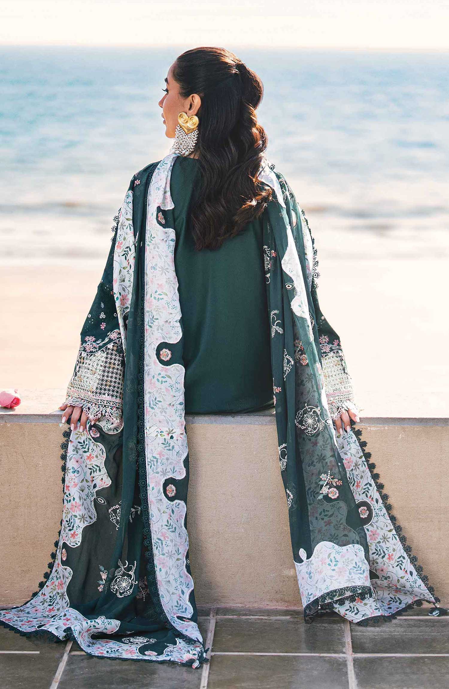 Qalamkar Sahil Luxury Lawn Collection 2025 has been styled in the image for photography and illustrative purposes.