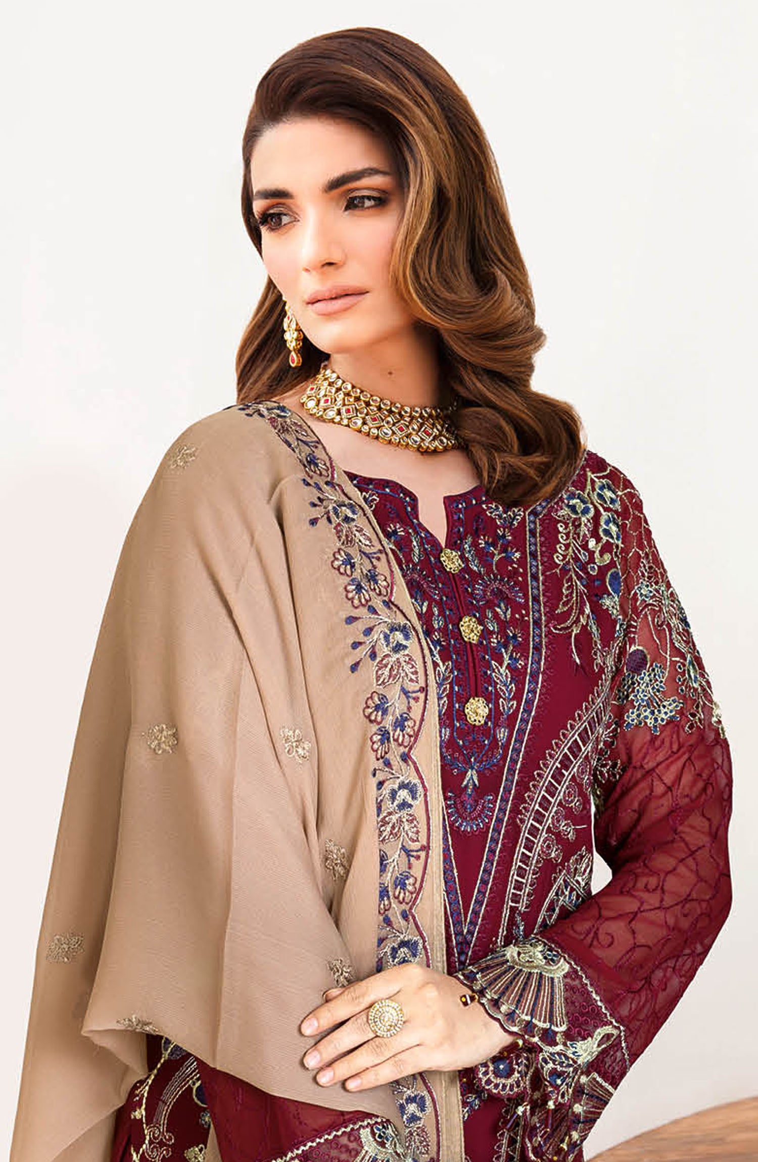 Sangeet by Ramsha Embroidered Chiffon Unstitched 3 Piece Suit - B-203 - R25CCV2 - Maroon - Festive Collection