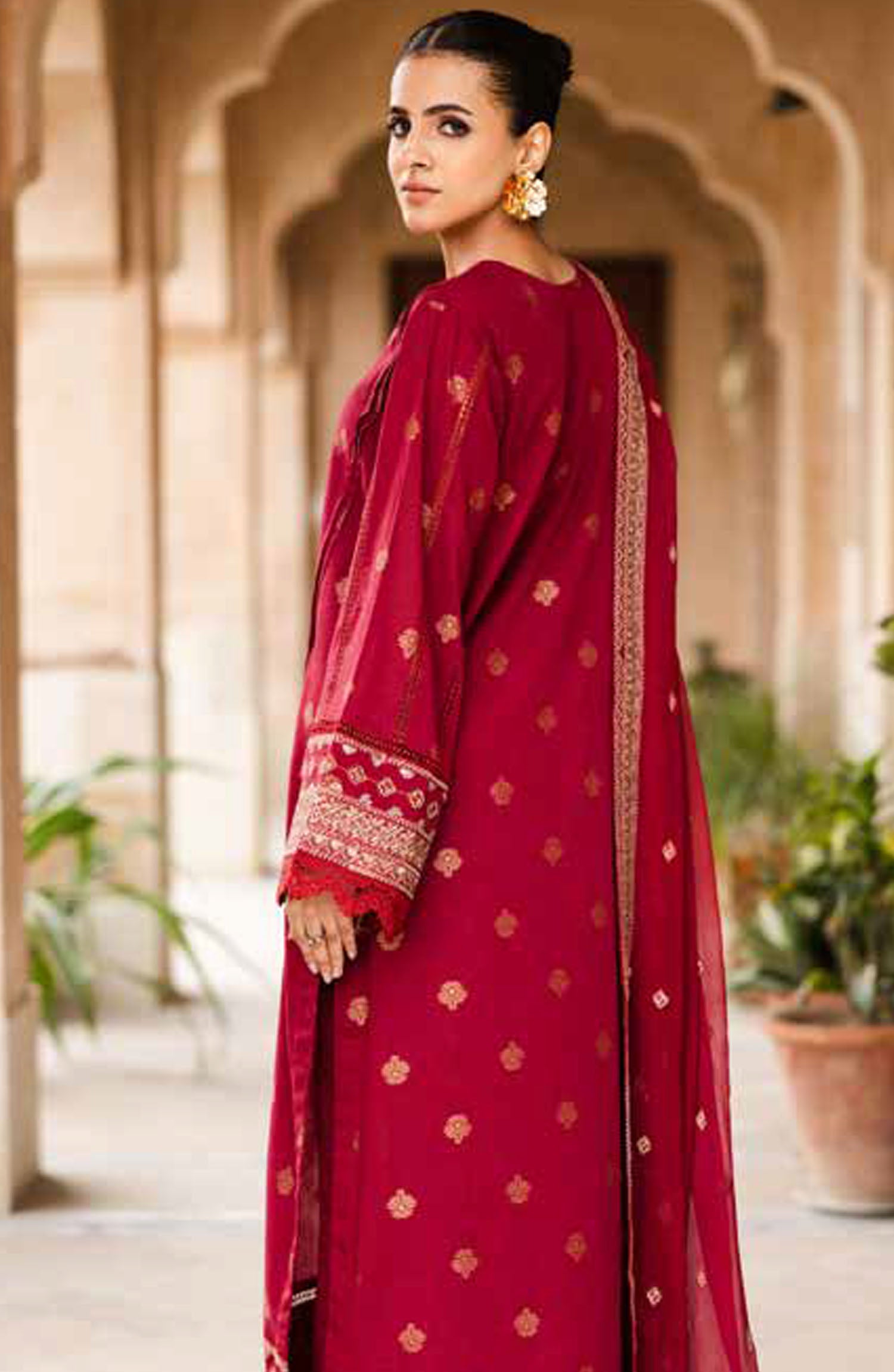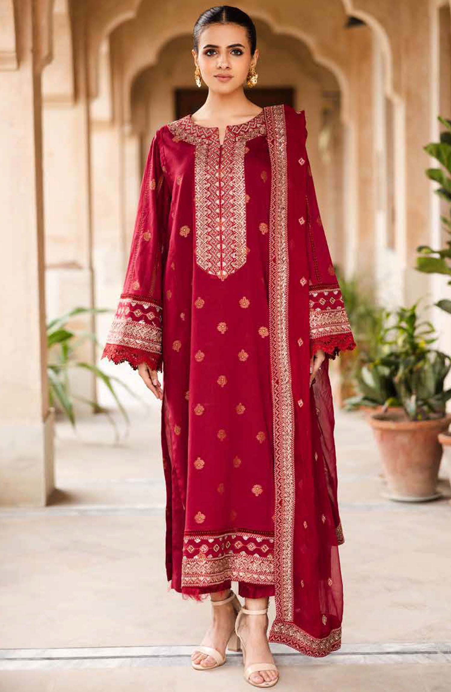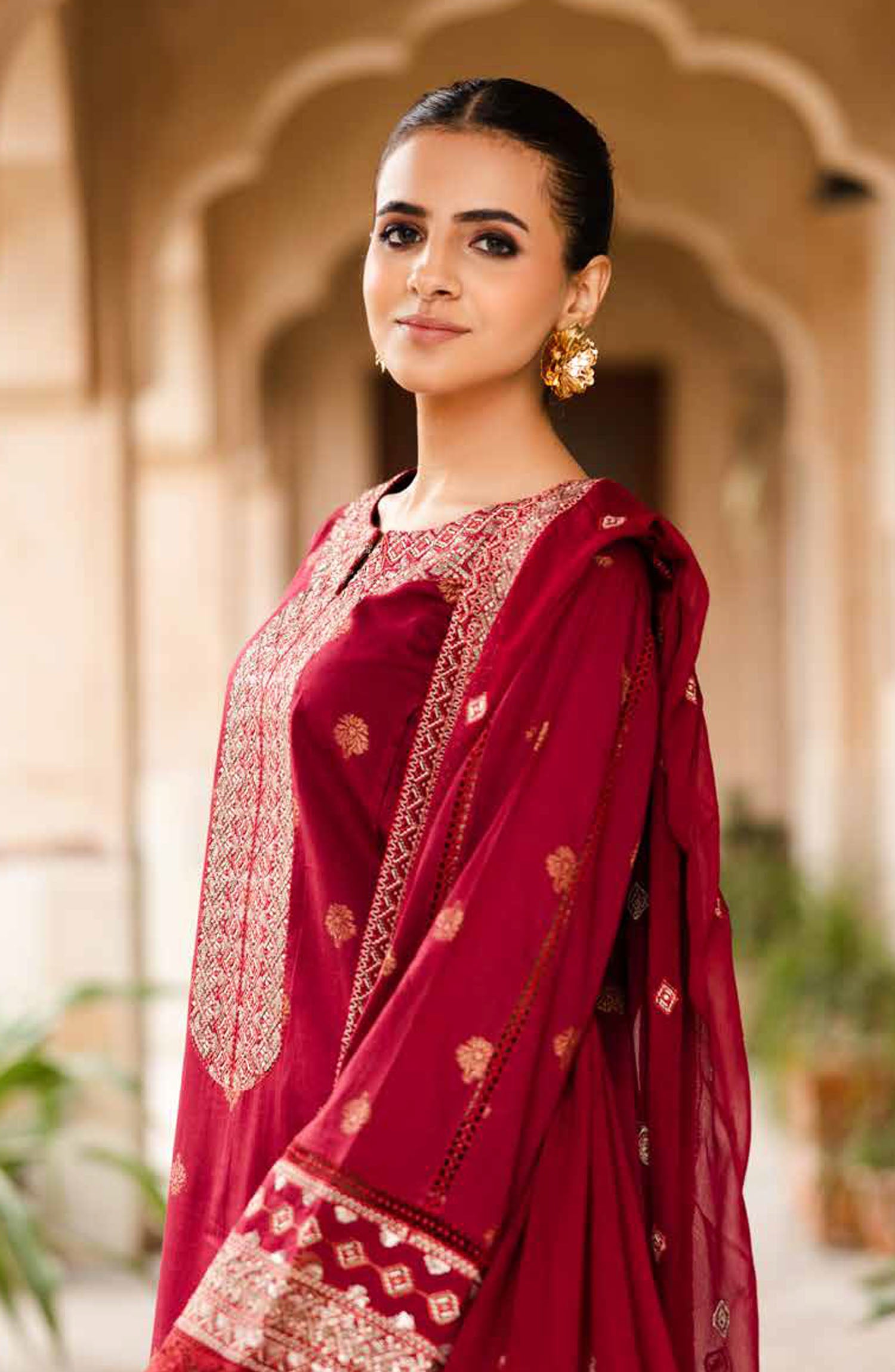 Modest Embroidered Khaddar Stitched 3 Piece Suit - 10050-Mar - MOD25WNT - Maroon - Winter Collection