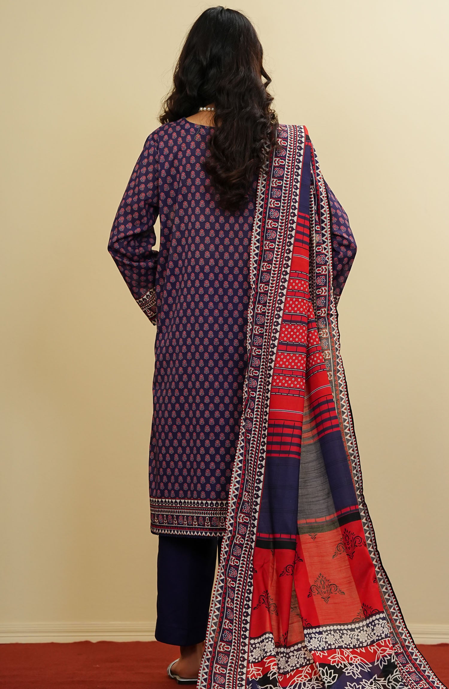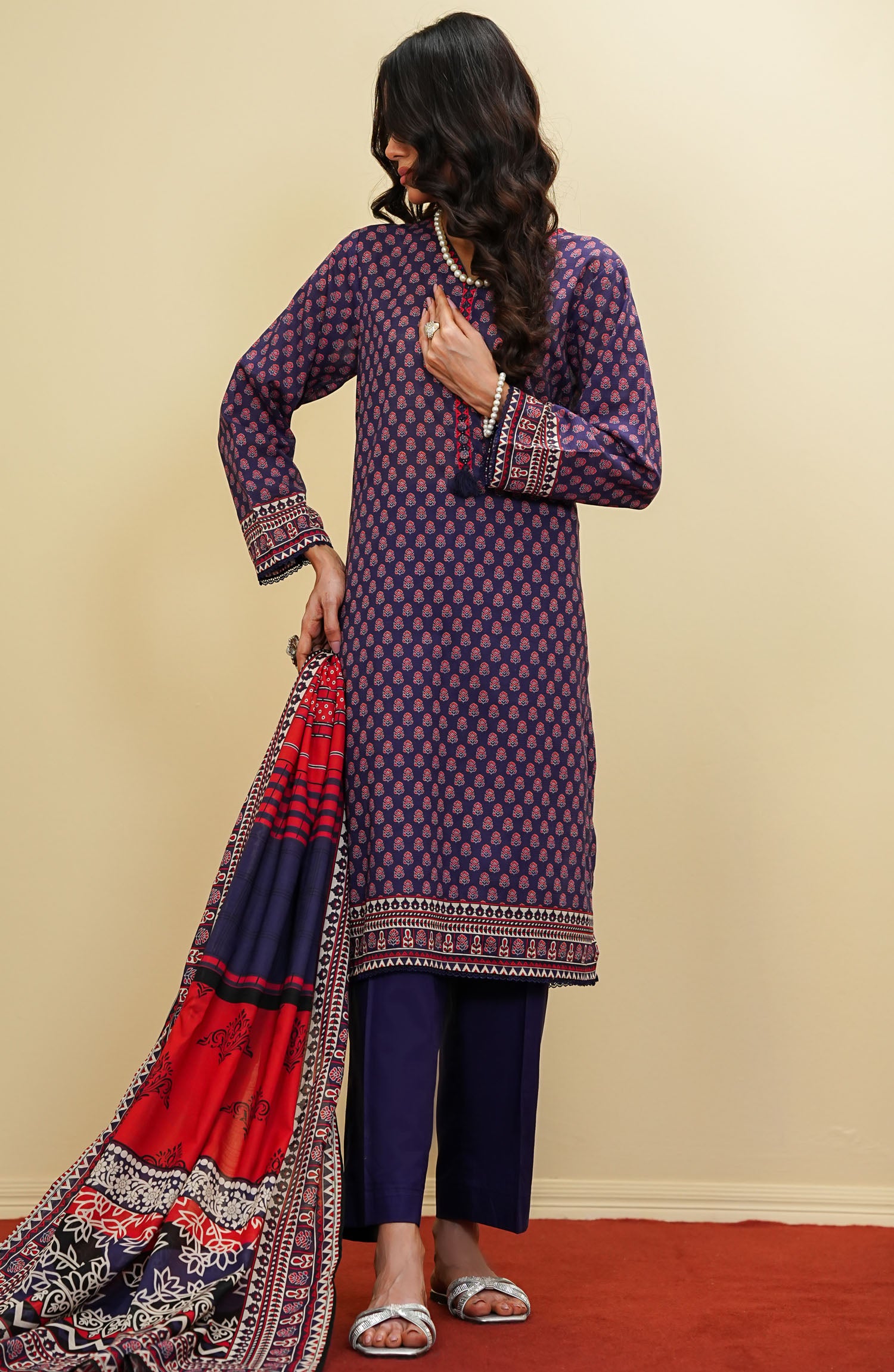 The standard style comes as a long-sleeved kameez with dupatta and trouser/shawlar.