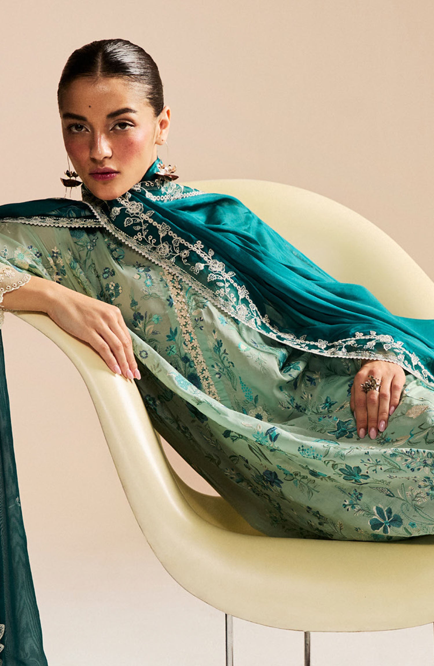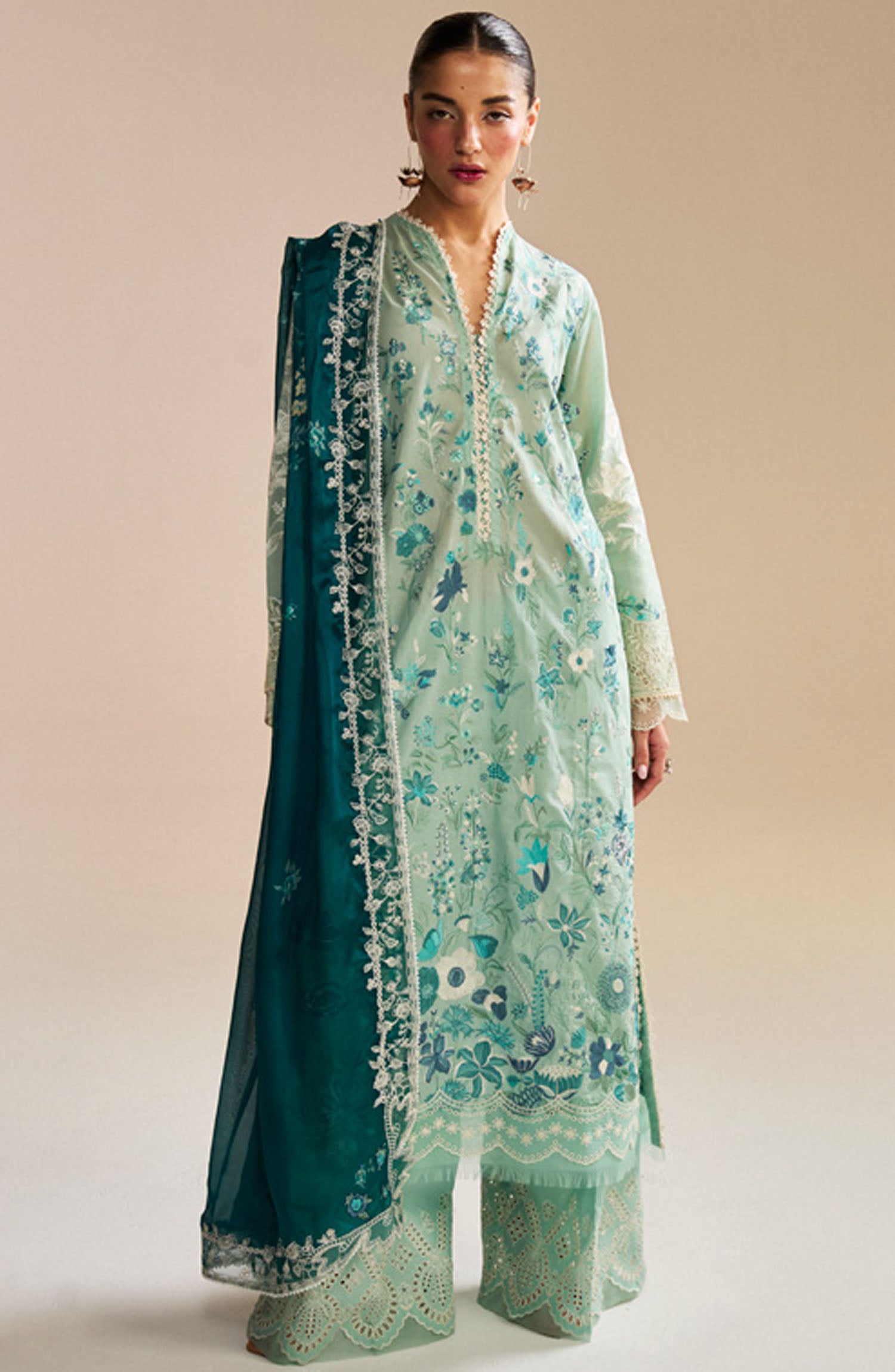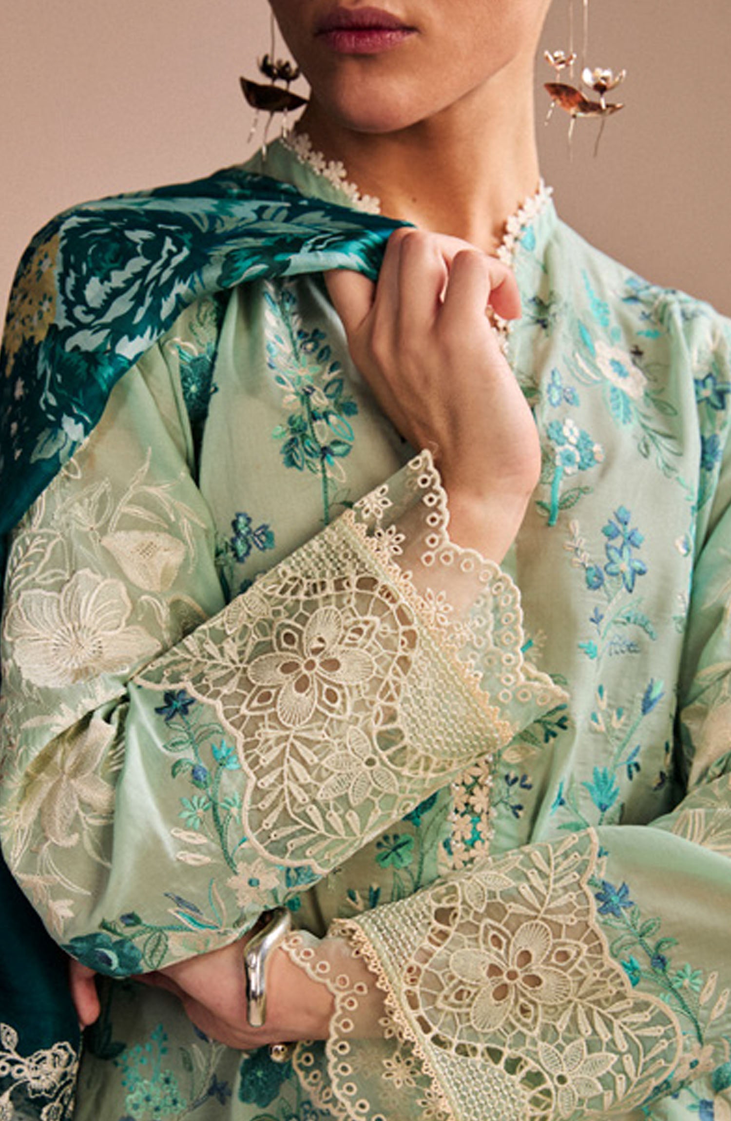 Satori by Zara Shahjahan Embroidered Lawn Unstitched 3 Piece Suit - D-02-B Nozami - ZS25SSL - Sea Green - Summer Collection