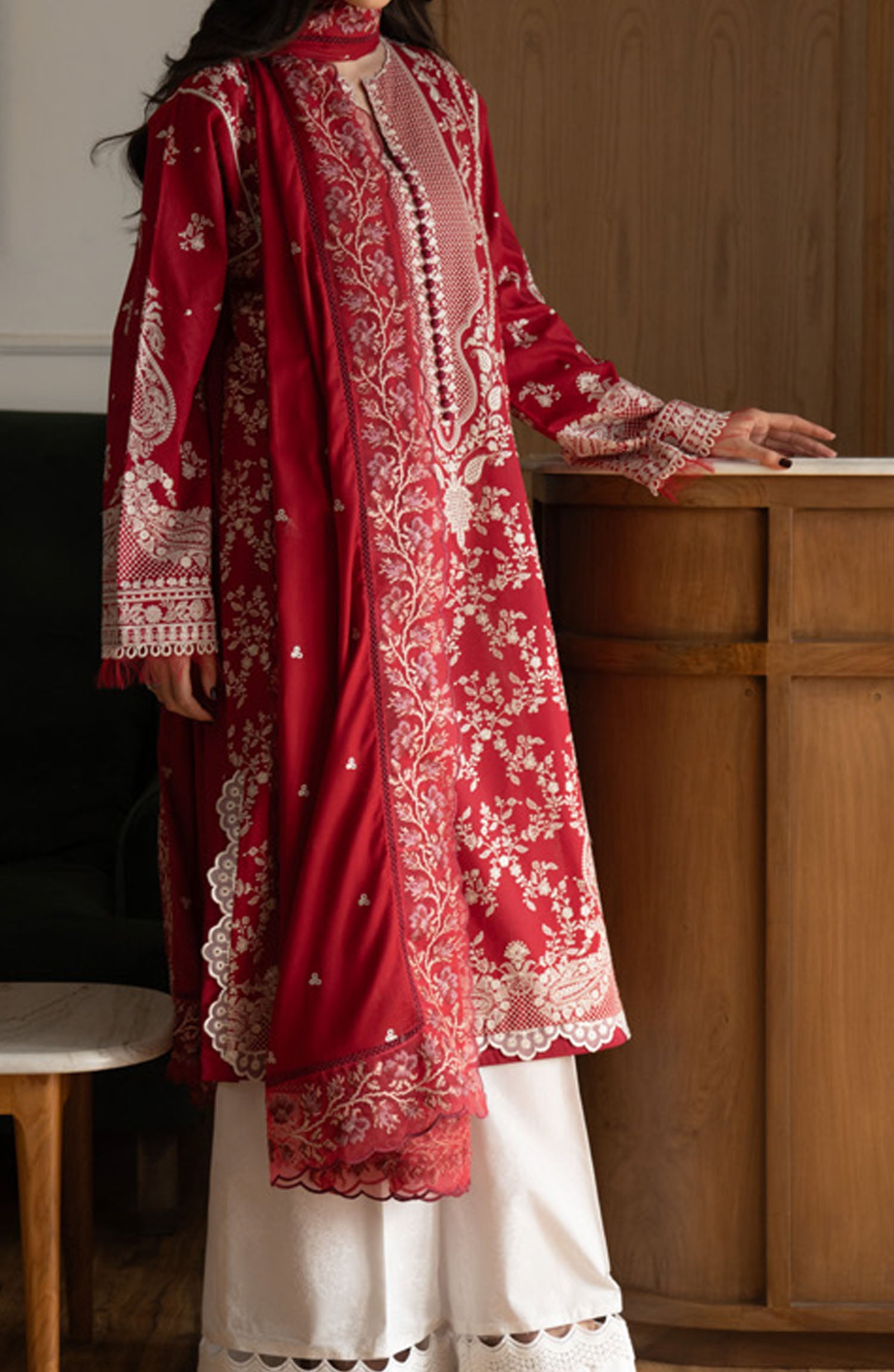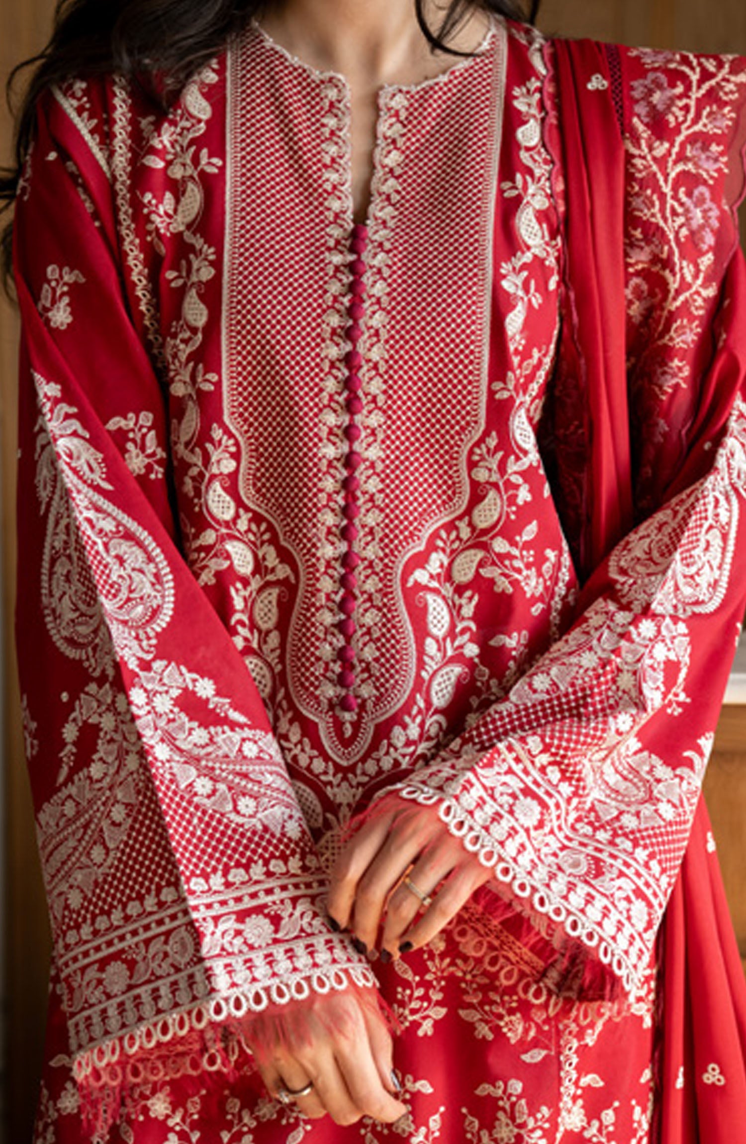 Satori by Zara Shahjahan Embroidered Lawn Unstitched 3 Piece Suit - D-08-A Mei - ZS25SSL - Red - Summer Collection