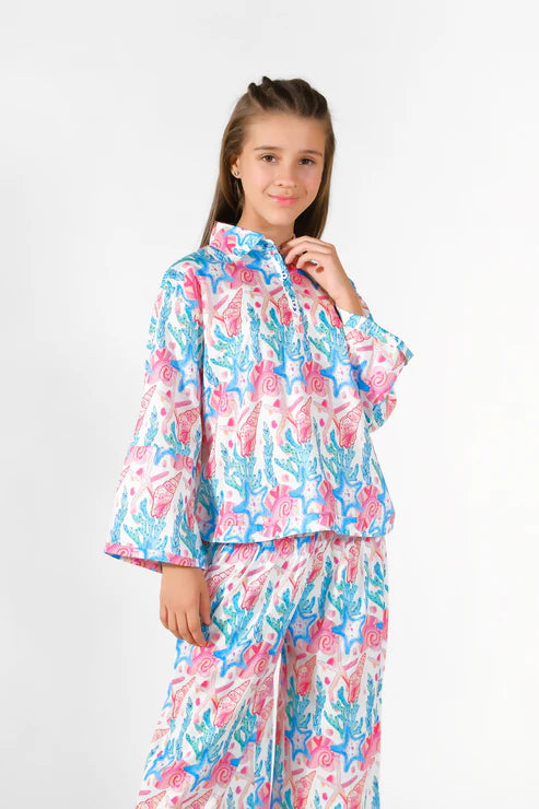 Embrace the essence of coastal charm with the "Seashore" short shirt, adorned in a delightful palette of white, blue, and pink shells, coral, and starfish. This enchanting ensemble captures the beauty of seaside treasures, where every shell holds a story and every starfish whispers of ocean secrets. The soft fabric drapes effortlessly, mirroring the gentle ebb and flow of ocean waves, while the playful print adds a touch of whimsy and wonder. Whether paired with shorts for a day of beachcombing or layered with a skirt for a casual outing, the "Seashore" invites wearers to revel in the magic of the sea.