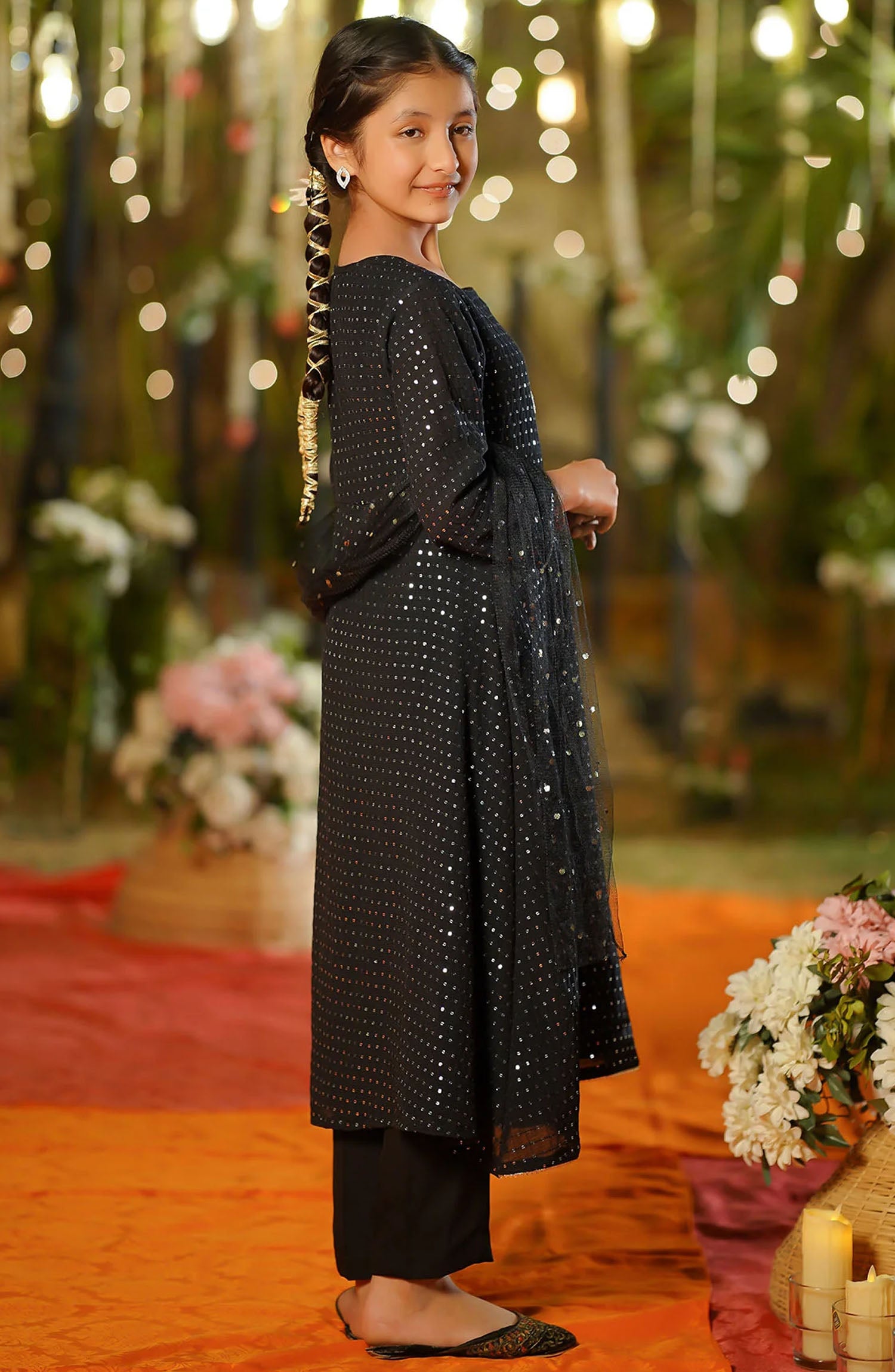 Top: Black Sequenced Net Maxi with Hand Adda Work, Gota Laces and Malai Crepe Lining Stitched