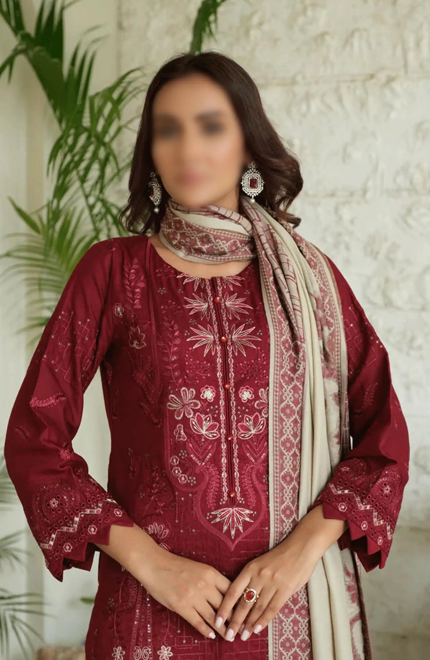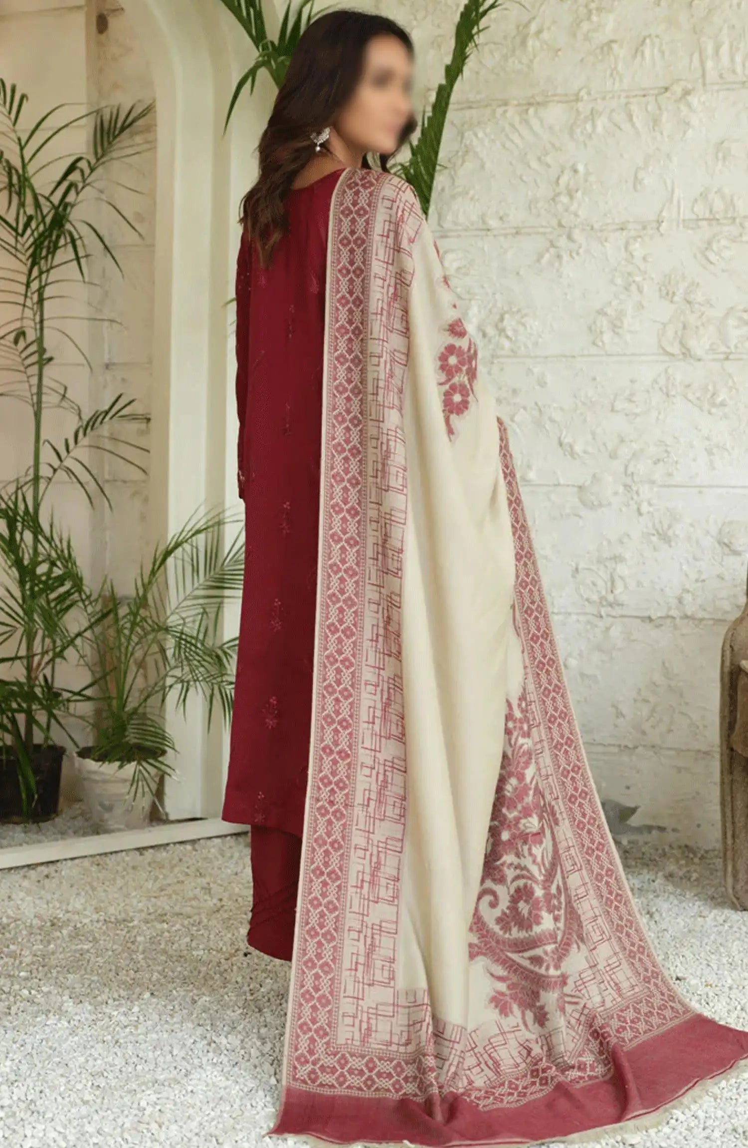 Sequins Embroidered Dyed Wool Collection with Self Weaver Wool Shawl by Marjjan has been styled in the image for photography and illustrative purposes.