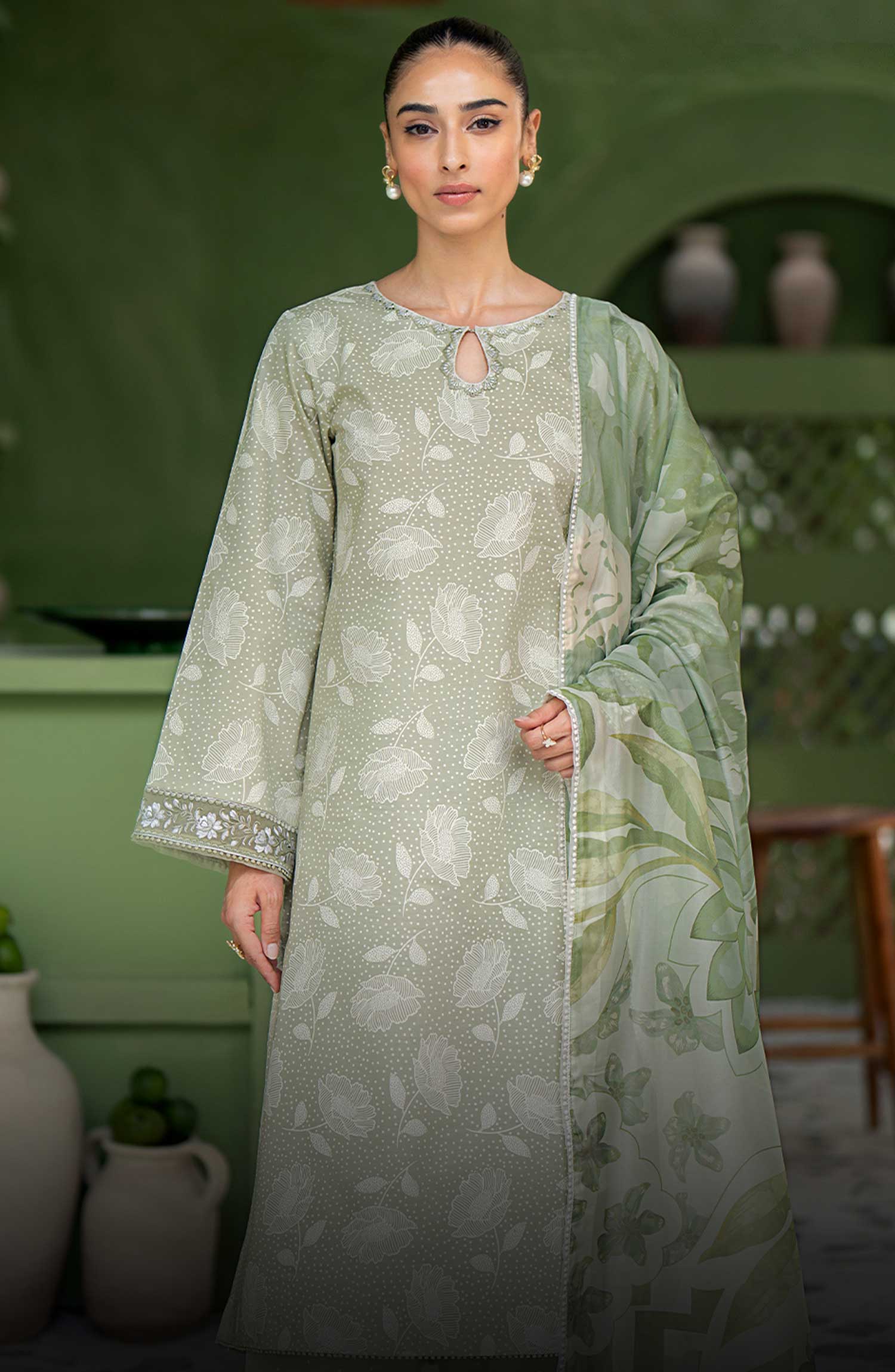 Artisan Unstitched Lawn SS 2025 By Seran has been styled in the image for photography and illustrative purposes.