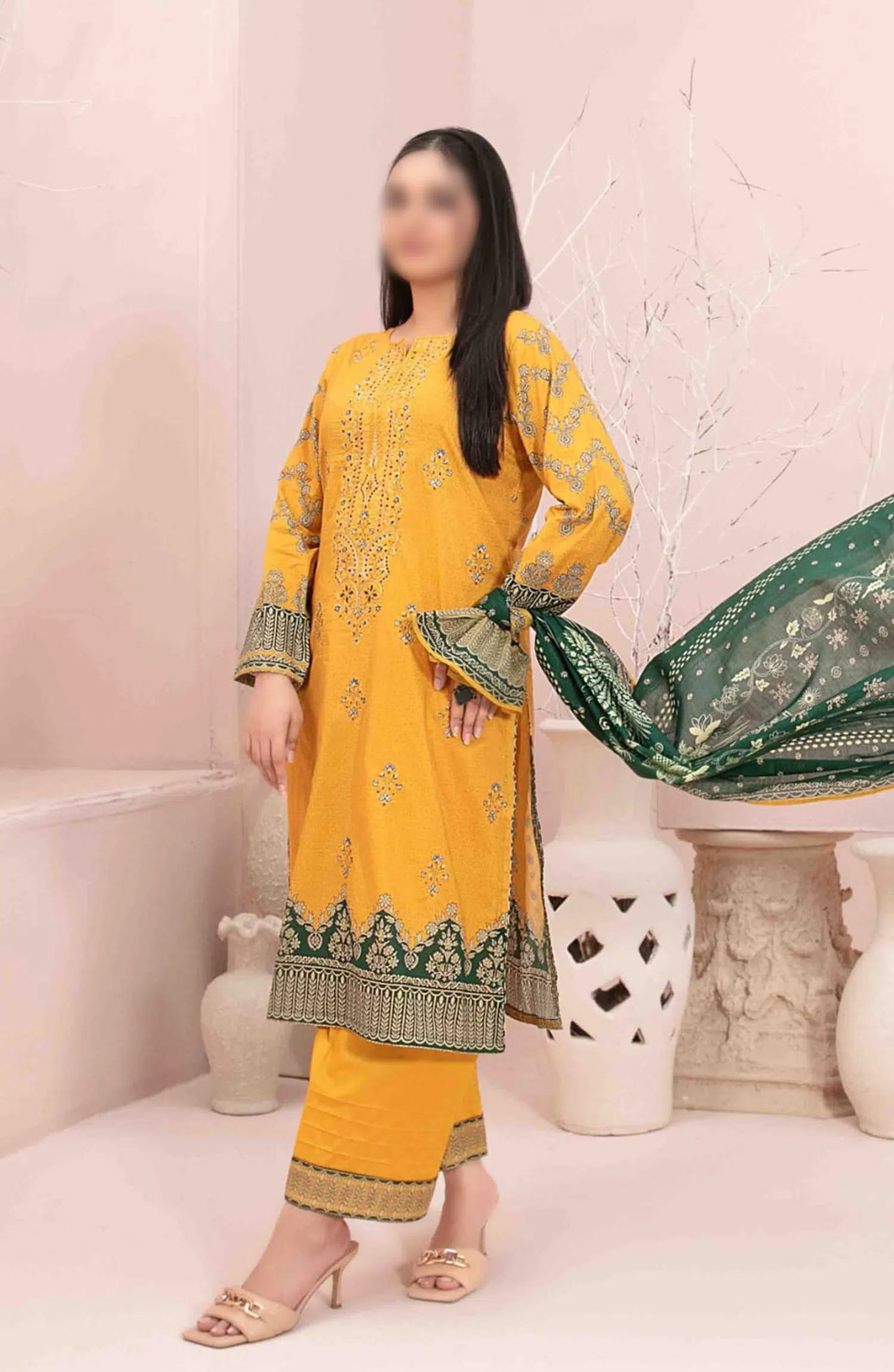 Sevil Vol I - Embroidered Digital Lawn Collection has been styled in the image for photography and illustrative purposes.