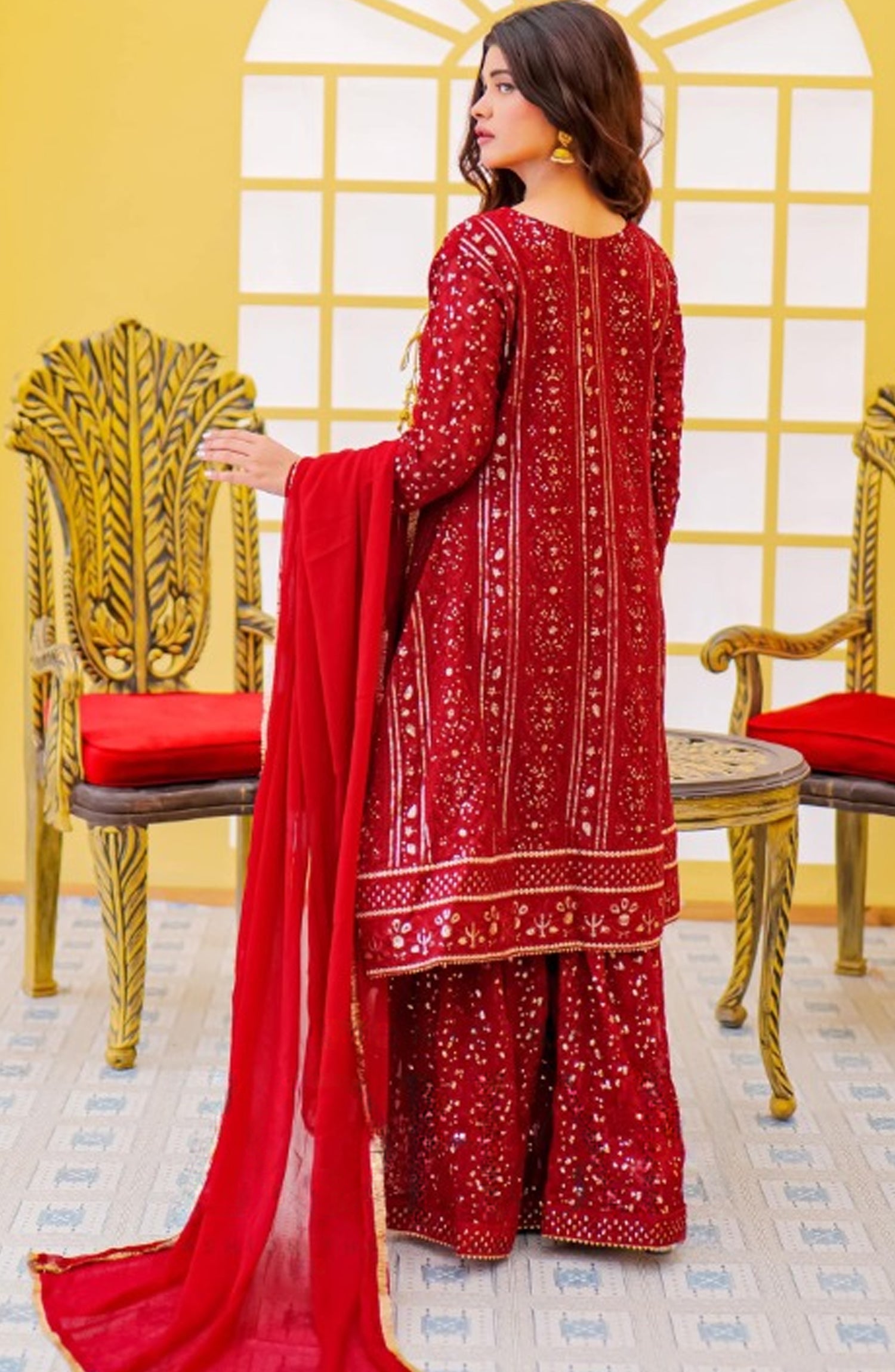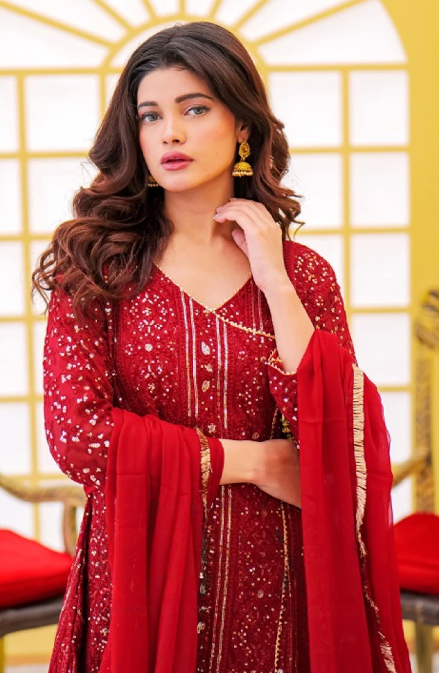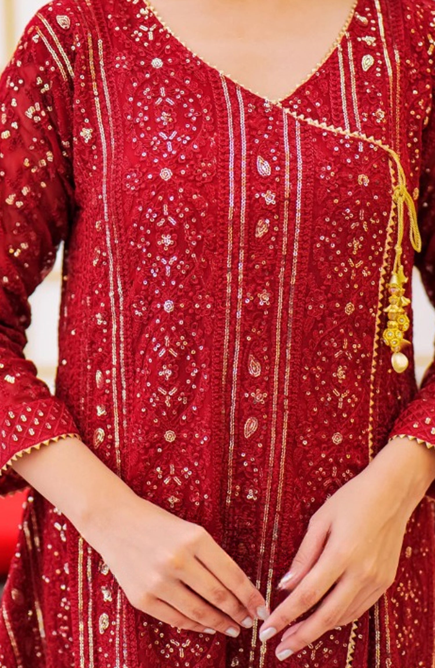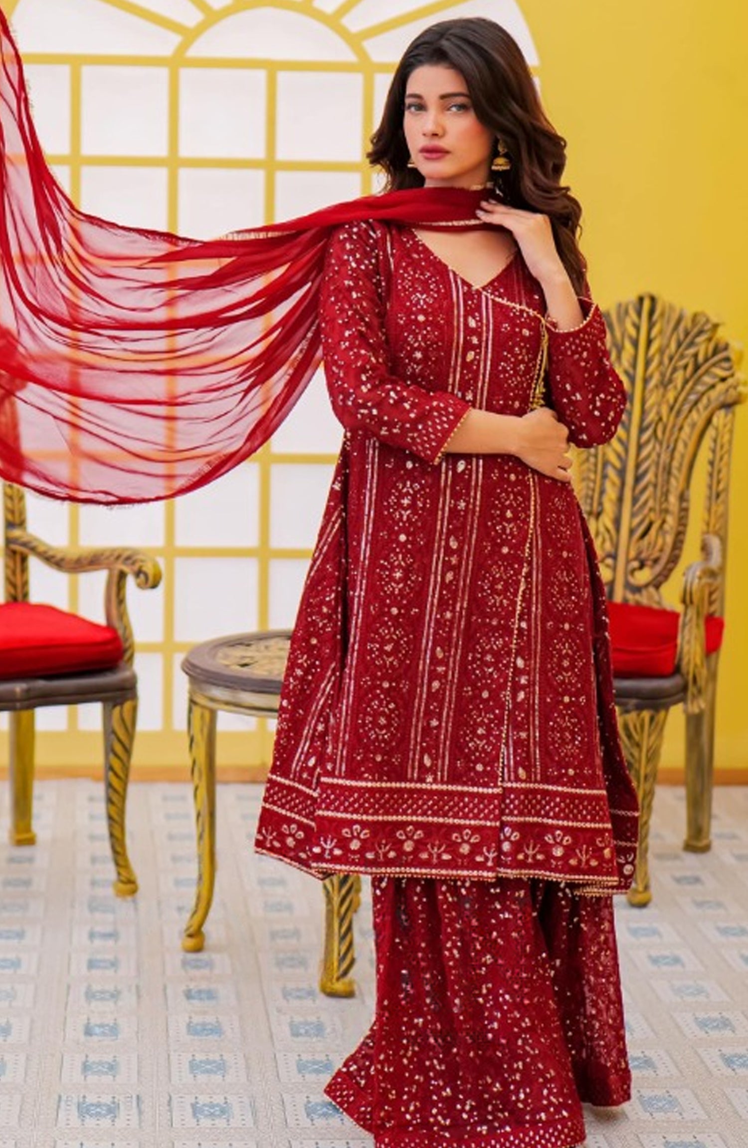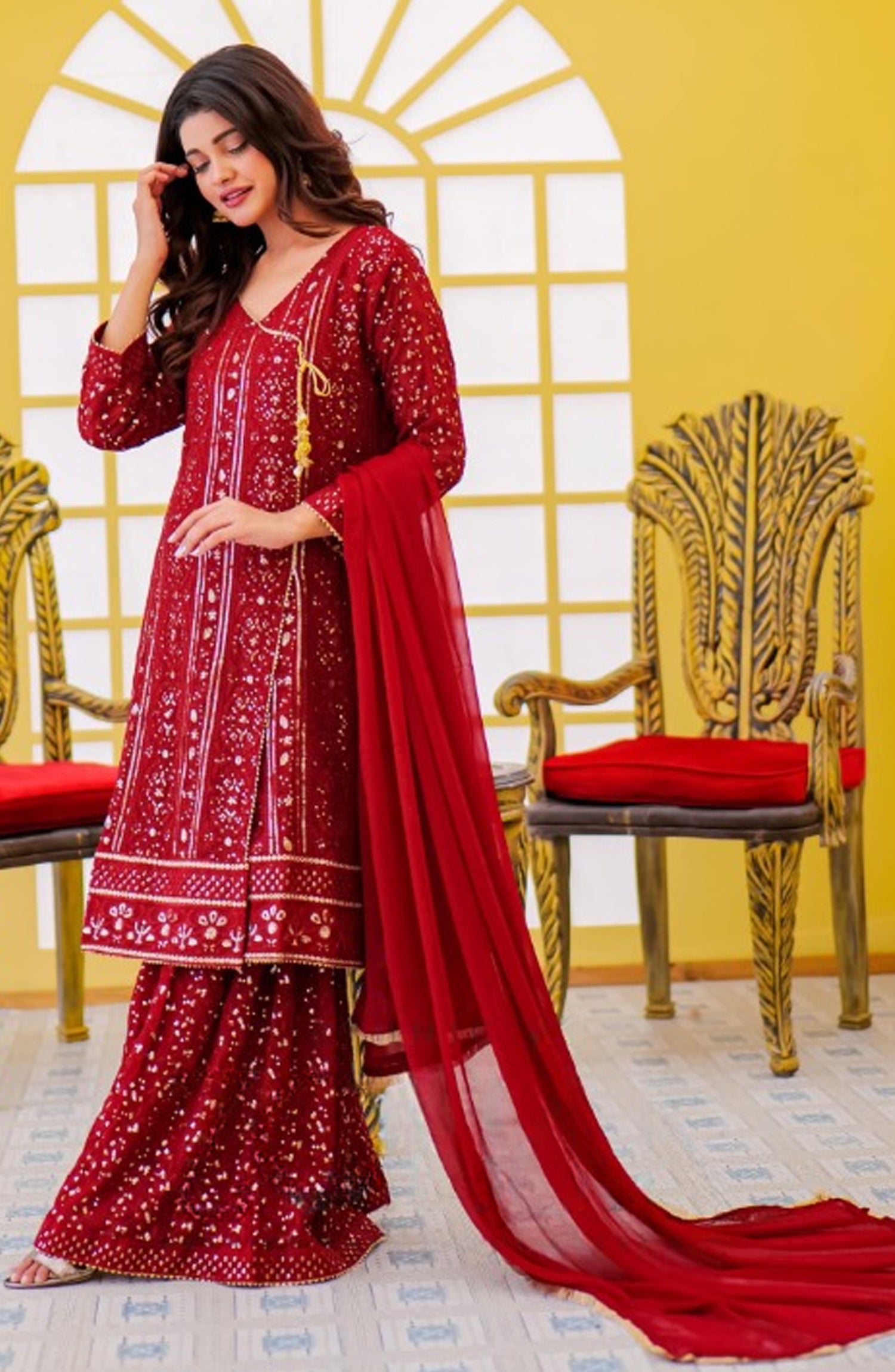 An angrakha style shirt with a gharara is a traditional outfit featuring a knee-length or shorter shirt with an overlapping closure, often adorned with intricate embroidery or embellishments, paired with a flared, wide-legged pant called a gharara.