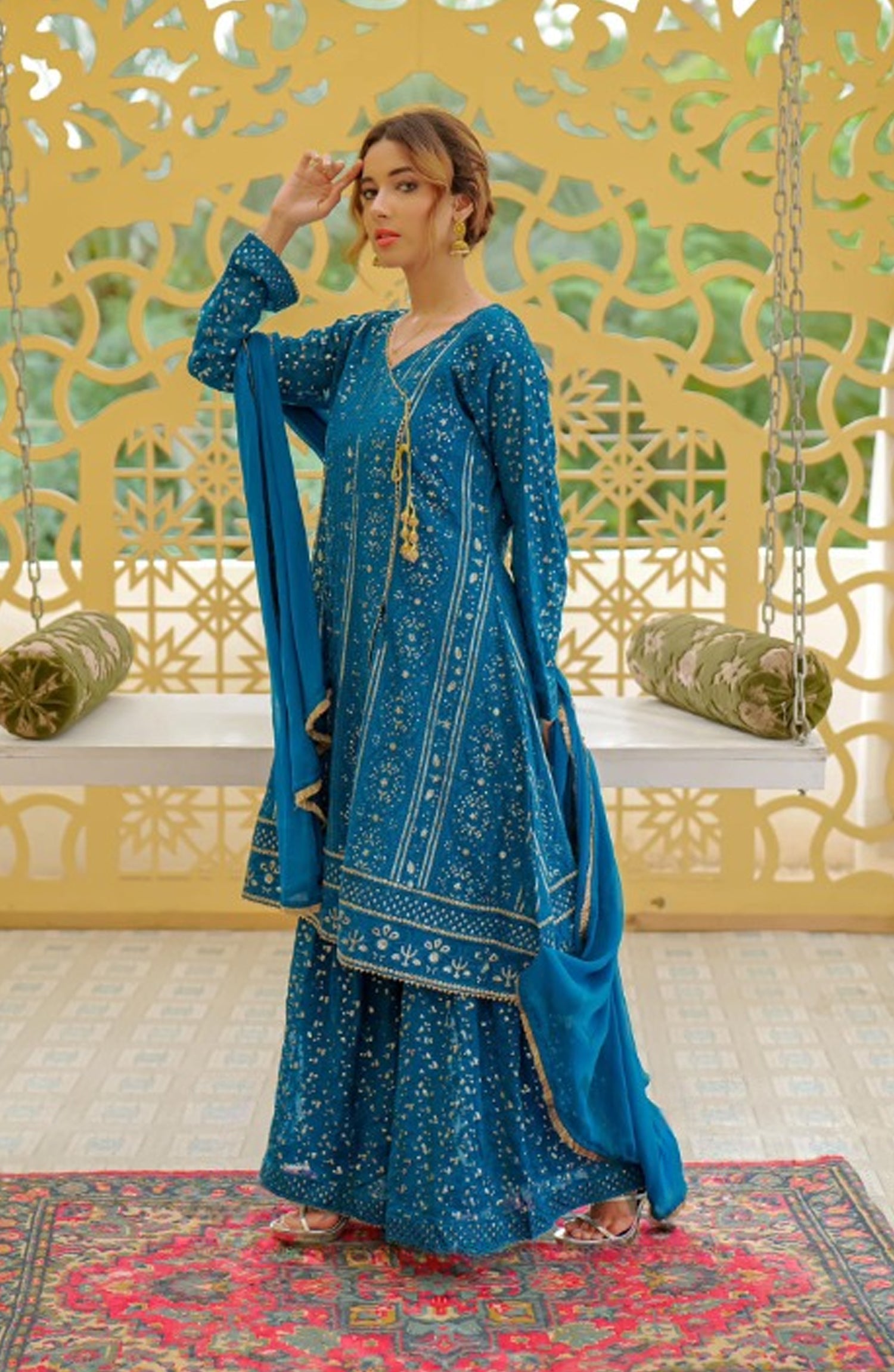 An angrakha style shirt with a gharara is a traditional outfit featuring a knee-length or shorter shirt with an overlapping closure, often adorned with intricate embroidery or embellishments, paired with a flared, wide-legged pant called a gharara.