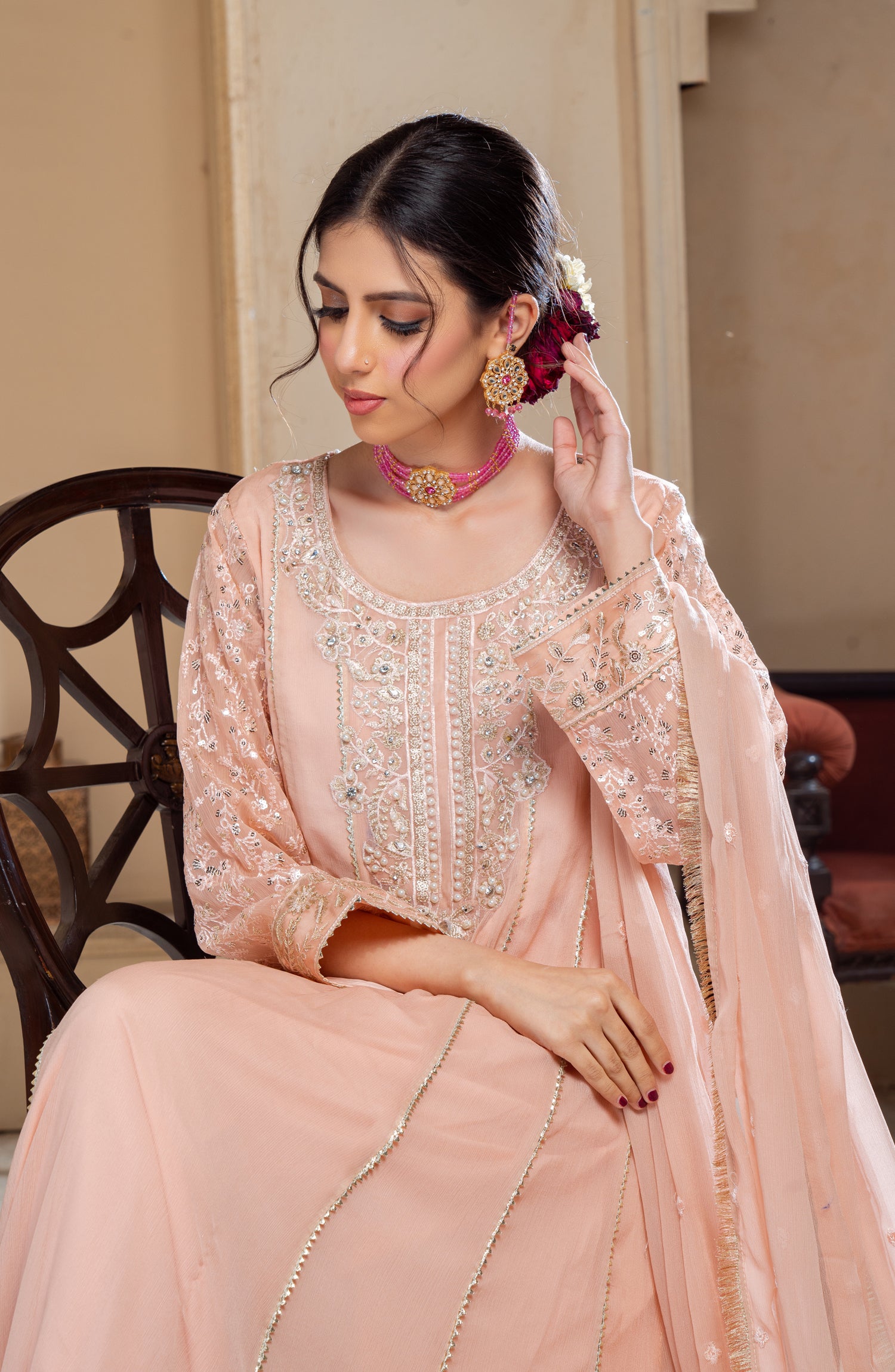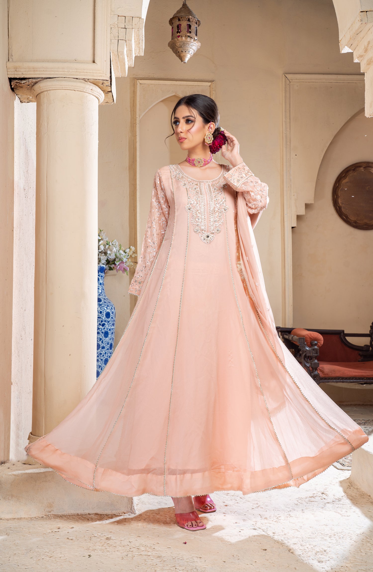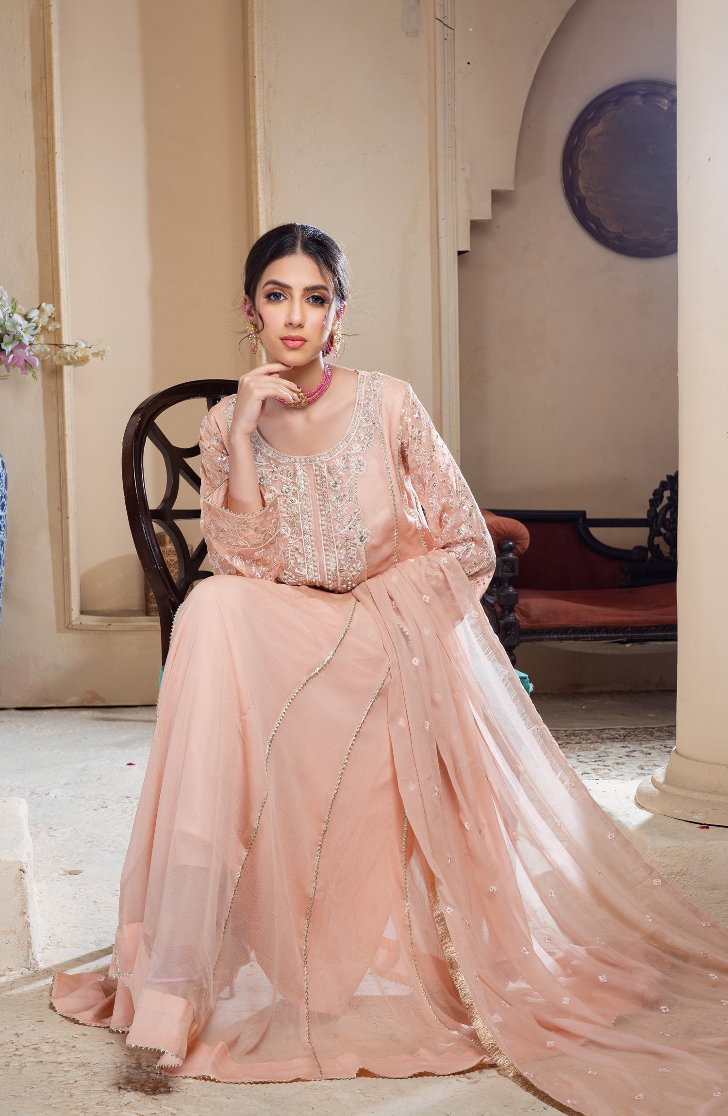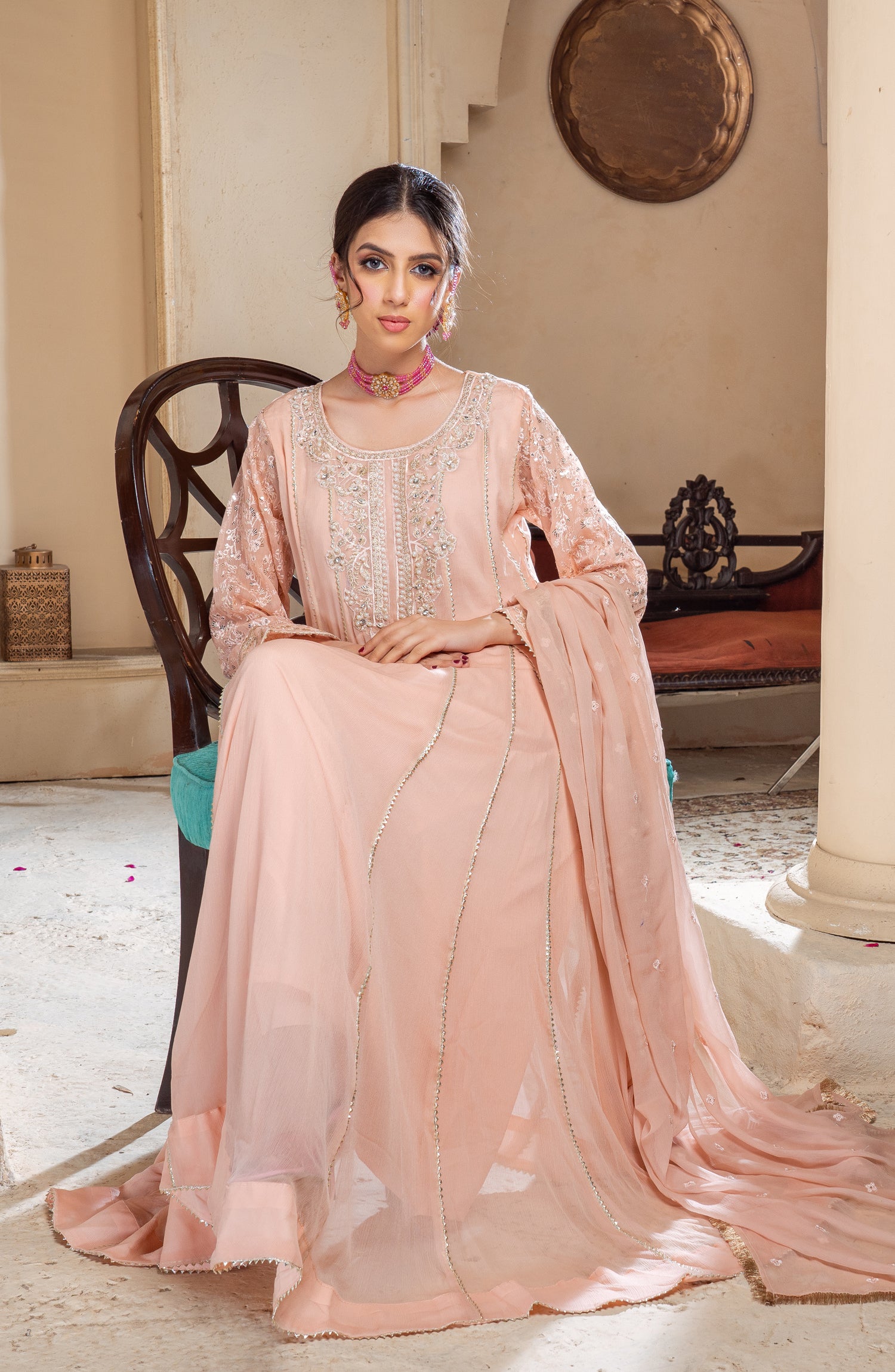 This elegant long chiffon frock is designed for a graceful and sophisticated look. Made from lightweight embroidered chiffon, it offers a flowy and ethereal feel. The neckline is adorned with intricate zardozi and pearl work, adding a touch of luxury and elegance. The panels of the frock feature delicate samosa lace, enhancing the overall structure with a refined finish. The inner layer is made of duplicate chiffon, ensuring comfort while maintaining the sheer beauty of the fabric. Paired with a crape trouser, this outfit balances tradition and modernity, making it perfect for formal gatherings, weddings, and festive occasions.