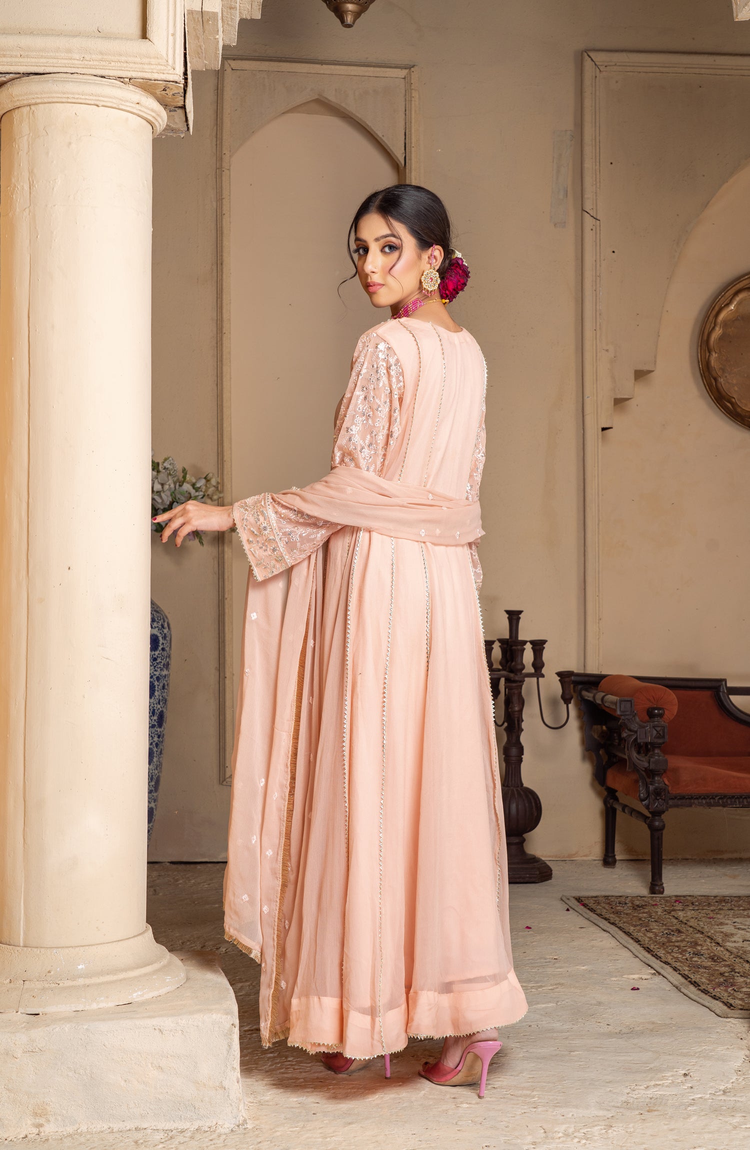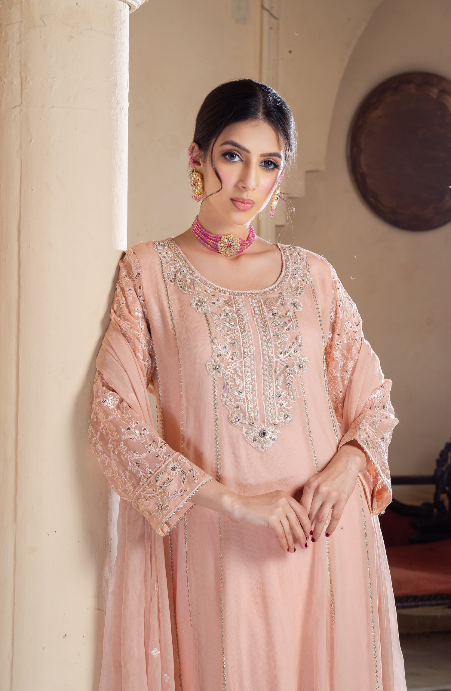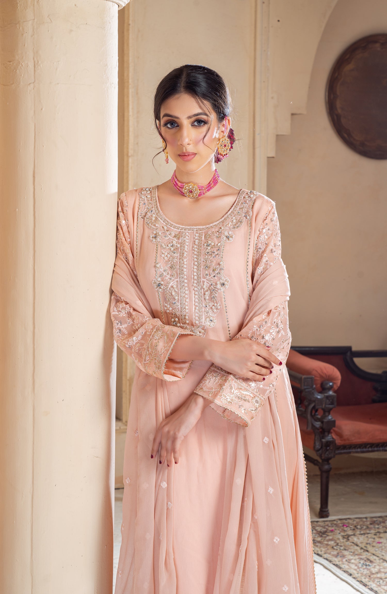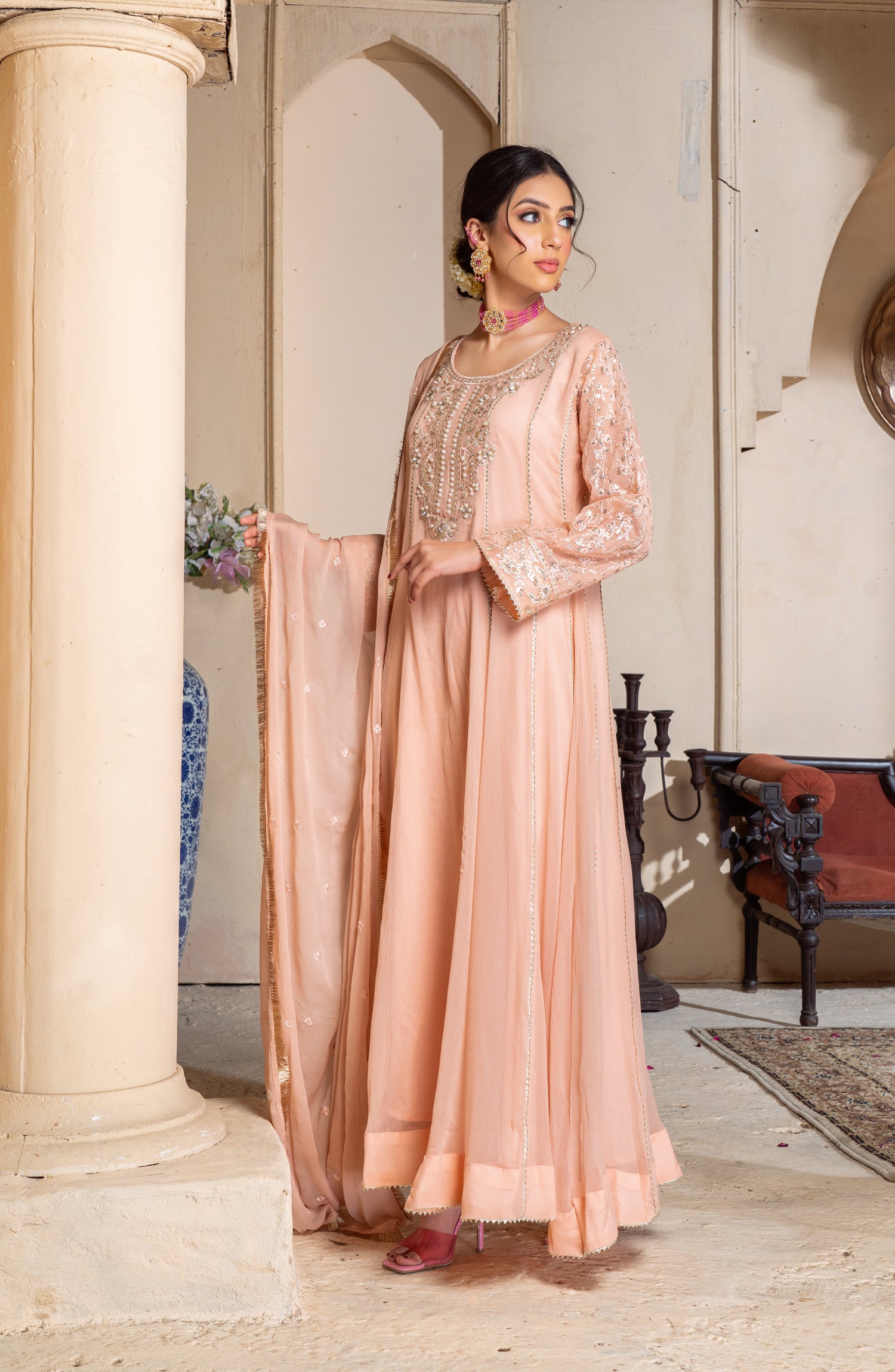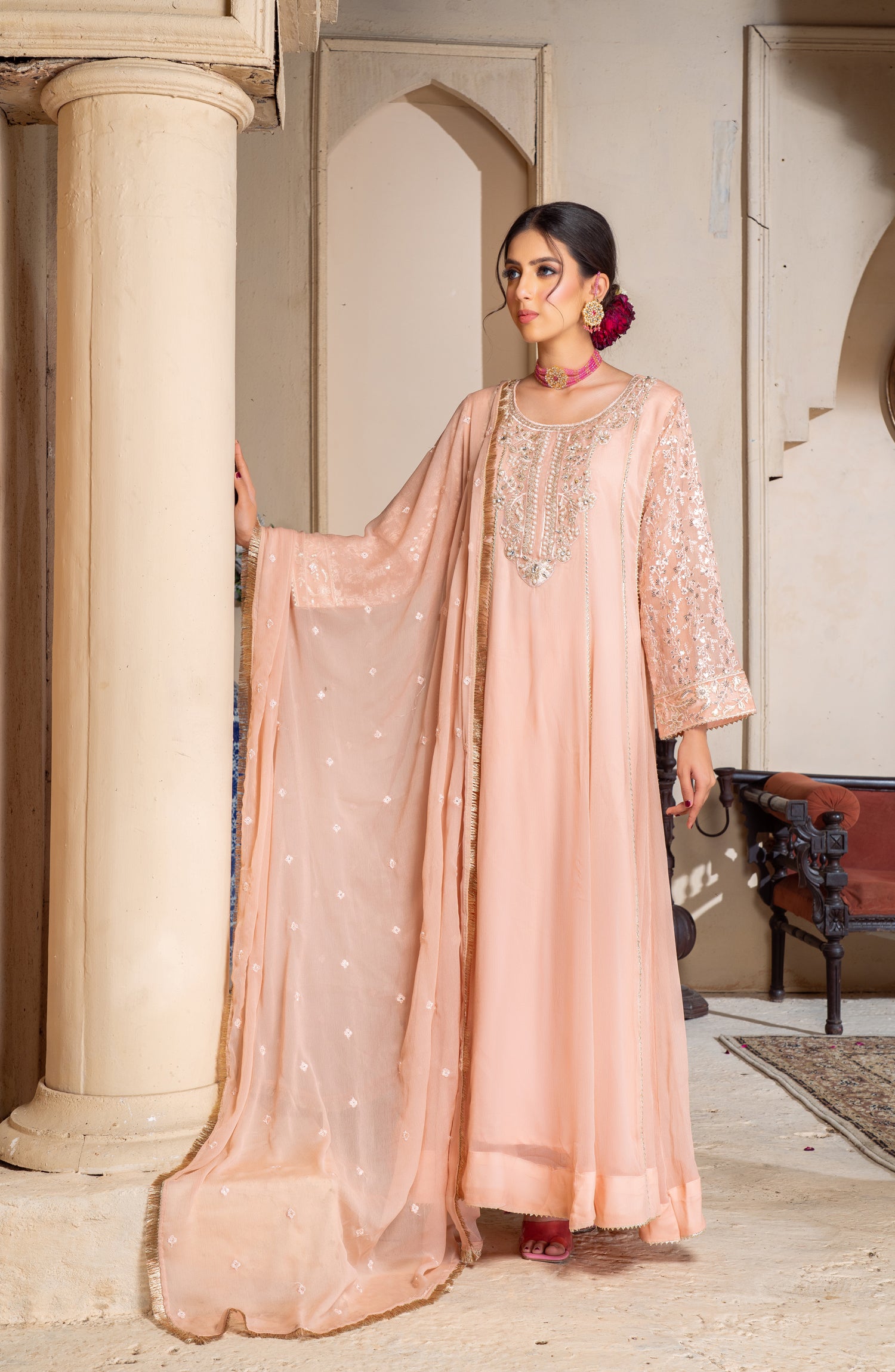 This elegant long chiffon frock is designed for a graceful and sophisticated look. Made from lightweight embroidered chiffon, it offers a flowy and ethereal feel. The neckline is adorned with intricate zardozi and pearl work, adding a touch of luxury and elegance. The panels of the frock feature delicate samosa lace, enhancing the overall structure with a refined finish. The inner layer is made of duplicate chiffon, ensuring comfort while maintaining the sheer beauty of the fabric. Paired with a crape trouser, this outfit balances tradition and modernity, making it perfect for formal gatherings, weddings, and festive occasions.