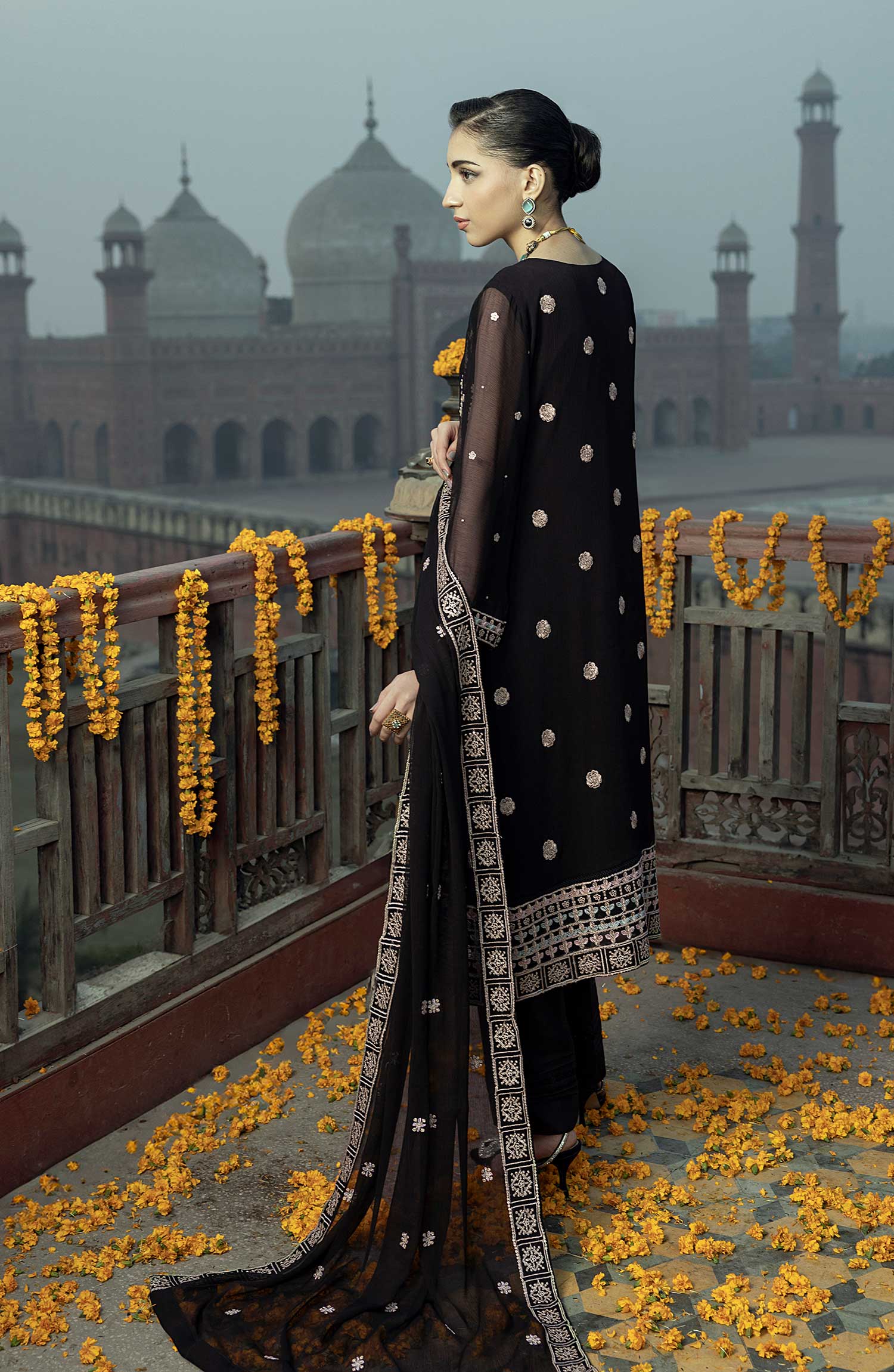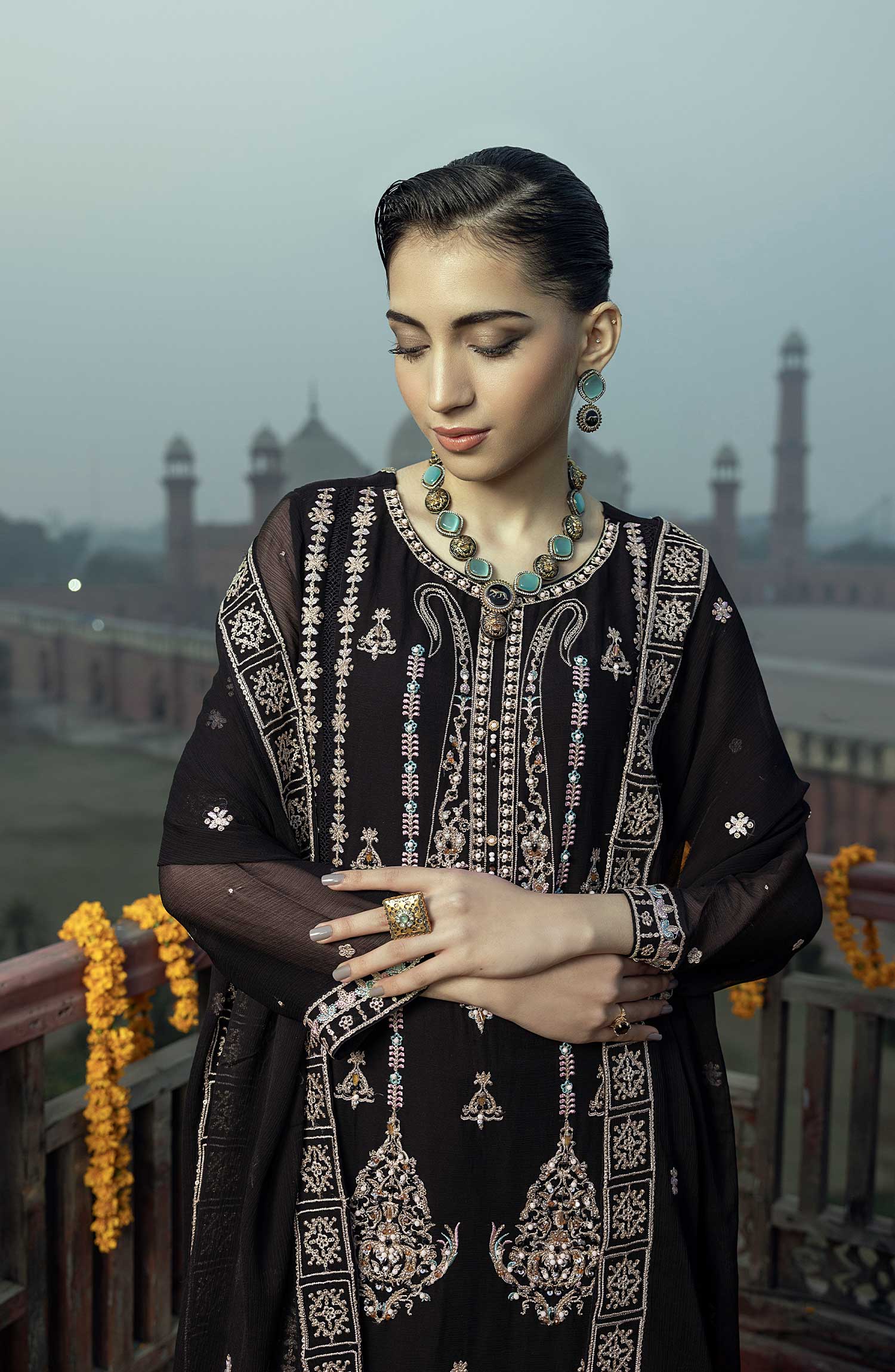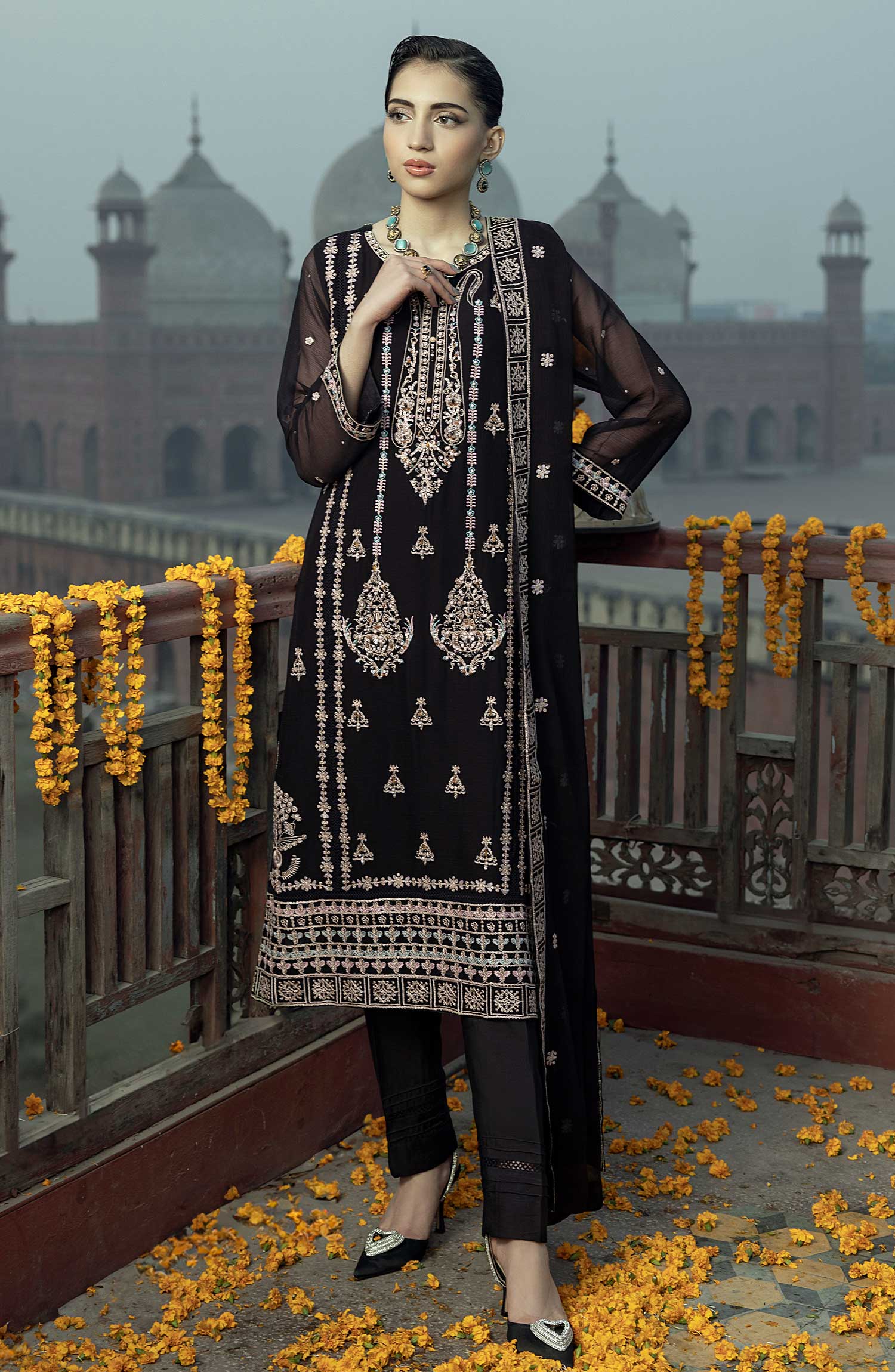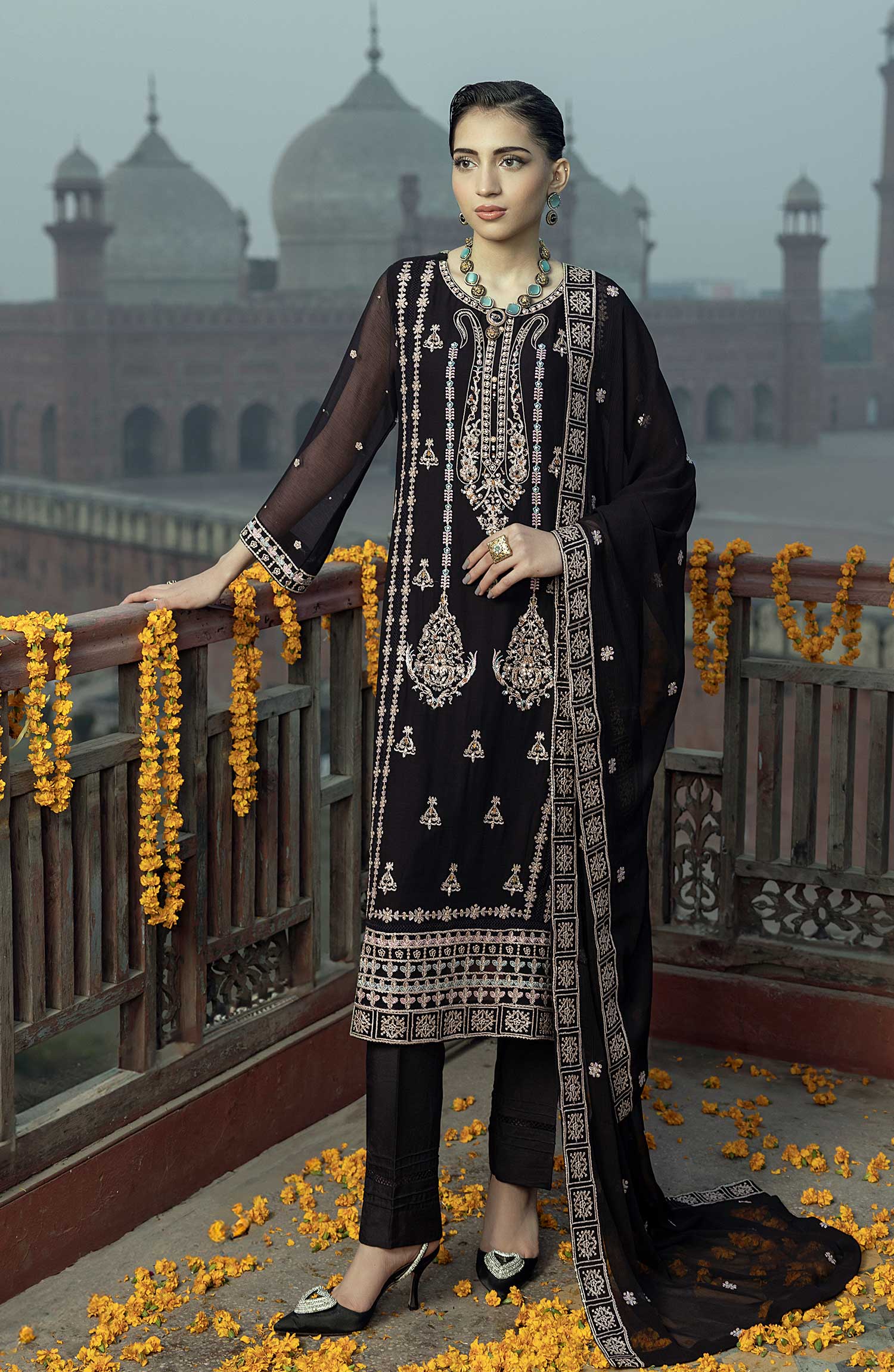 Shamooz Luxury Stitched Chiffon Collection has been styled in the image for photography and illustrative purposes.