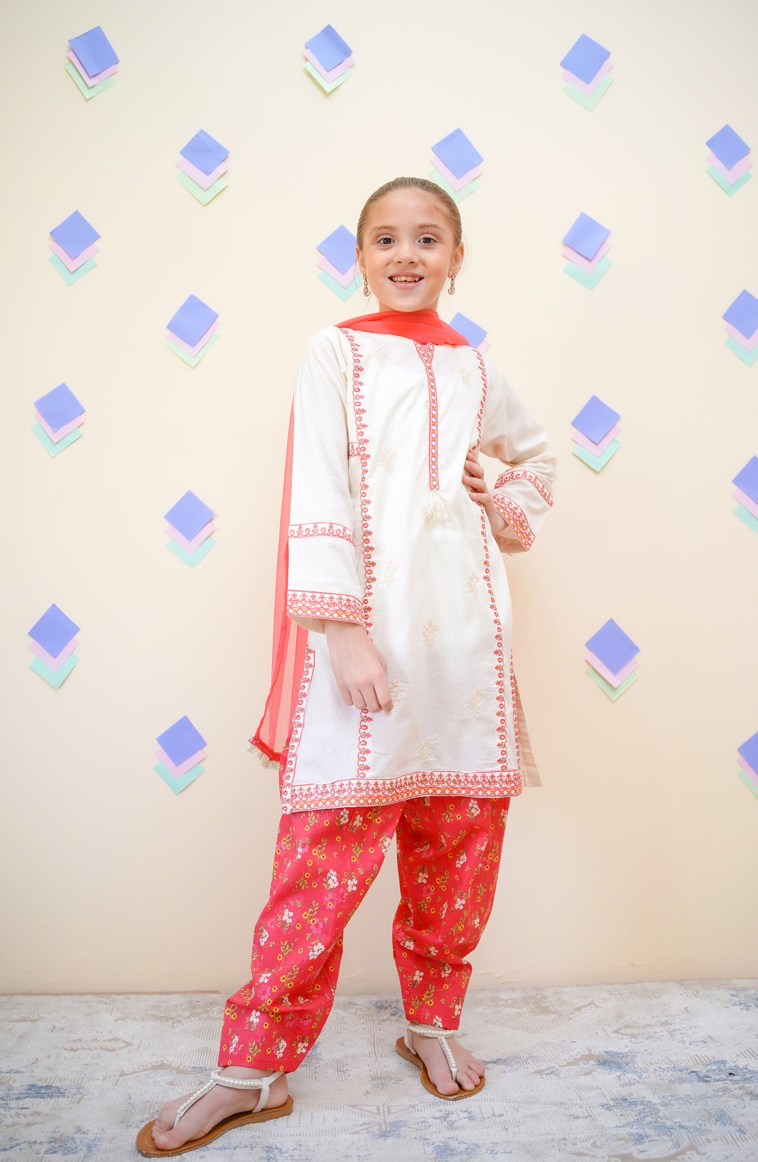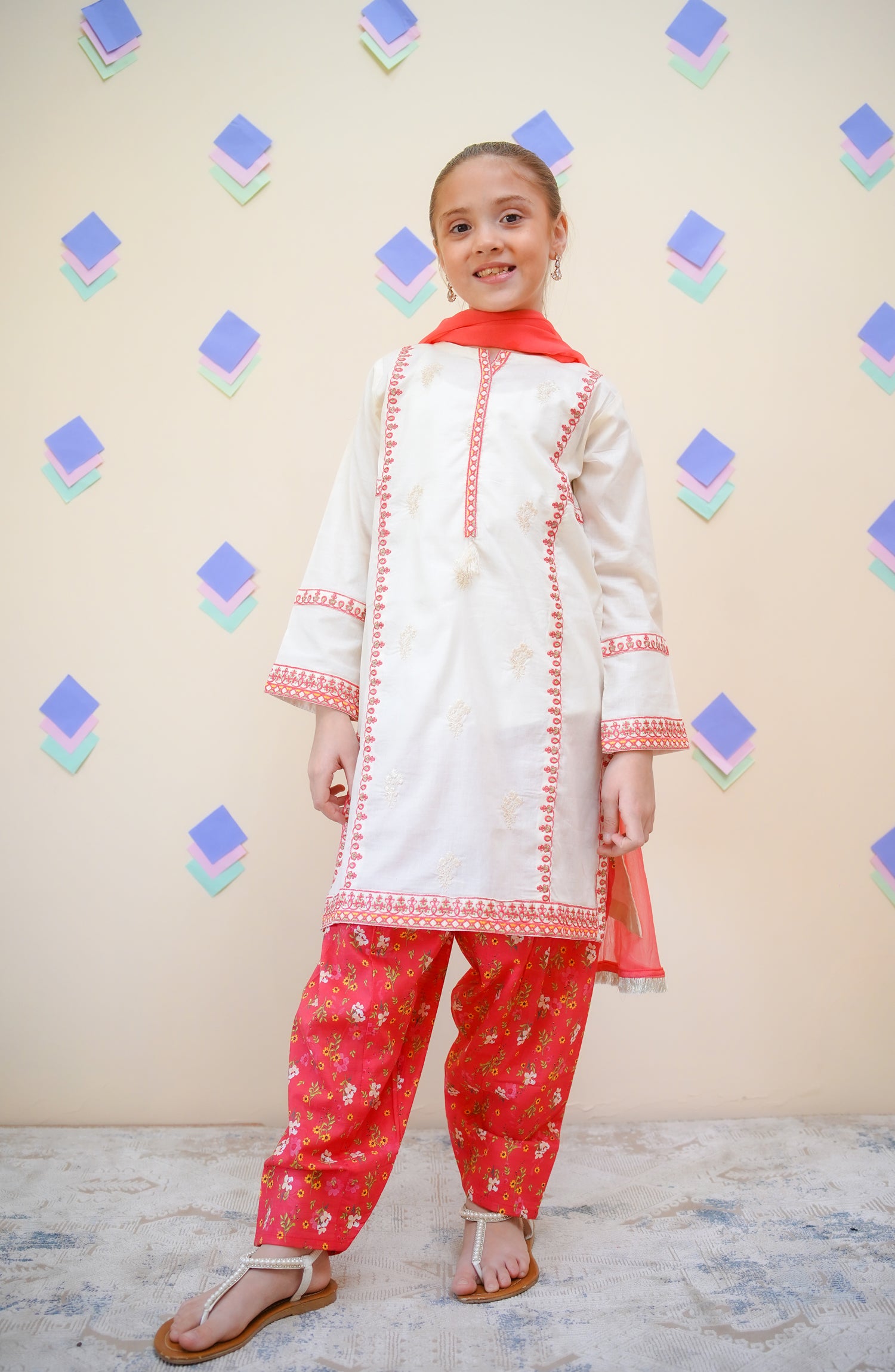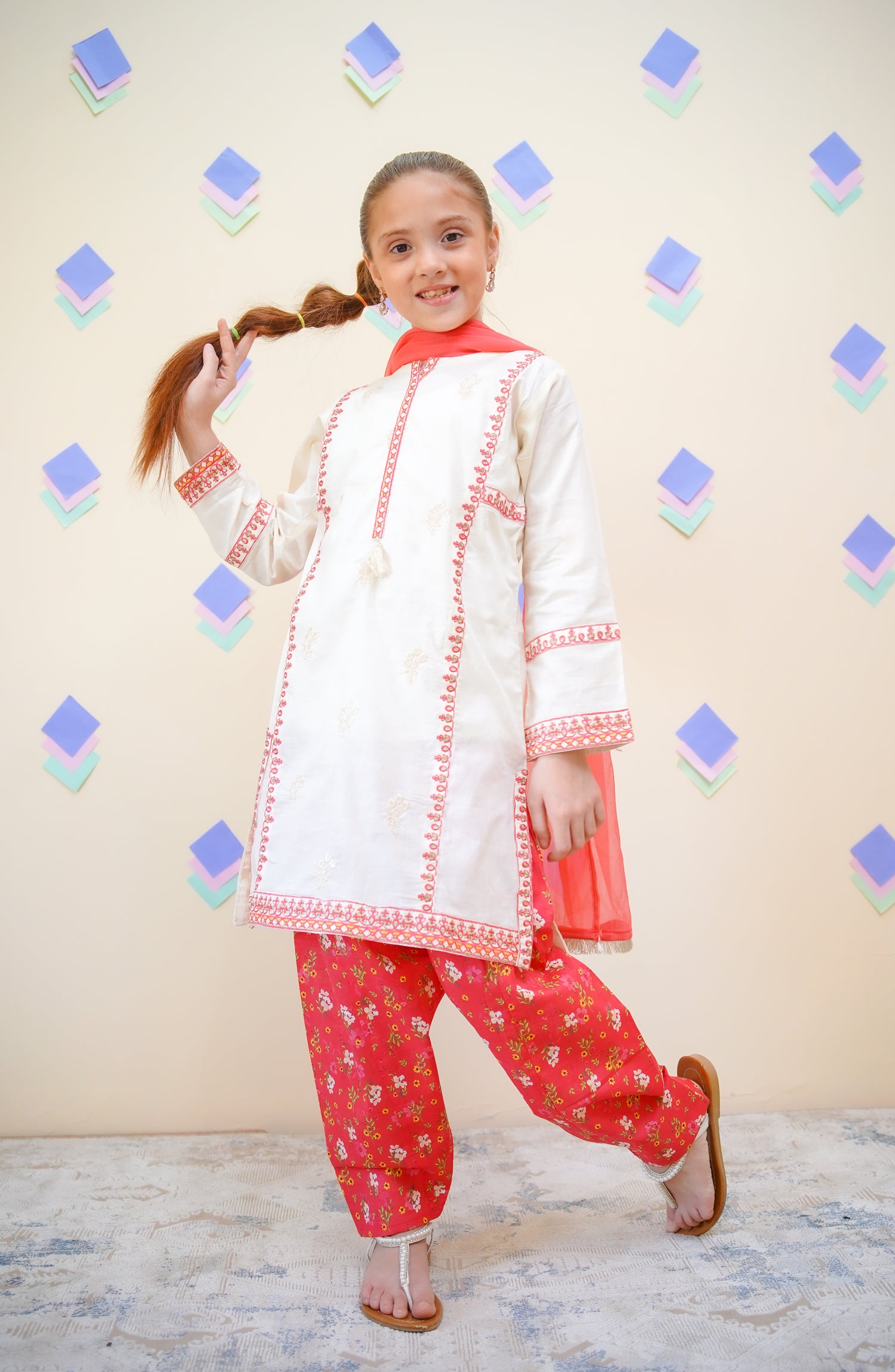 Embroidered & Embellished 3 Pc Suit with Digital Printed Farshi Shalwar and Chiffon Dupatta
