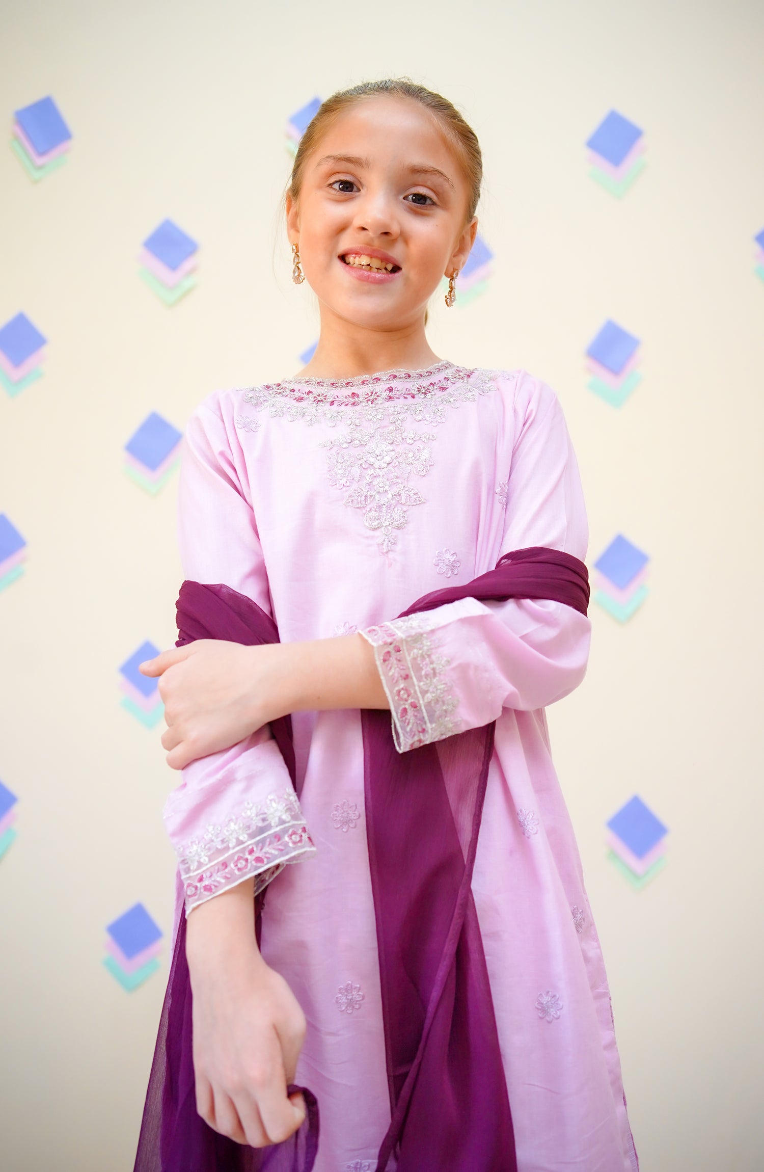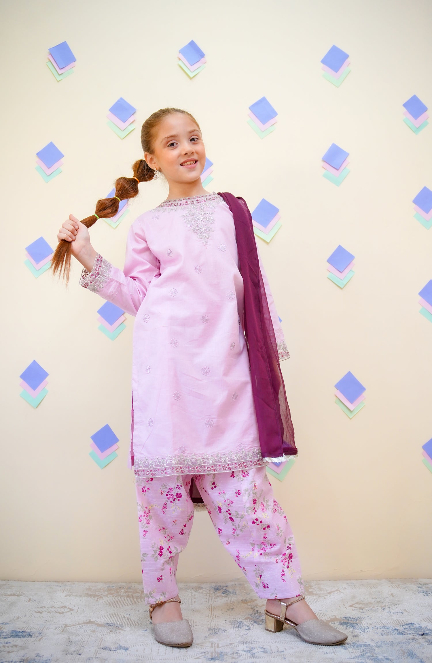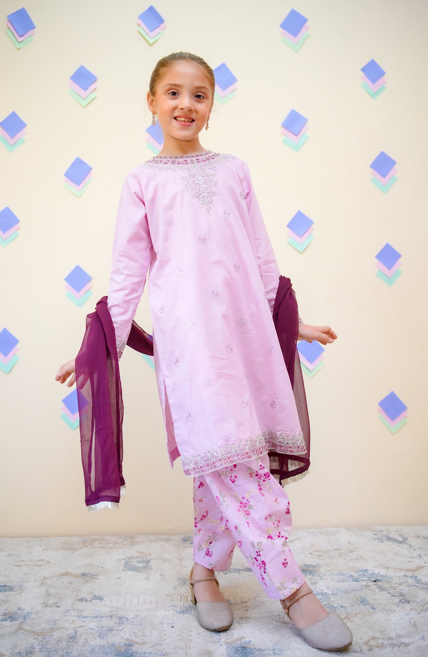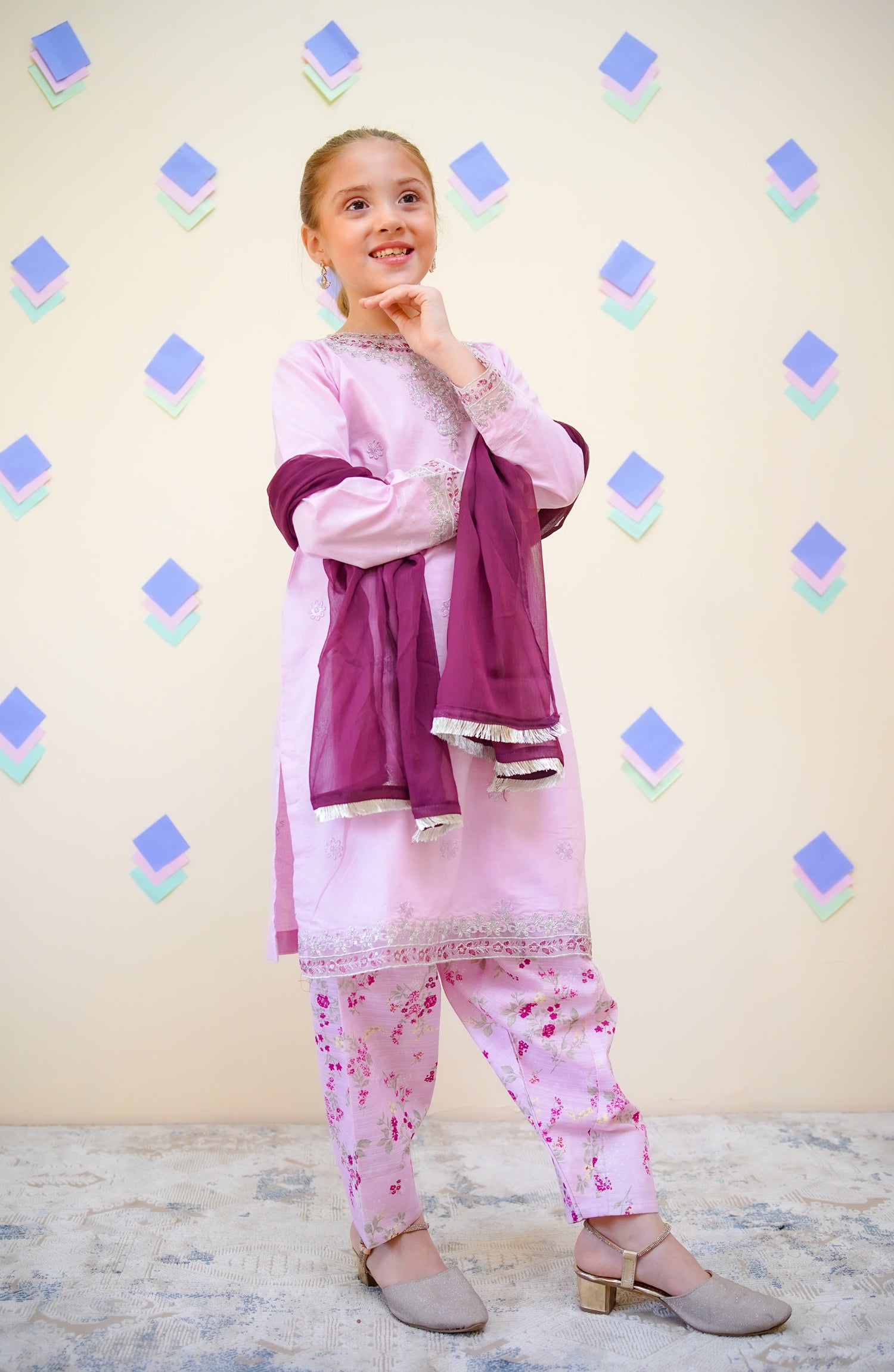 Embroidered & Embellished 3 Pc Suit with Digital Printed Farshi Shalwar and Chiffon Dupatta