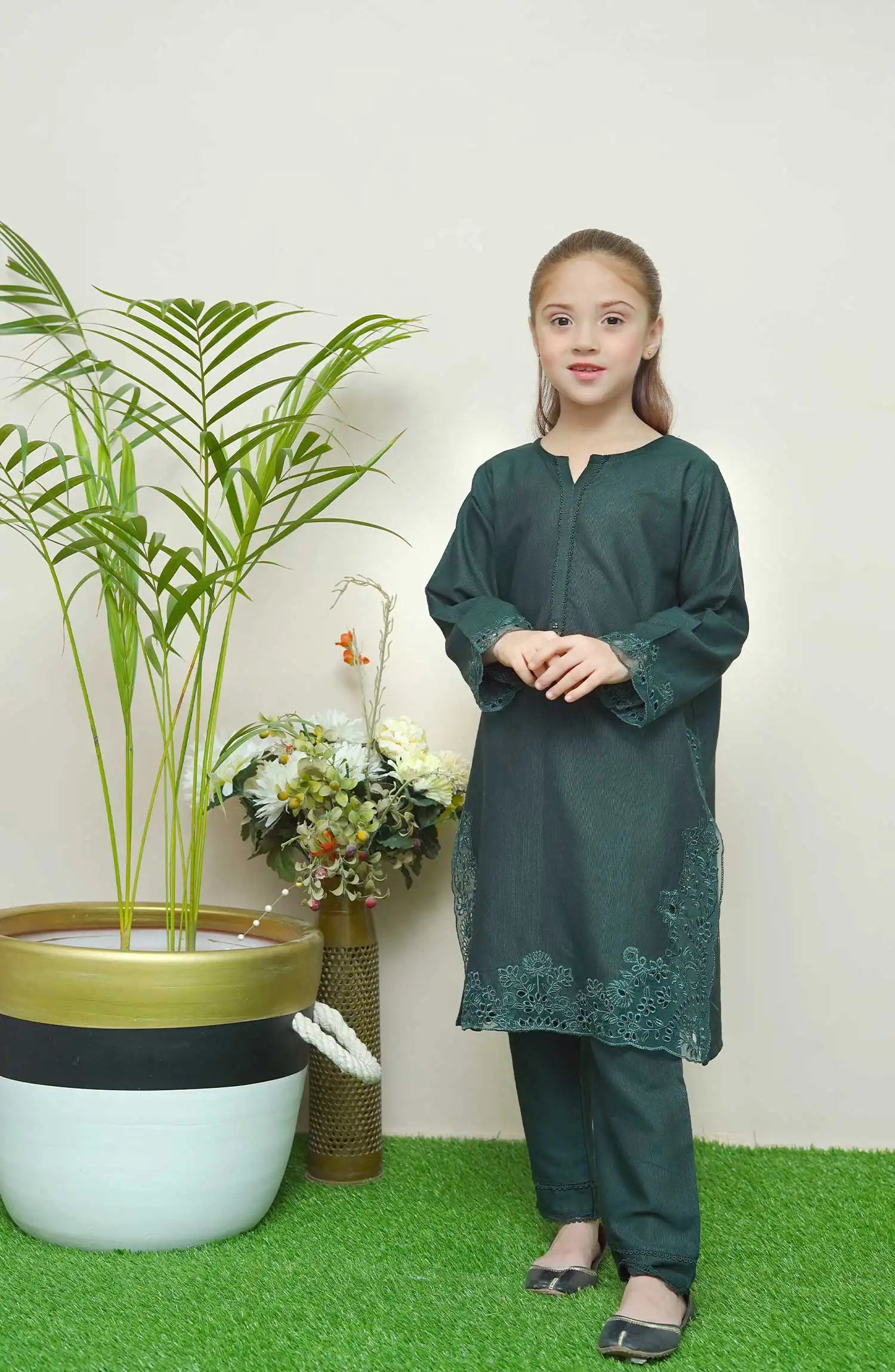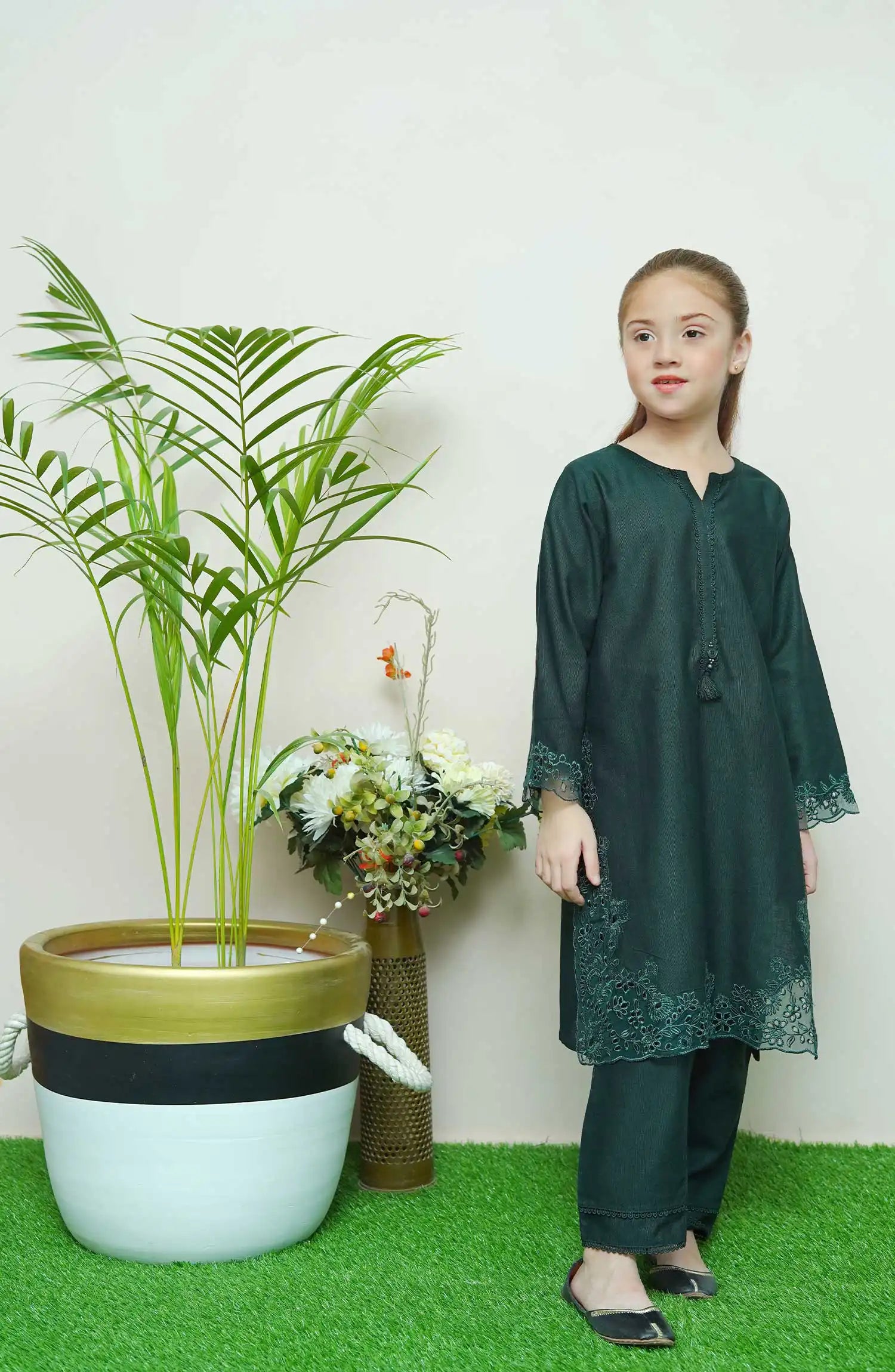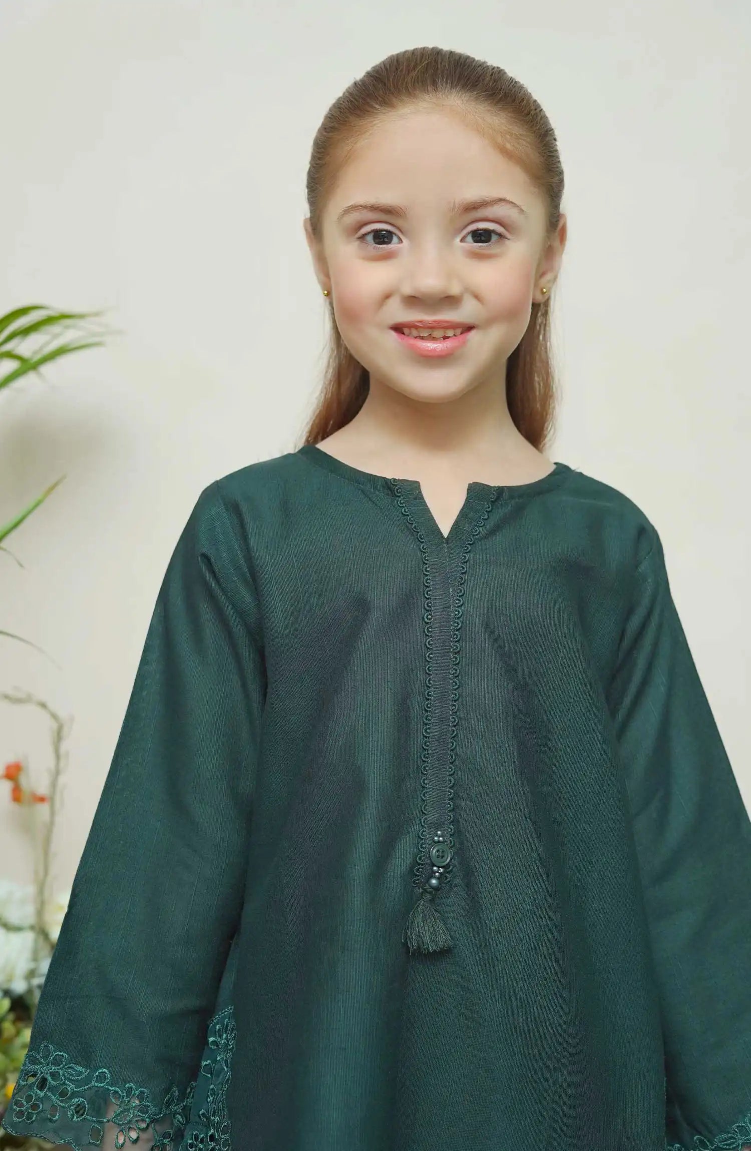 Girls | Green Dresses | Green Khaddar Dresses | Kids | Shanzey | Shanzey Whimsical Winters Embroidered Khaddar Collection | Winter Wear