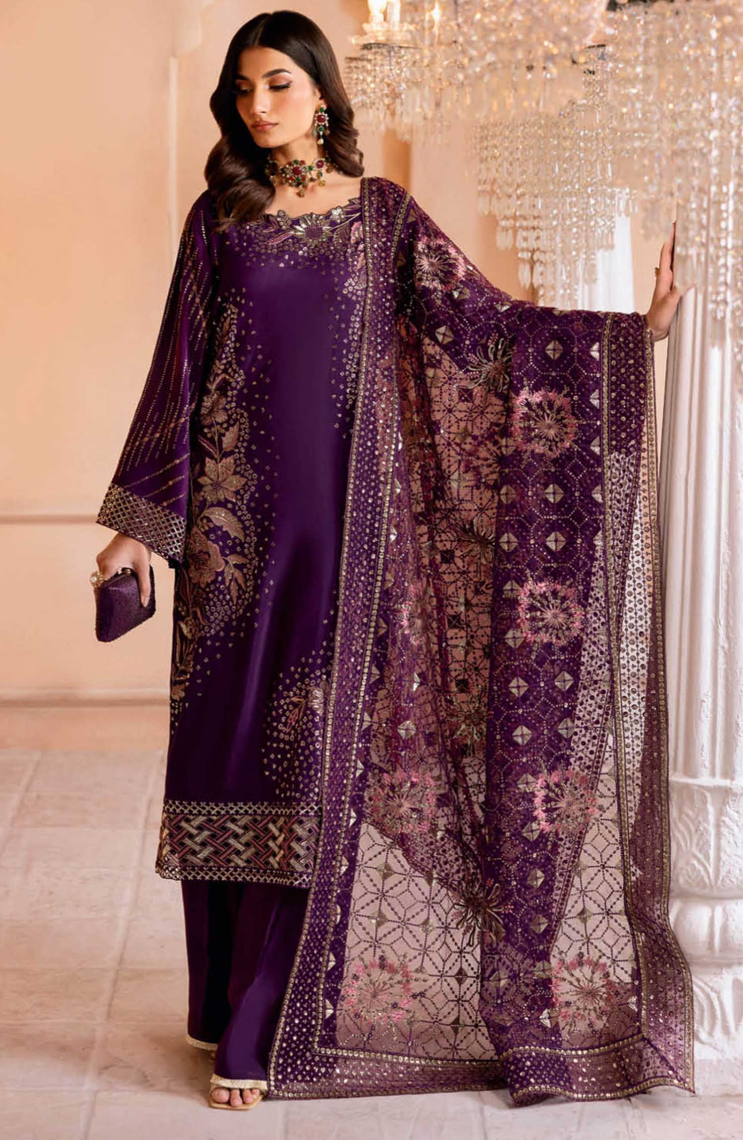 The standard style comes as a long-sleeved kameez with dupatta and trouser/shawlar.