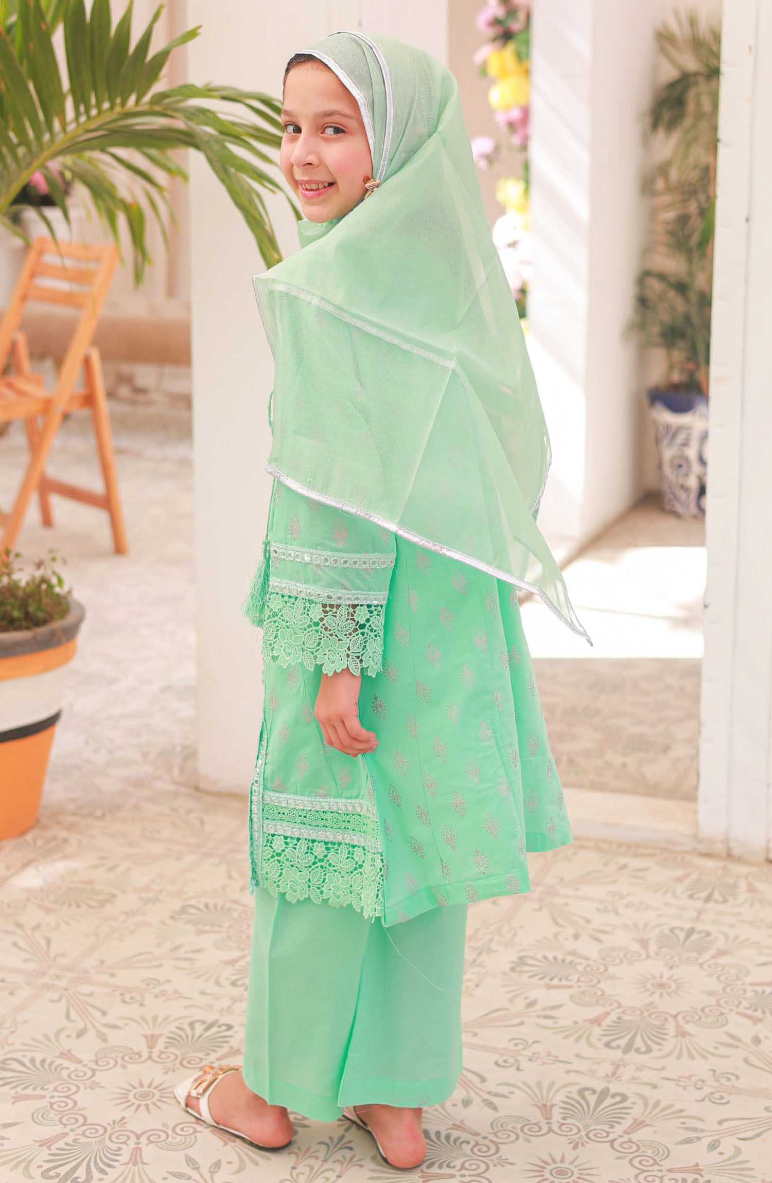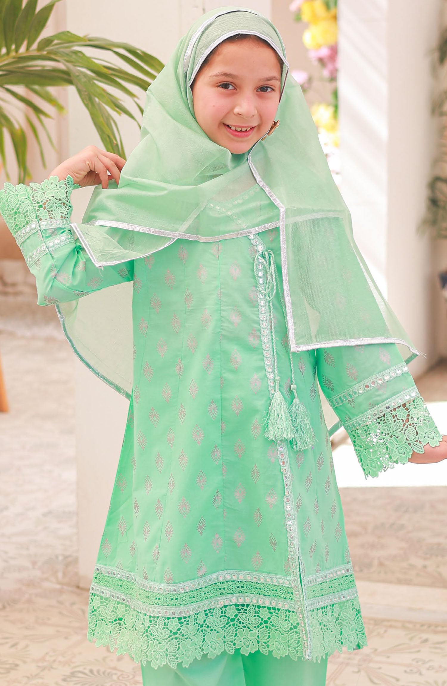 Daily Wear | Embroidered Pret | Girls | Green Dresses | Kids | New Arrival | Shifa by Suntex RTW Lace kaari Girls Collection 2025 | Suntex Fabrics | Suntex Fabrics Embroidered Collection | Trending