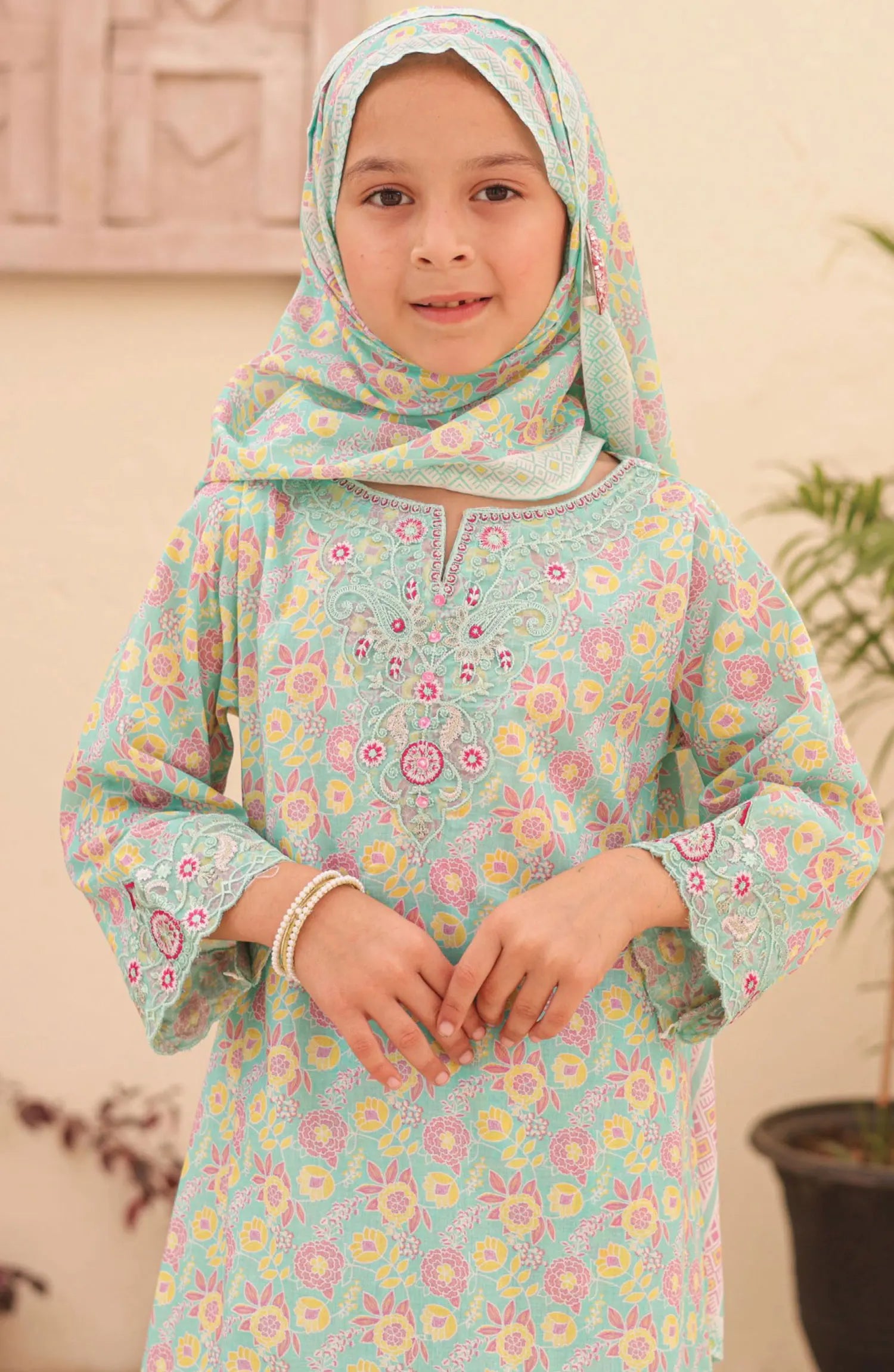 Shifa Kids Embroidered Lawn Stitched Collection Vol 04 has been styled in the image for photography and illustrative purposes.