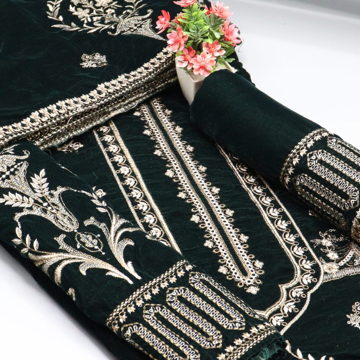 Exclusive Embroidered 3 piece unstitched velvet suit.