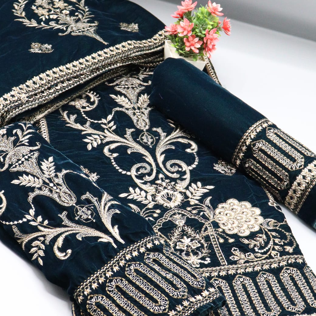 Exclusive Embroidered 3 piece unstitched velvet suit.