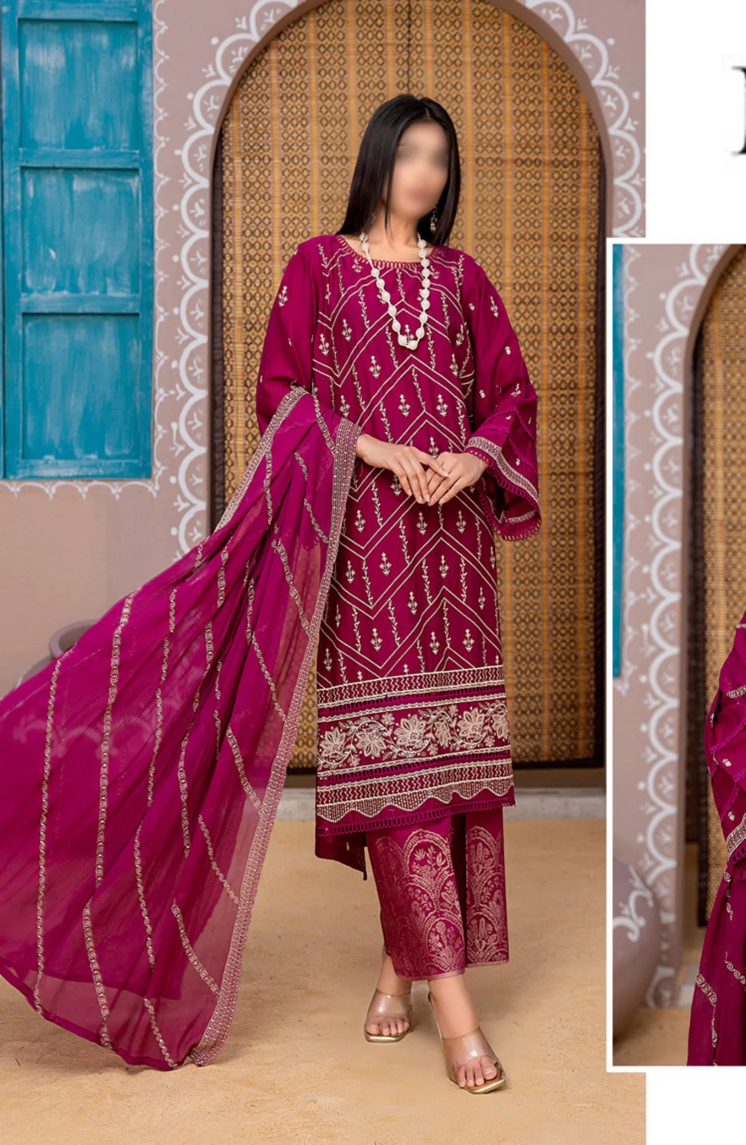 3 Piece Luxury fancy lawn embroidered suit with chiffon embroidered dupatta