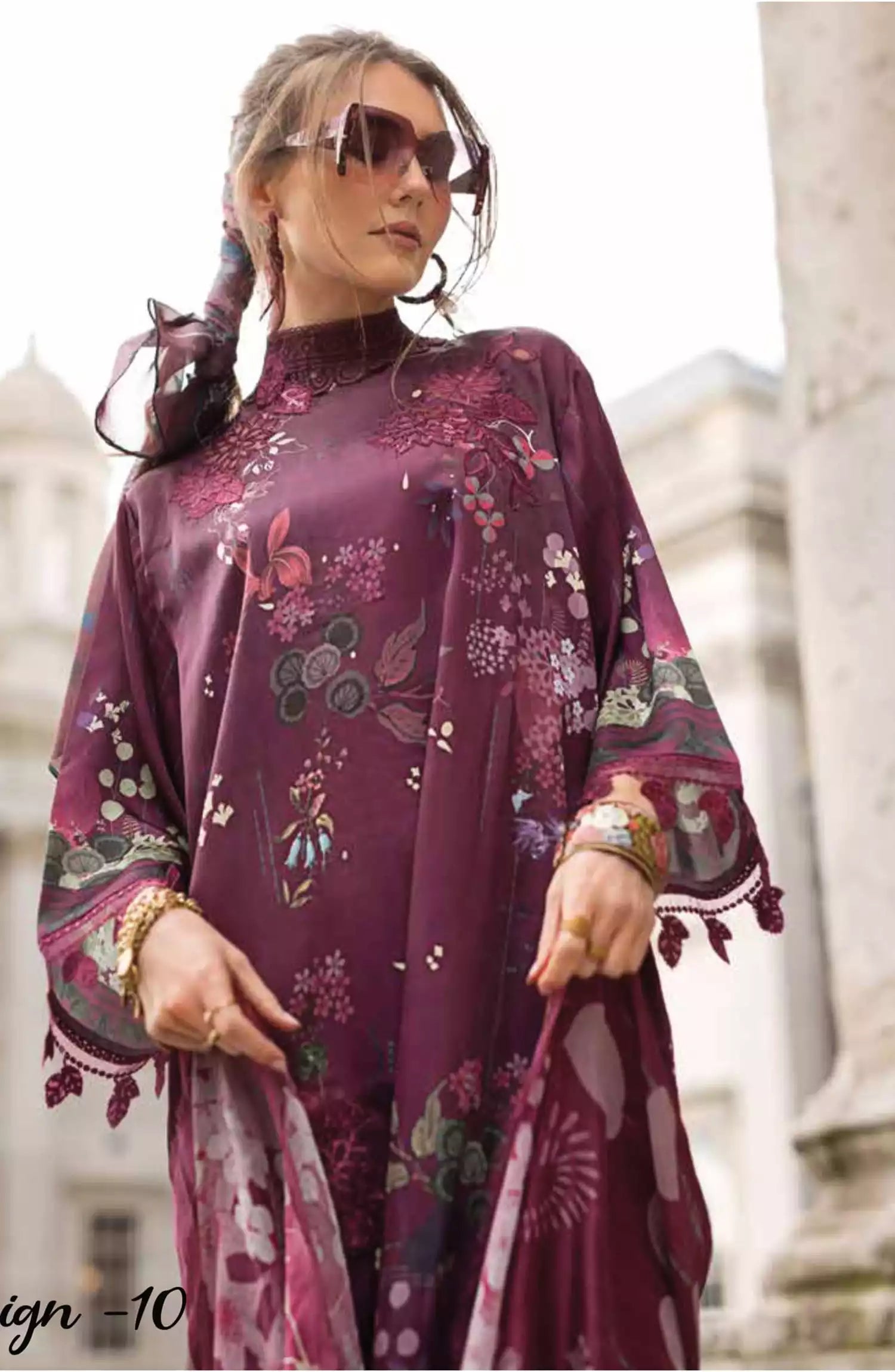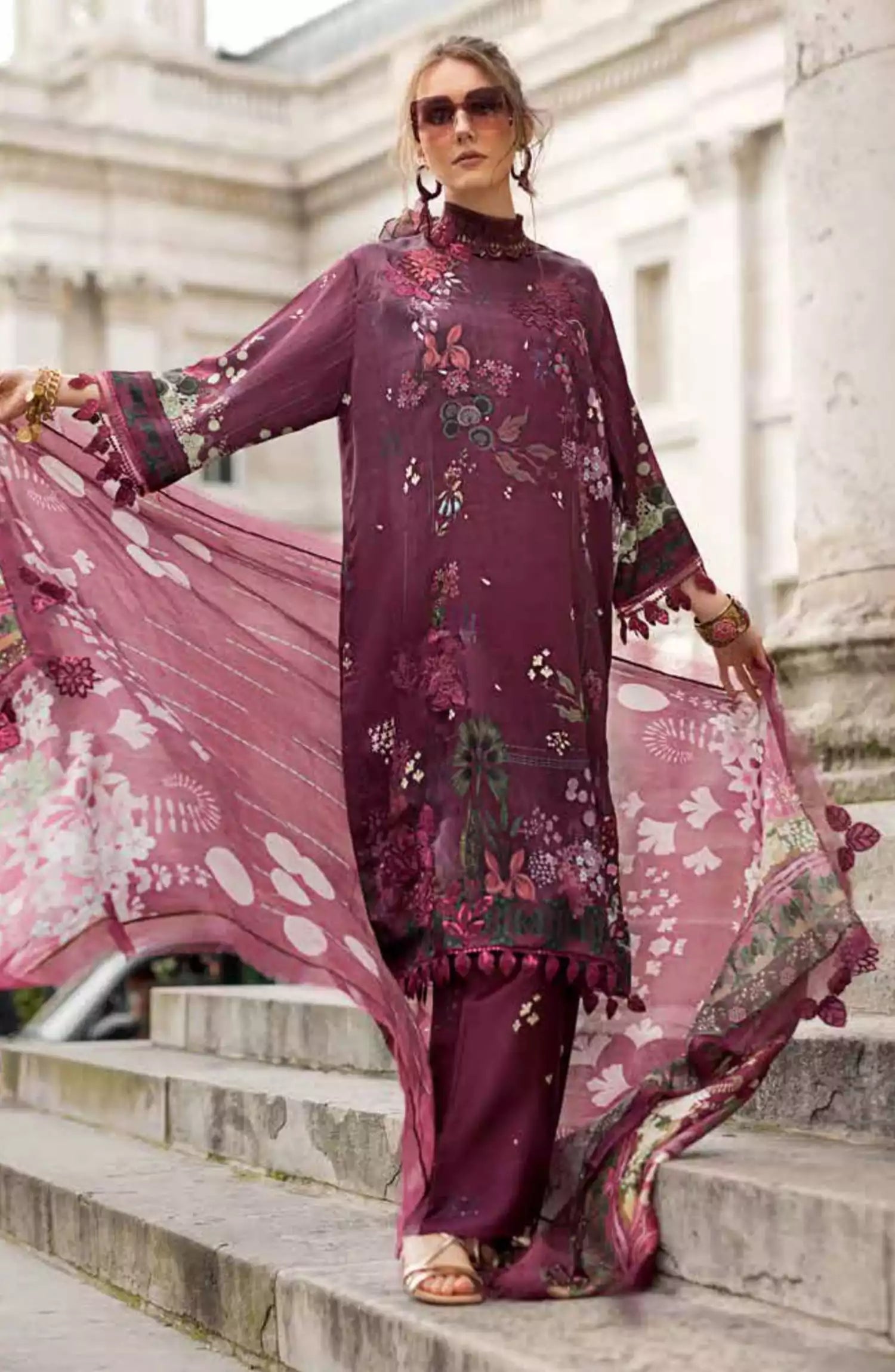 Sobia Nazir Satin Unstitched Collection 2024 has been styled in the image for photography and illustrative purposes.