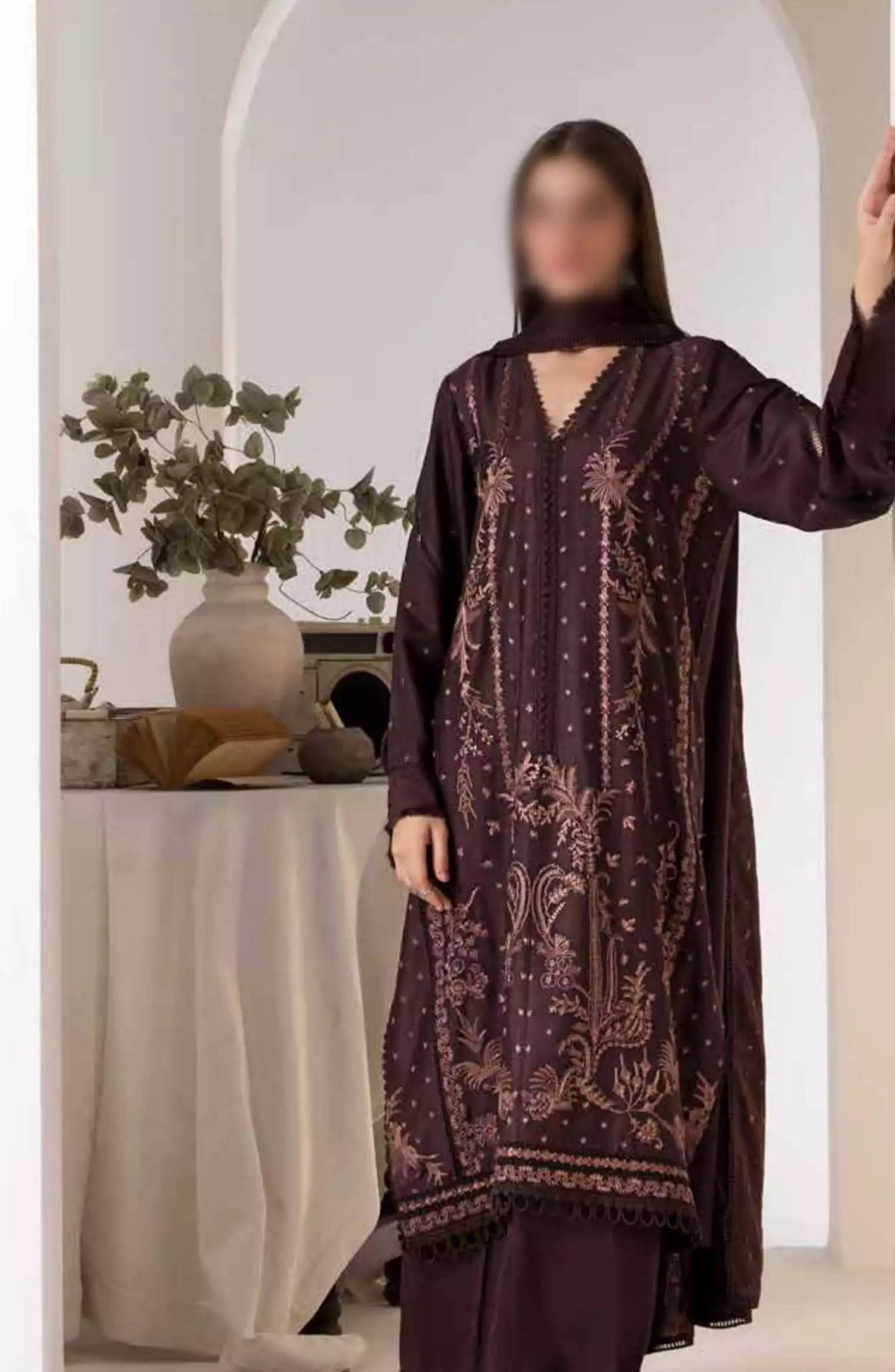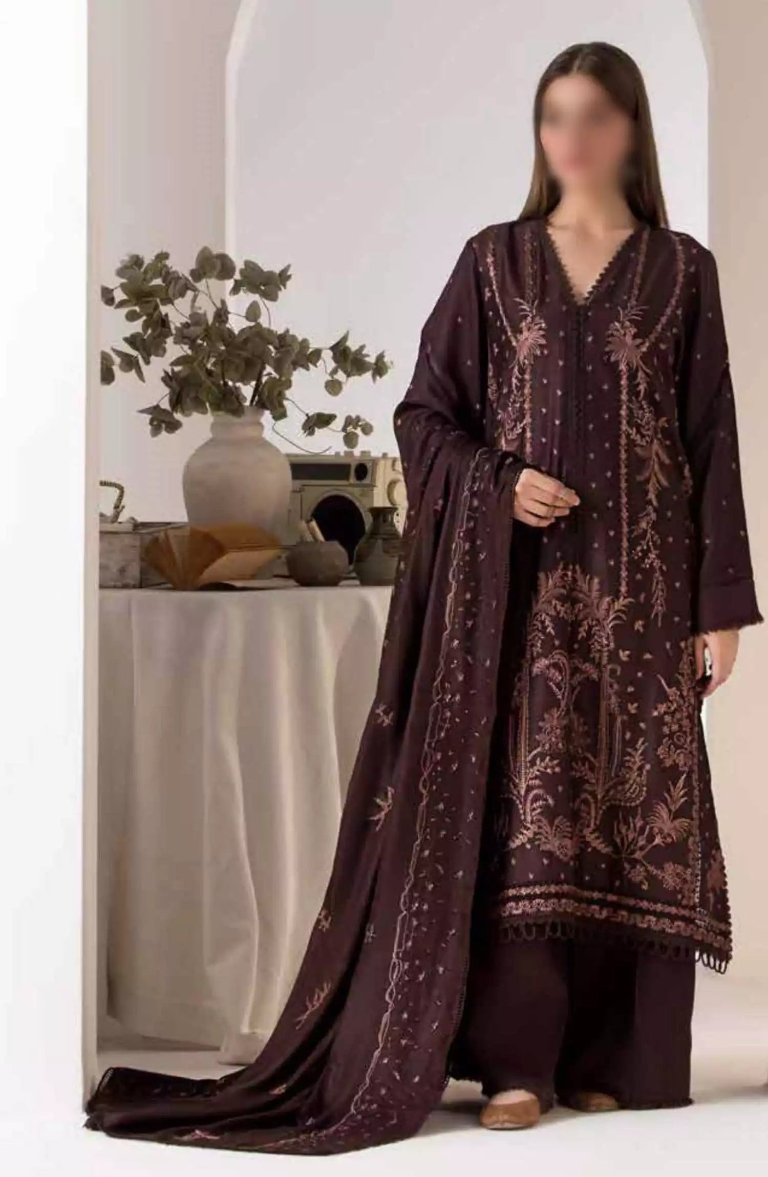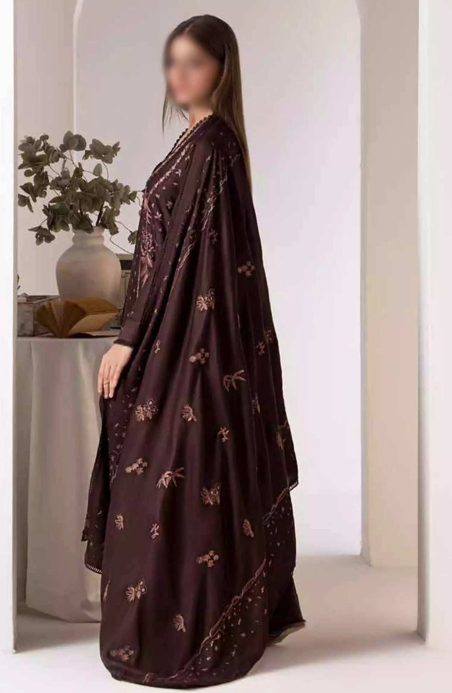 Sobia Nazir Winter Shawl Unstitched Collection 2024 has been styled in the image for photography and illustrative purposes.